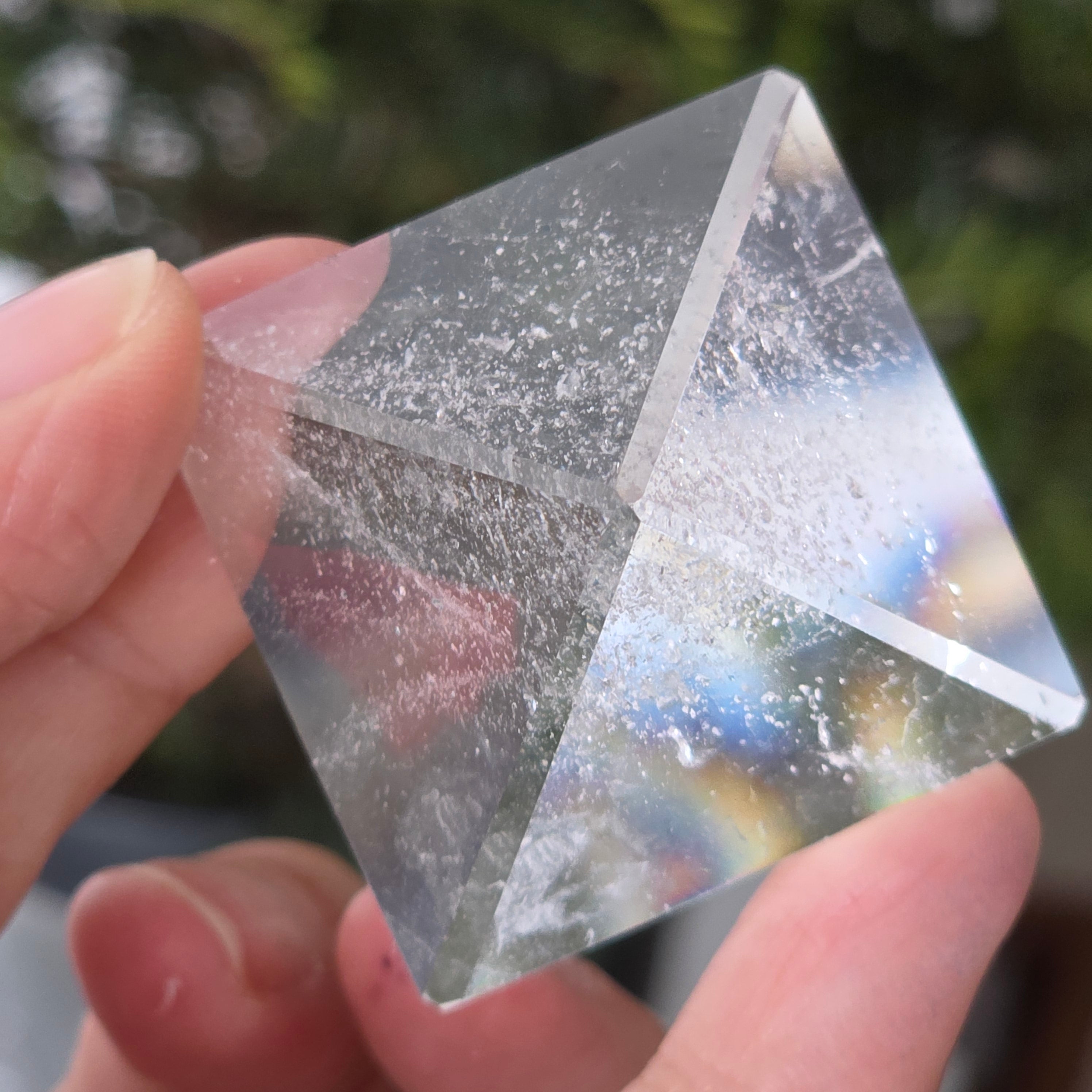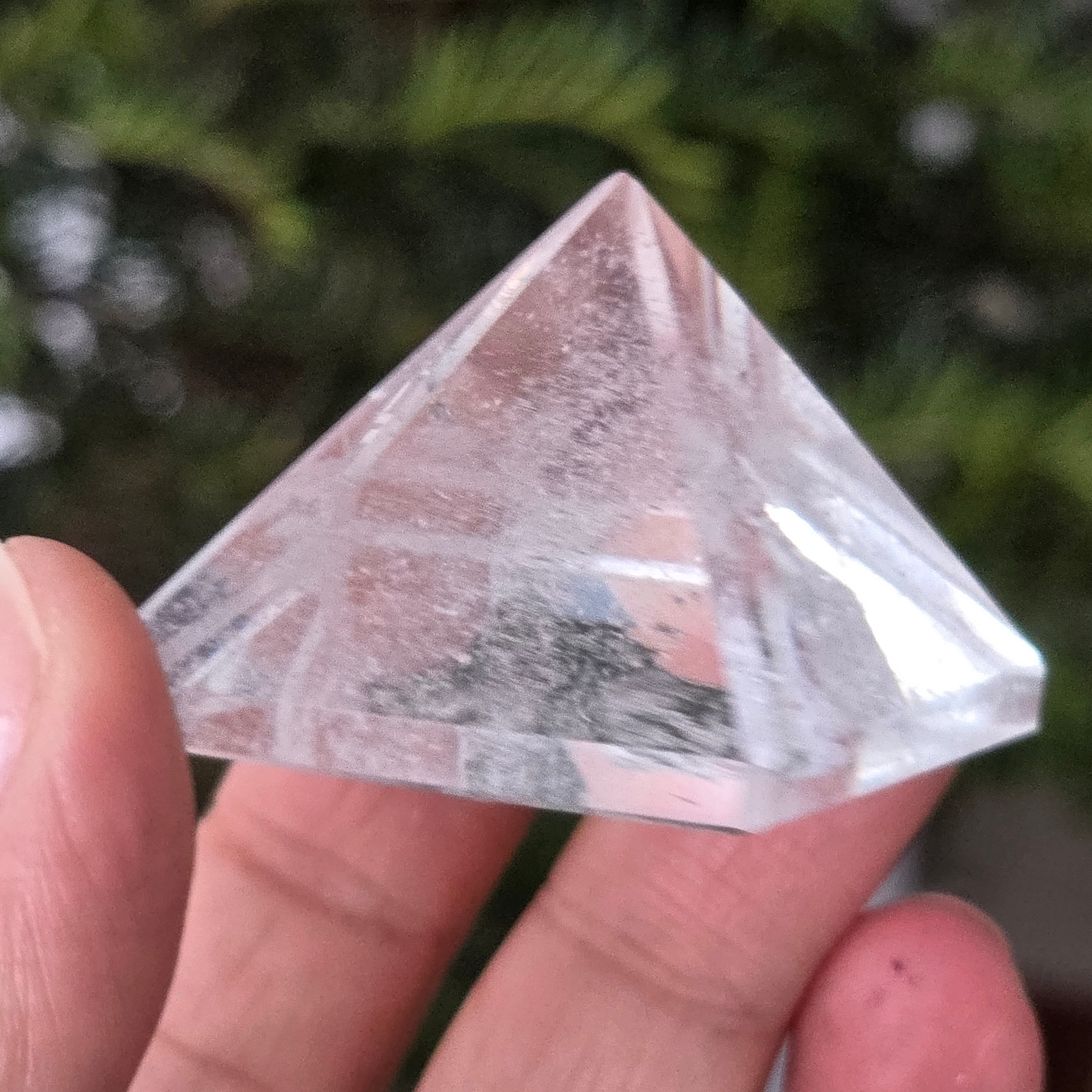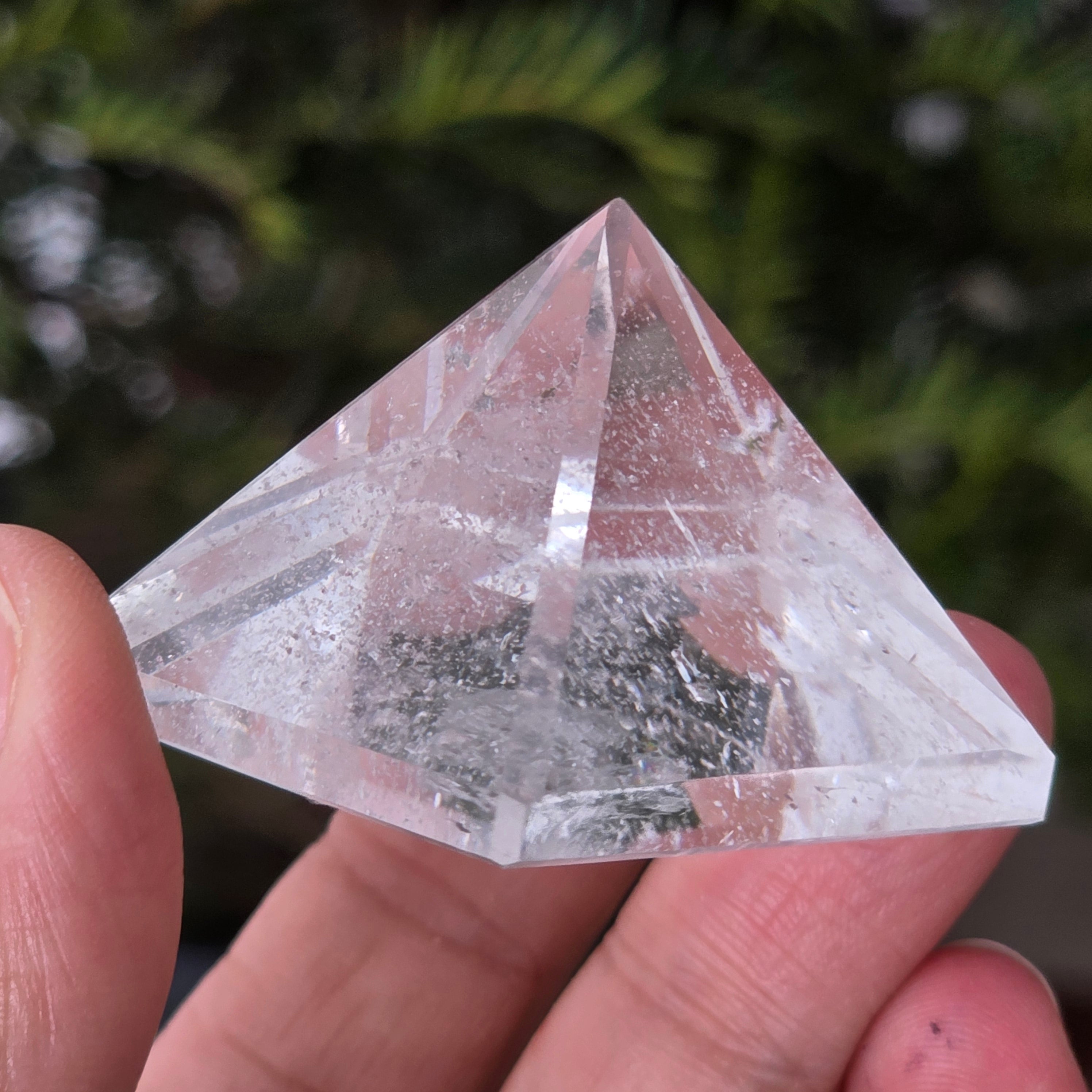 Die Pyramide aus farblosem Quarz wird mit Klarheit, Verstärkung der Absicht und energetischem Gleichgewicht in Verbindung gebracht, ihre Form bündelt und richtet die Energie auf eine geordnete Weise aus. Sie wird oft als Symbol für einen klaren Geist und die Harmonie zwischen Gedanken, Emotionen und Handlungen verwendet.