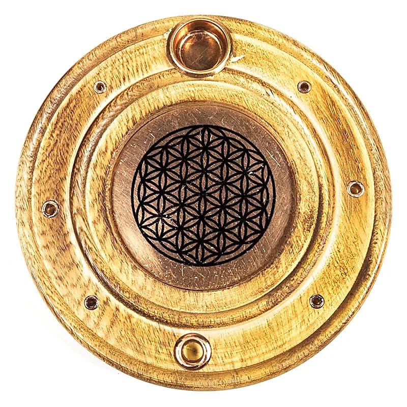 Dieser Räucherstäbchenhalter, hergestellt aus Mangoholz und verziert mit dem heiligen Symbol Blume des Lebens, ist sowohl ein praktischer Gegenstand als auch einer voller spiritueller Bedeutung.
