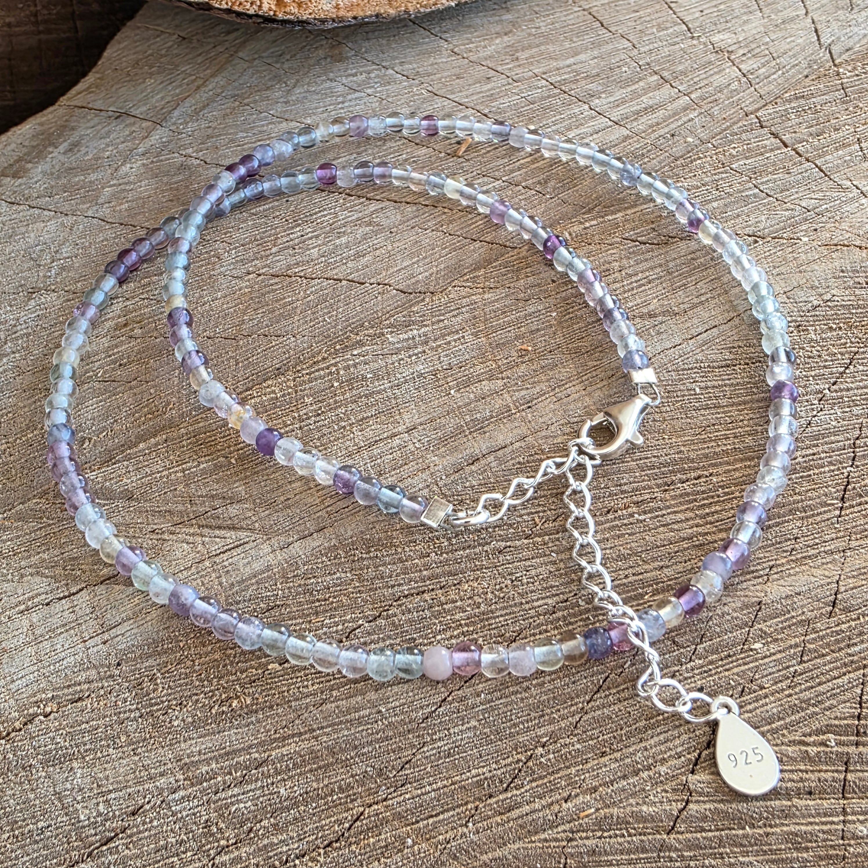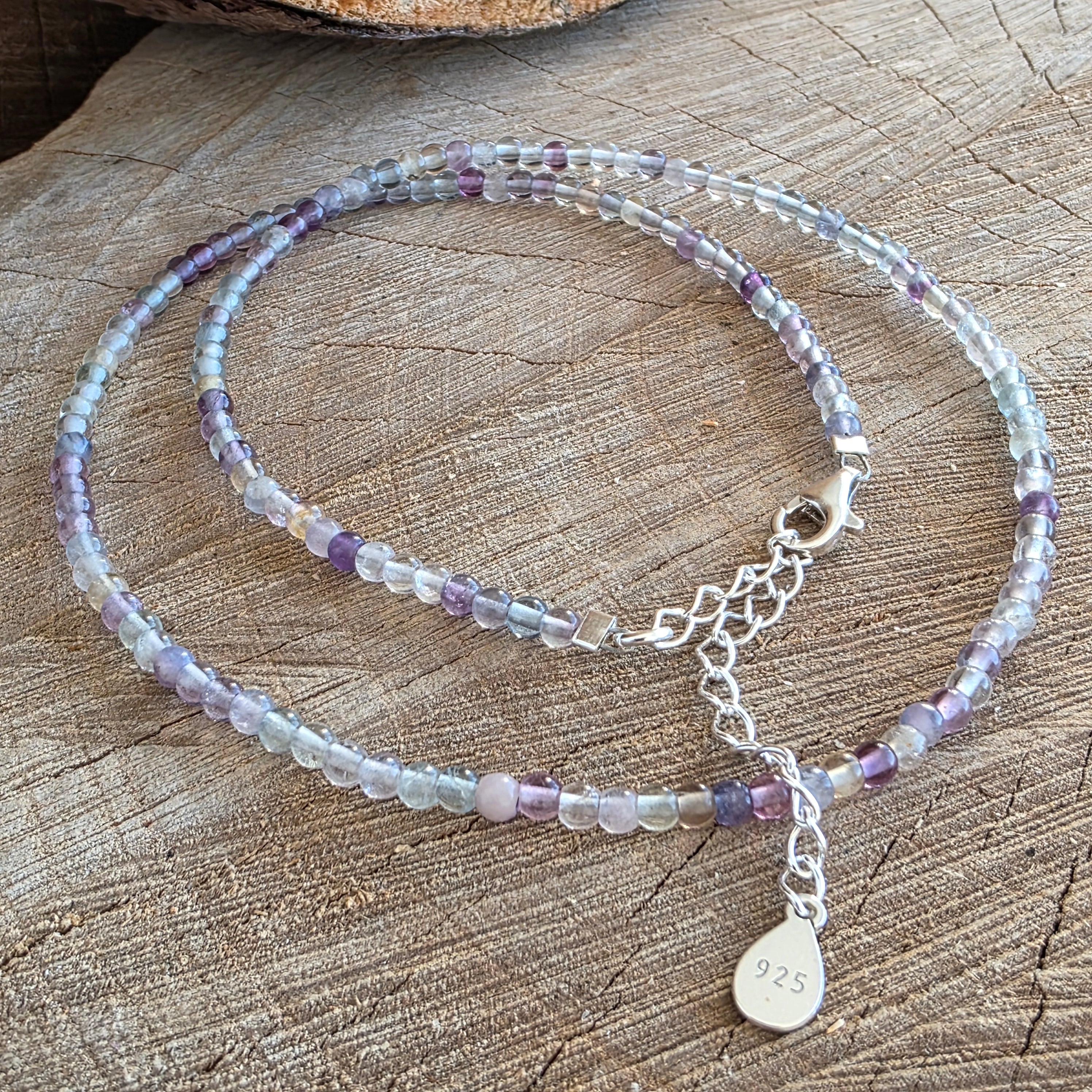 Eine Halskette wie ein Fenster zum Licht – lebendig, klar, verspielt und zugleich tiefgründig. Die facettierten 3-mm-Regenbogenfluoritperlen funkeln in Schattierungen, die zwischen Violett, Grün, Blau und Rosa tanzen, wie eine Brücke zwischen Emotion und Vernunft, zwischen Traum und Klarheit.