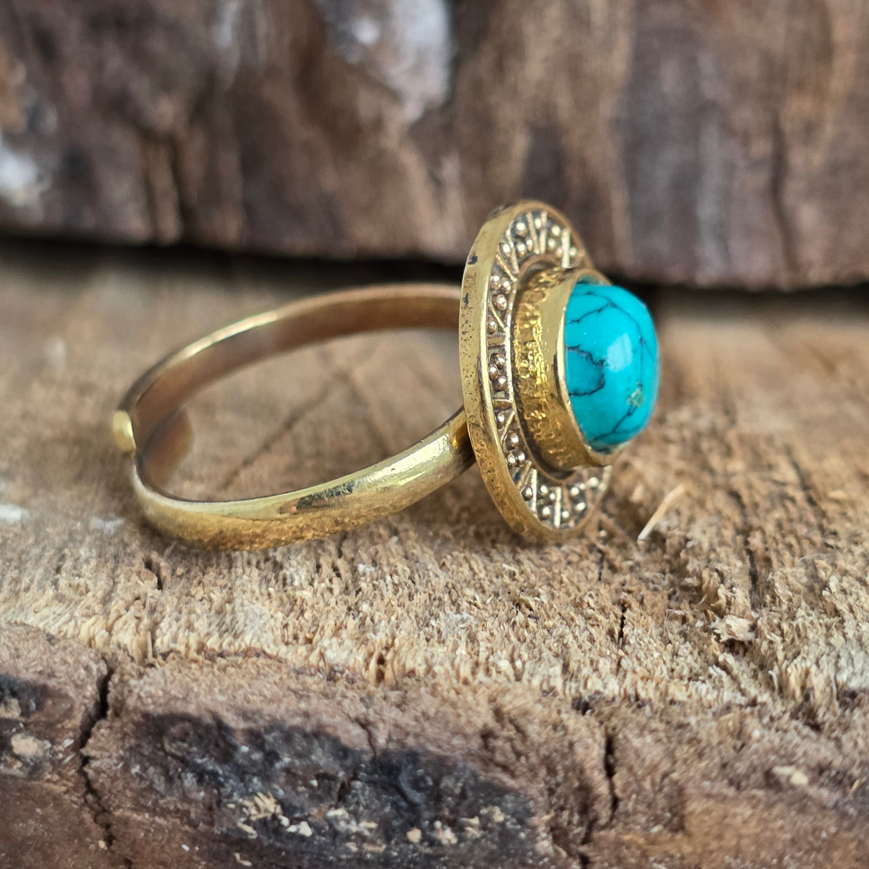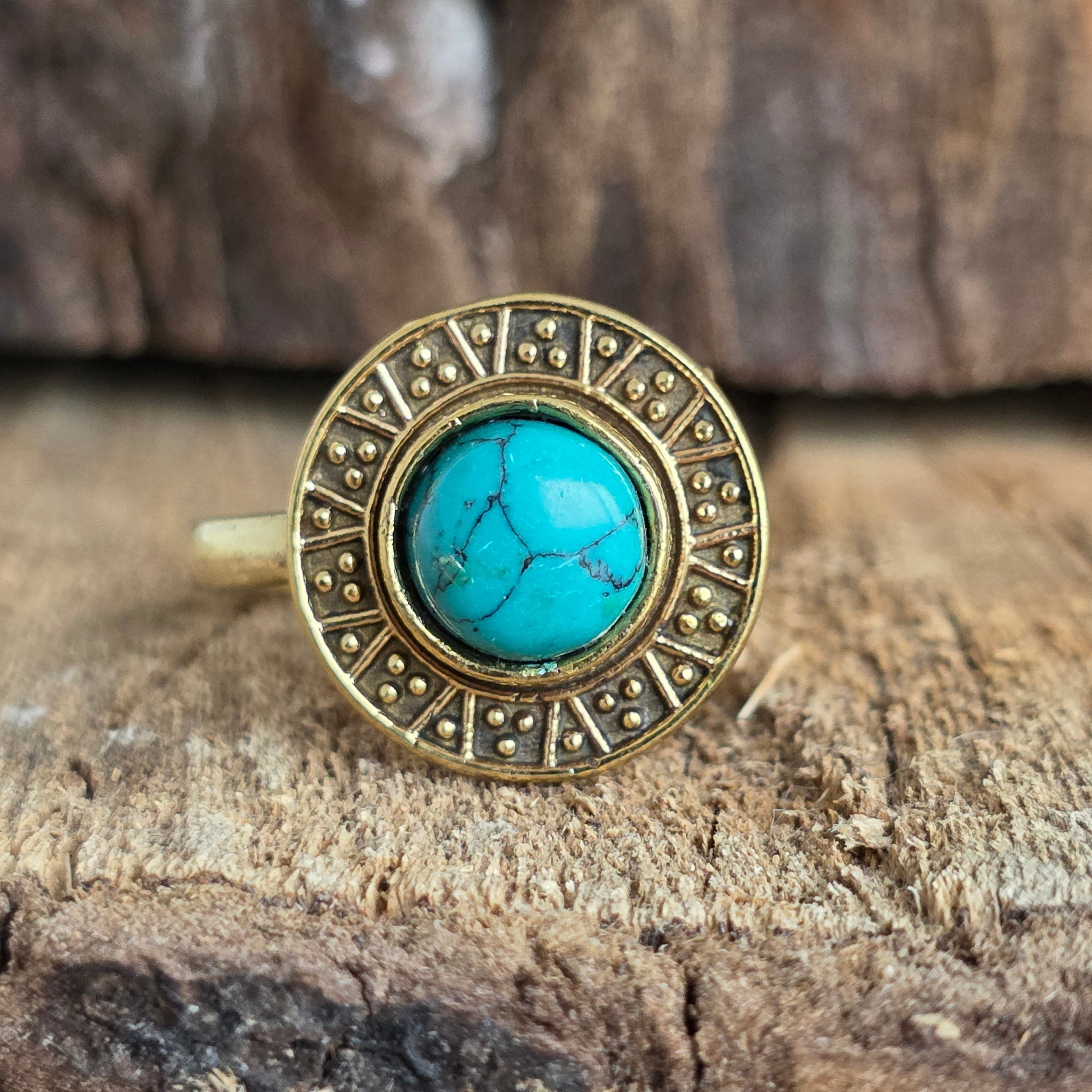 Ein Ring mit Persönlichkeit, inspiriert von traditioneller indischer Handwerkskunst Rawa-Arbeit, hergestellt aus Metalllegierung mit glänzender Bronzeoberfläche und mit a geadelt natürlicher türkisfarbener Stein.