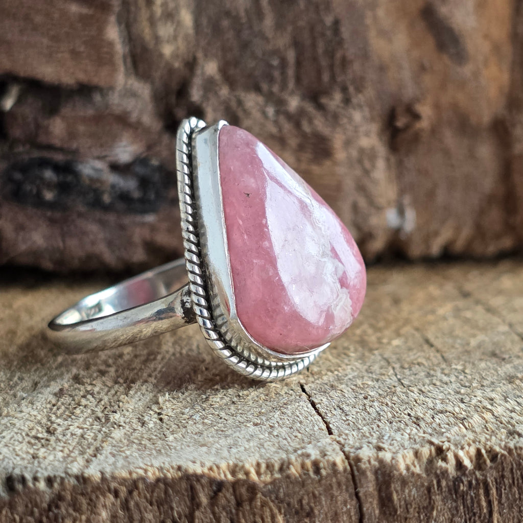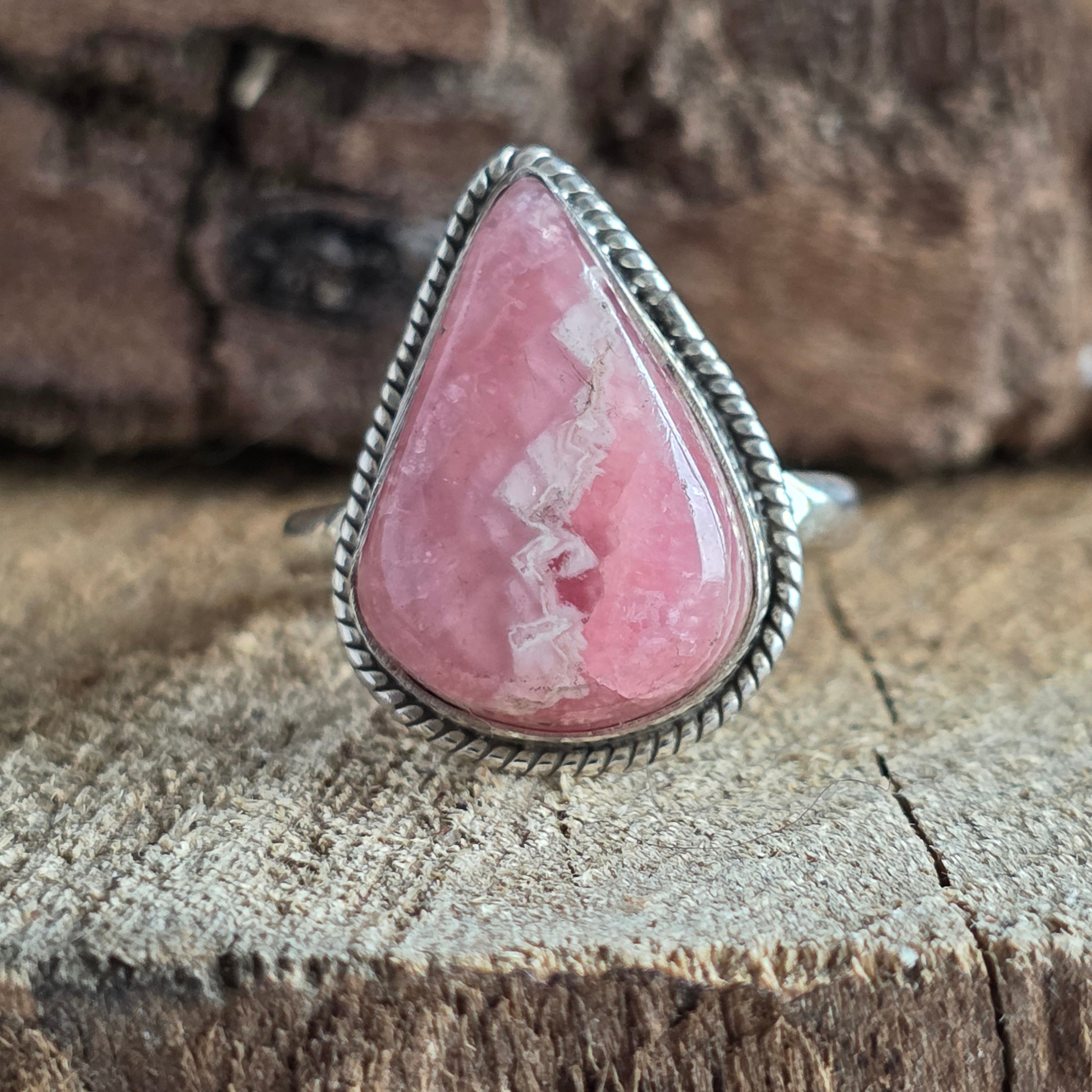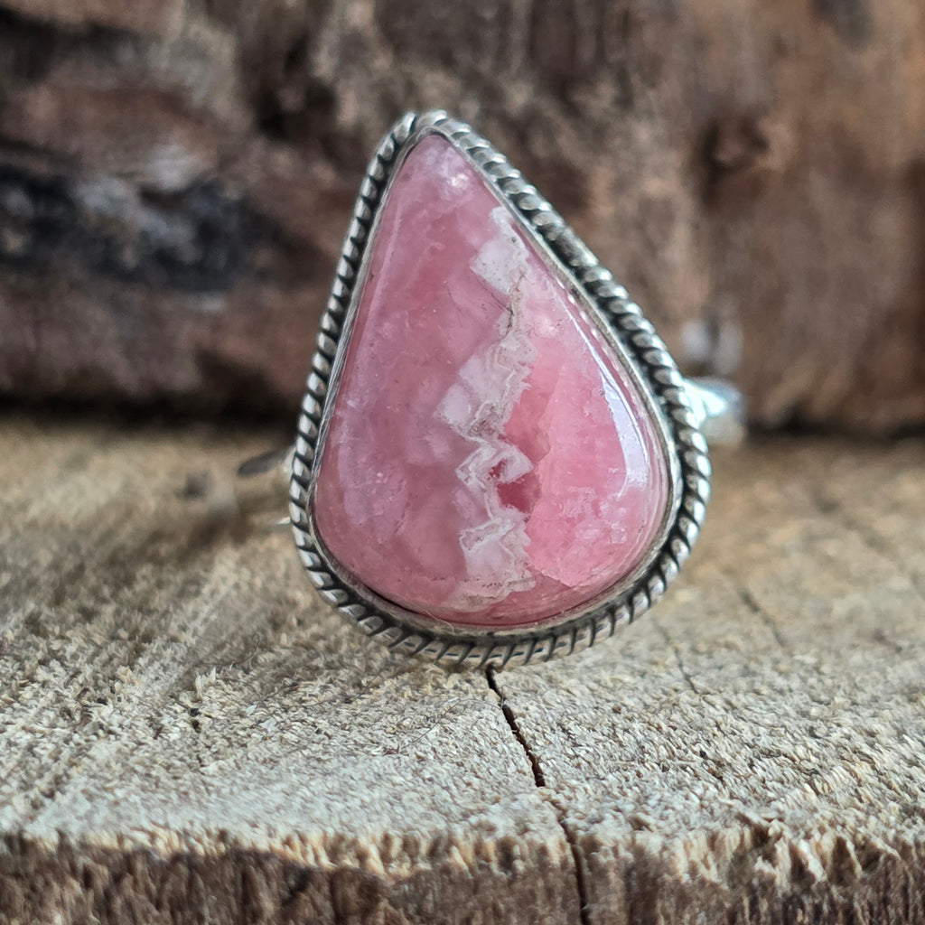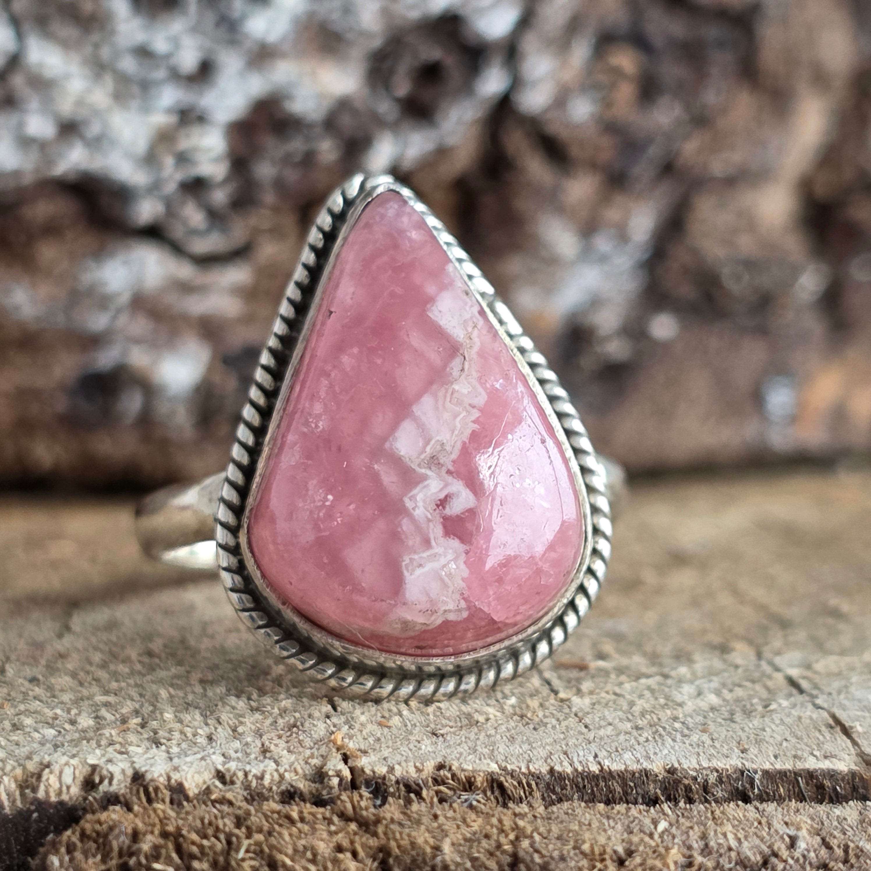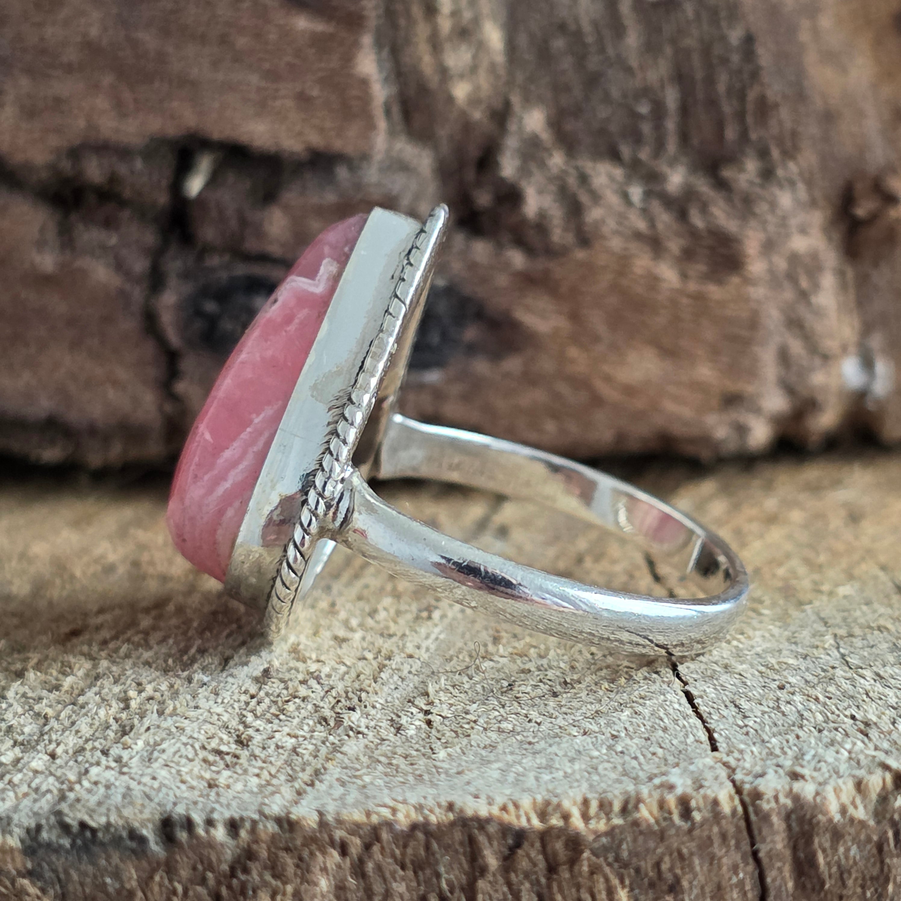 Ein spektakulärer Ring aus 925er Silber mit natürlichem Rhodochrosit in warmen Rosa- und Perlweißtönen. Handgefertigte Halterung verdrillte Drahtarbeit Es betont den natürlichen Charme des Steins und verwandelt das Schmuckstück in ein elegantes Stück voller Persönlichkeit.