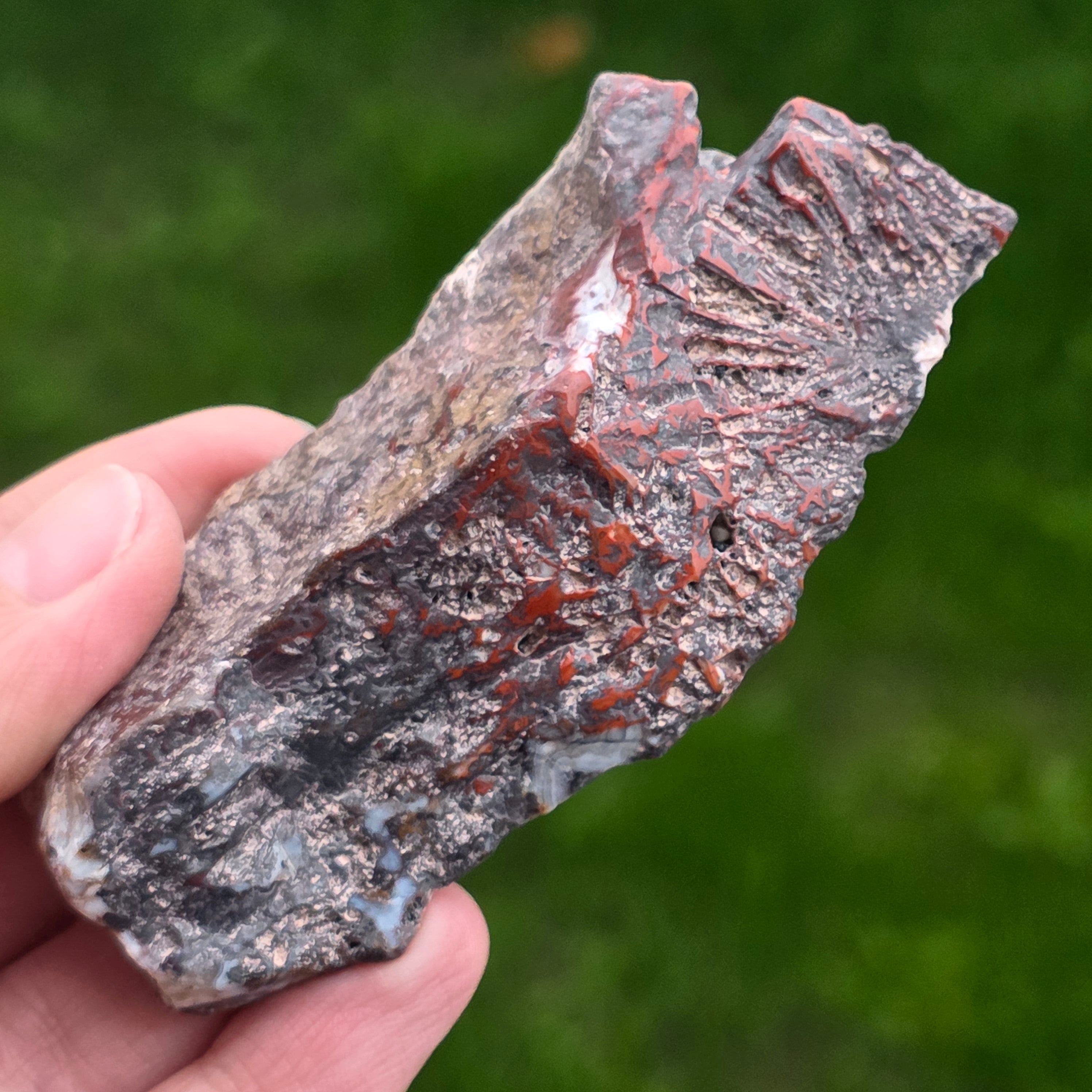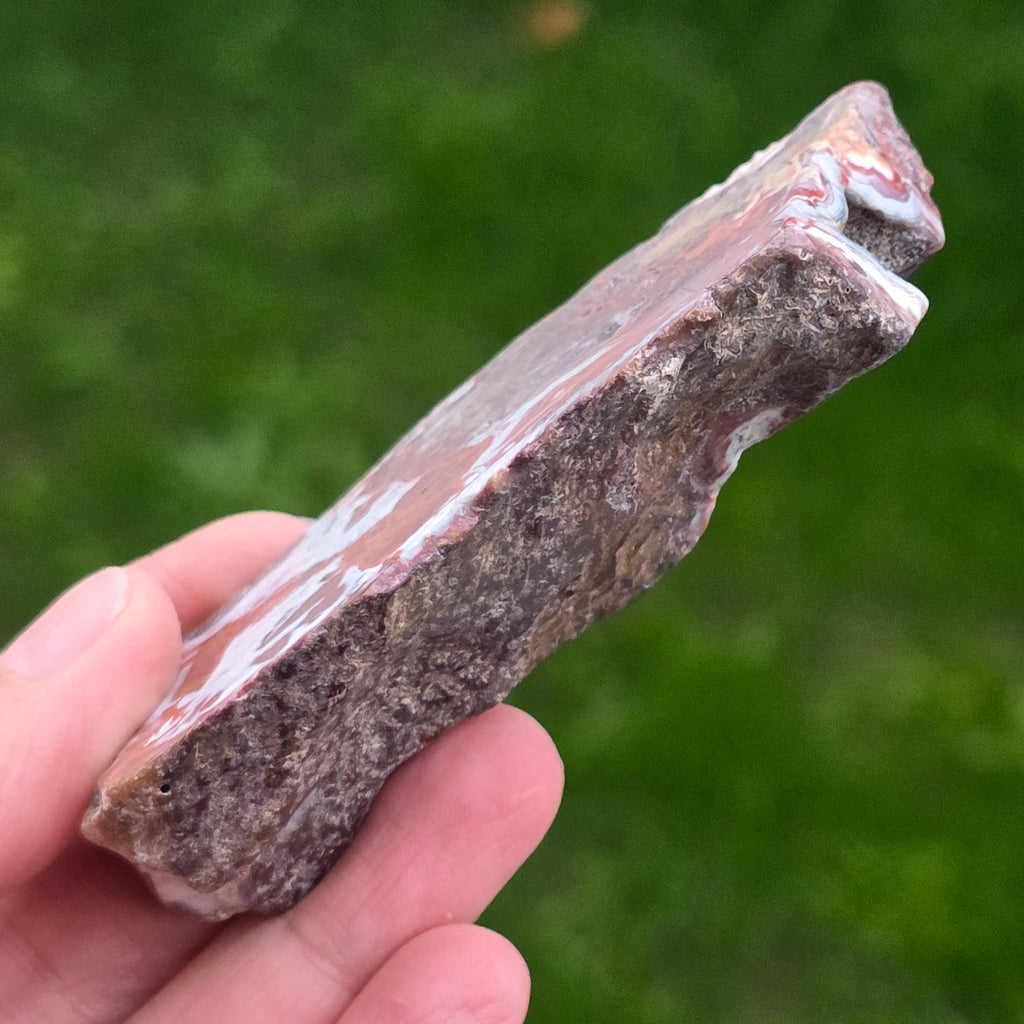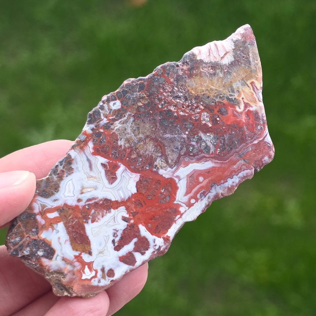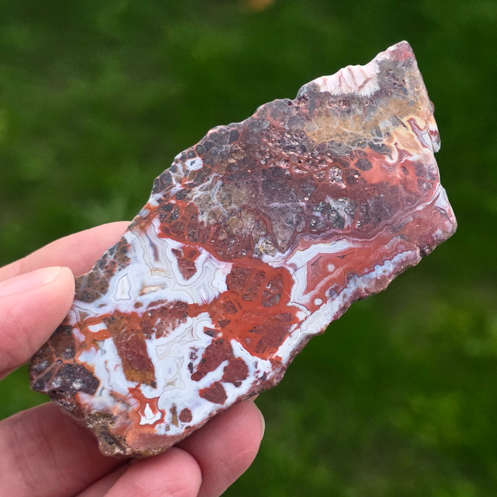 Der Crazy Achat aus Mexiko ist eine der lebhaftesten und spektakulärsten Achat-Varianten, bekannt für seine wellenförmigen Linien und die verrückten Farbspiele, die wie von einer freien Hand ohne Regeln gemalt wirken. In dieser natürlichen Scheibe, klein aber extrem ausdrucksstark, entfaltet sich die ganze Geschichte des Steins: erdige Schichten, warme Karamelltöne, leuchtendes Rot, Orange, Grau und Creme, vermischt in spiralförmigen Mustern, die zu pulsieren scheinen.