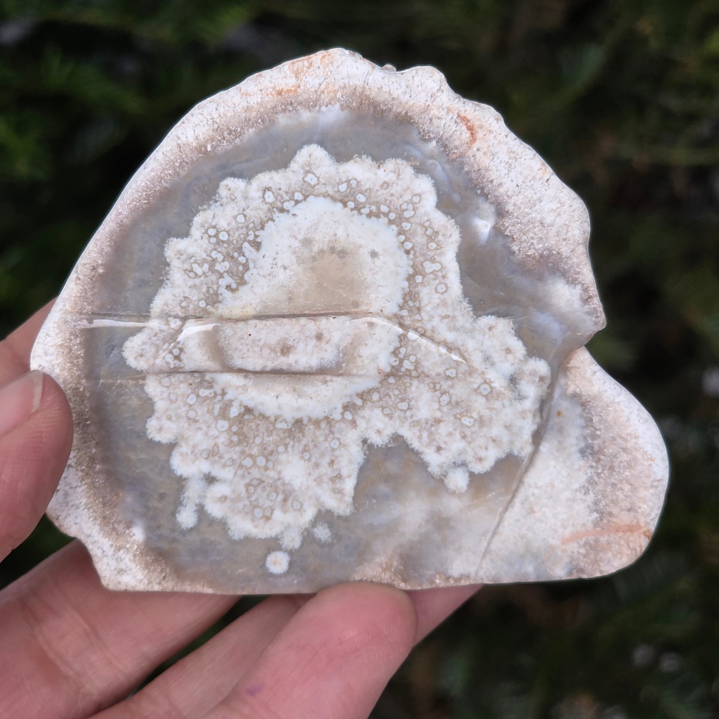 Der Crazy Achat aus Mexiko ist eine der lebendigsten und spektakulärsten Achat-Varianten, berühmt für seine gewellten Linien und die verrückten Farbspiele, die wie von einer freien Hand ohne Regeln gezeichnet wirken. In dieser natürlichen Scheibe, klein, aber äußerst ausdrucksstark, offenbart sich die ganze Geschichte des Steins: erdige Schichten, warme Karamelltöne, leuchtendes Rot, Orange, Grau und Creme, vermischt in spiralförmigen Mustern, die zu pulsieren scheinen.