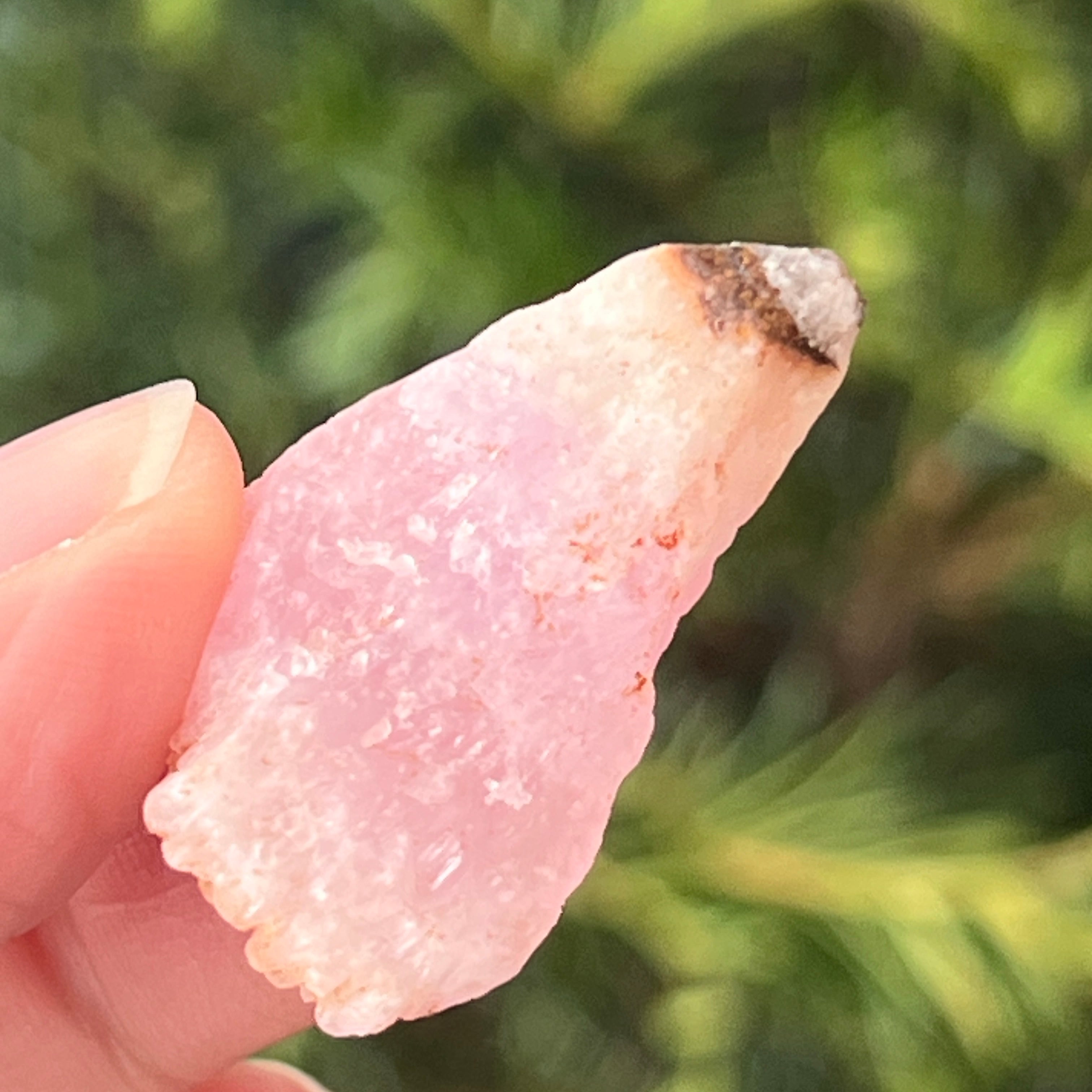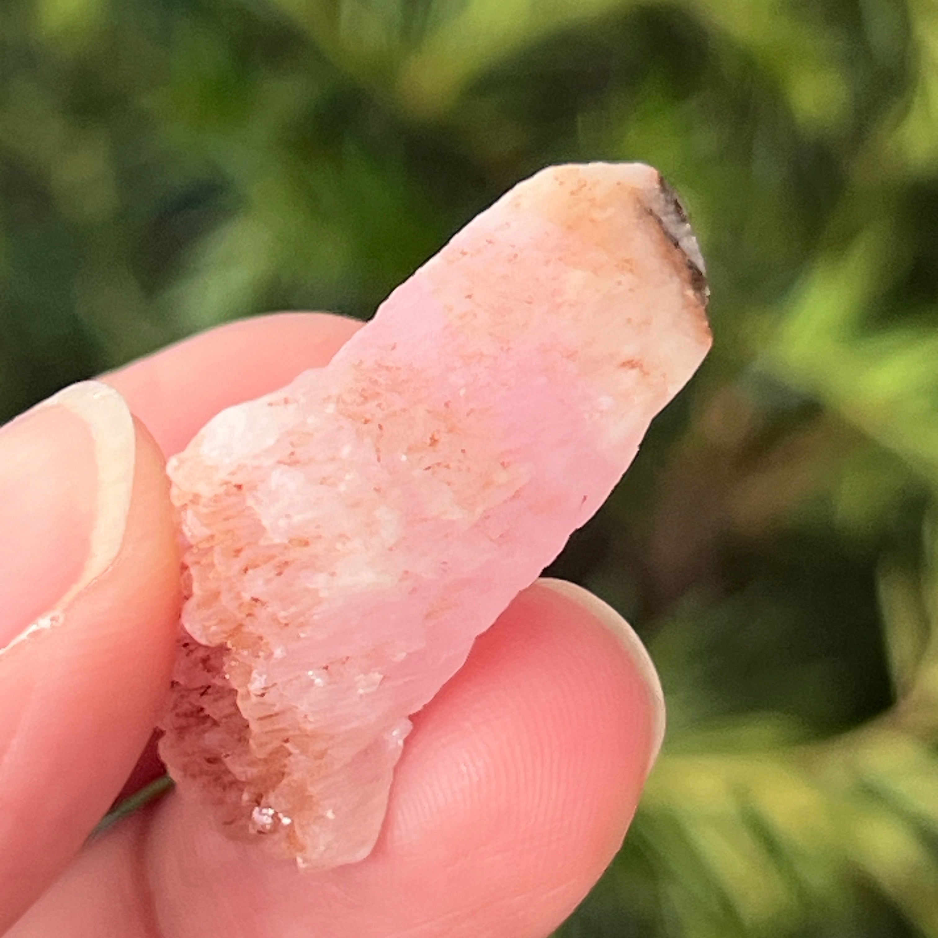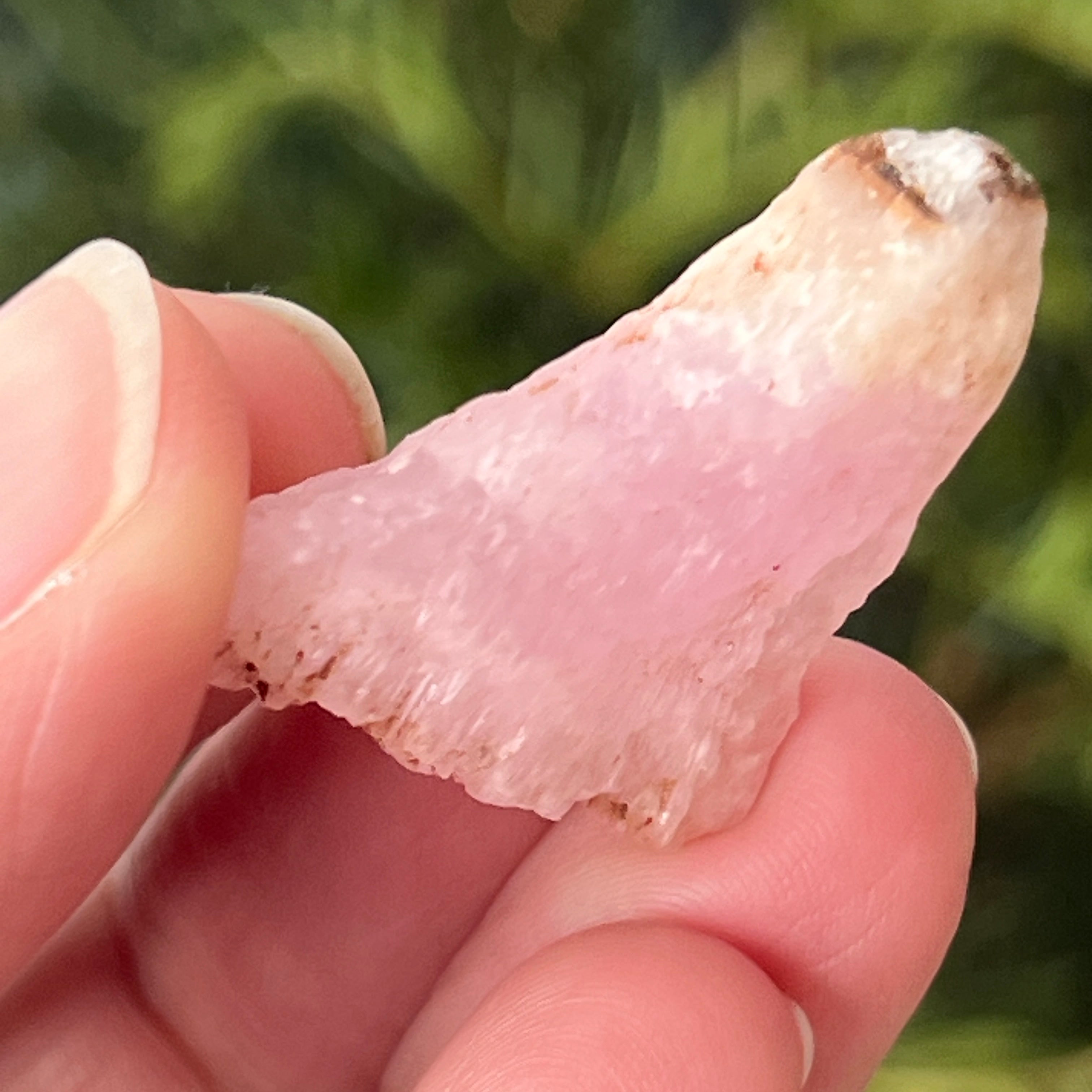 Rosa Aragonit ist ein seltenerer Halbedelstein. Es besteht aus Calciumcarbonat und hat aufgrund von Eisenverunreinigungen eine rosa-orange Farbe.