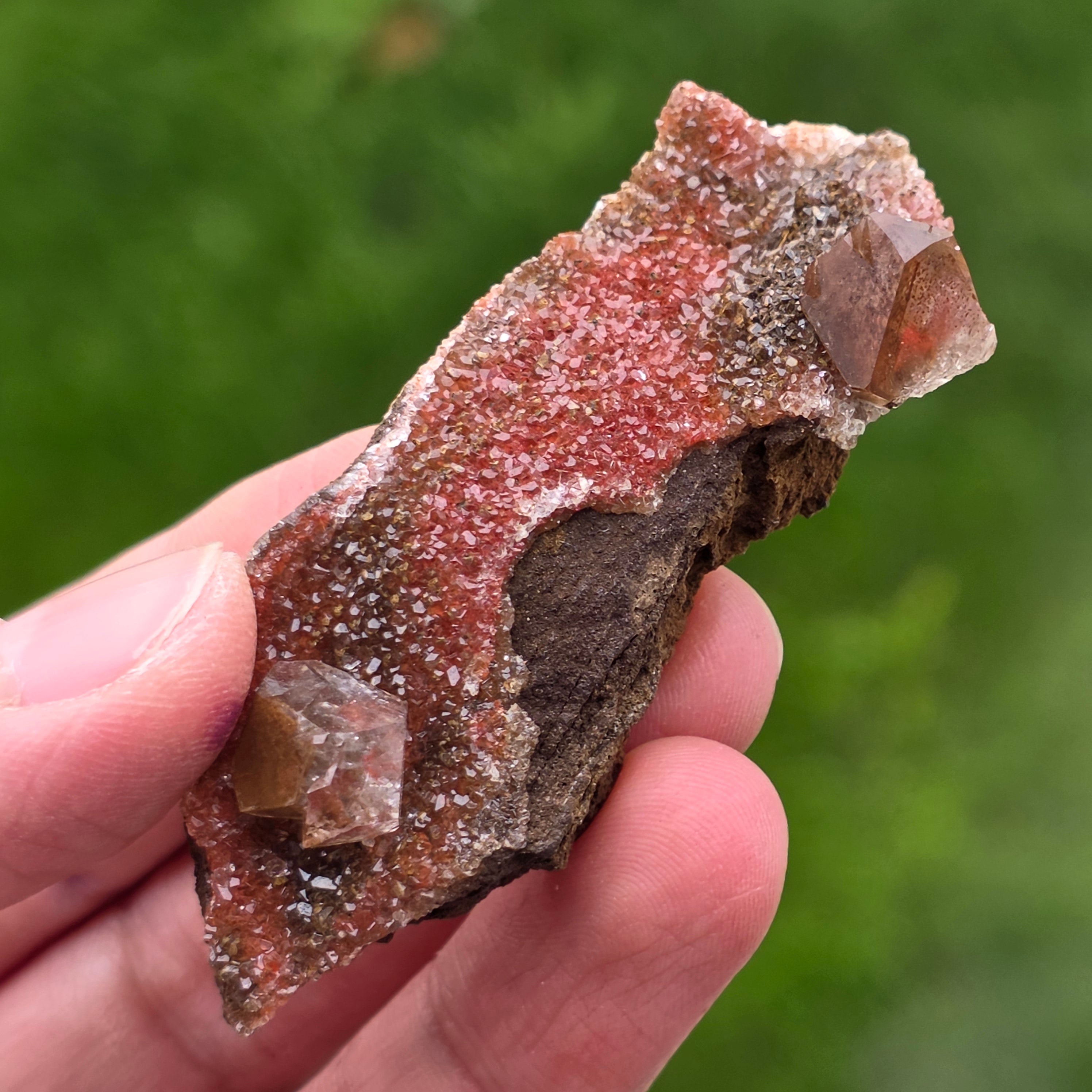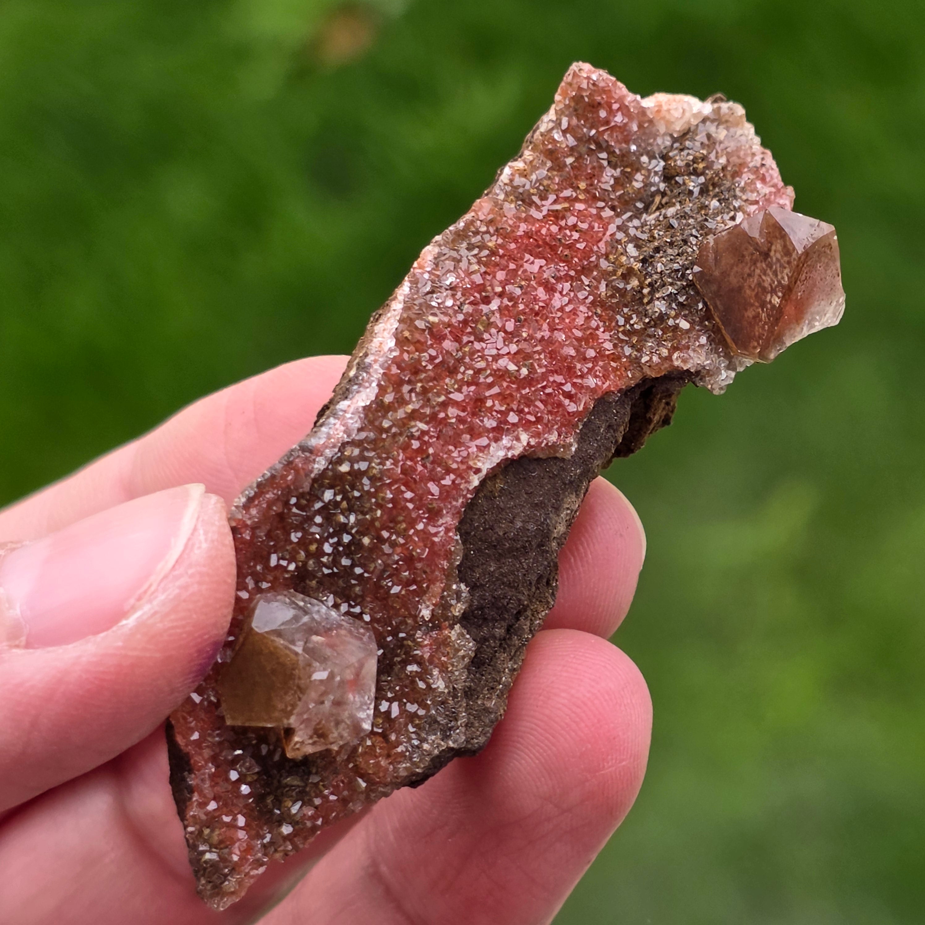 Die Calcitkristalle zeigen die typische „Diamantcalcit“-Habit, gekennzeichnet durch gut definierte Enden und glänzende Flächen, die das Licht subtil, aber ausdrucksvoll reflektieren. Die kompakte Anordnung der Kristalle erzeugt eine funkelnde Oberfläche mit reicher Textur, jedes Stück unterscheidet sich in Form, Farbintensität und Kristallverteilung.