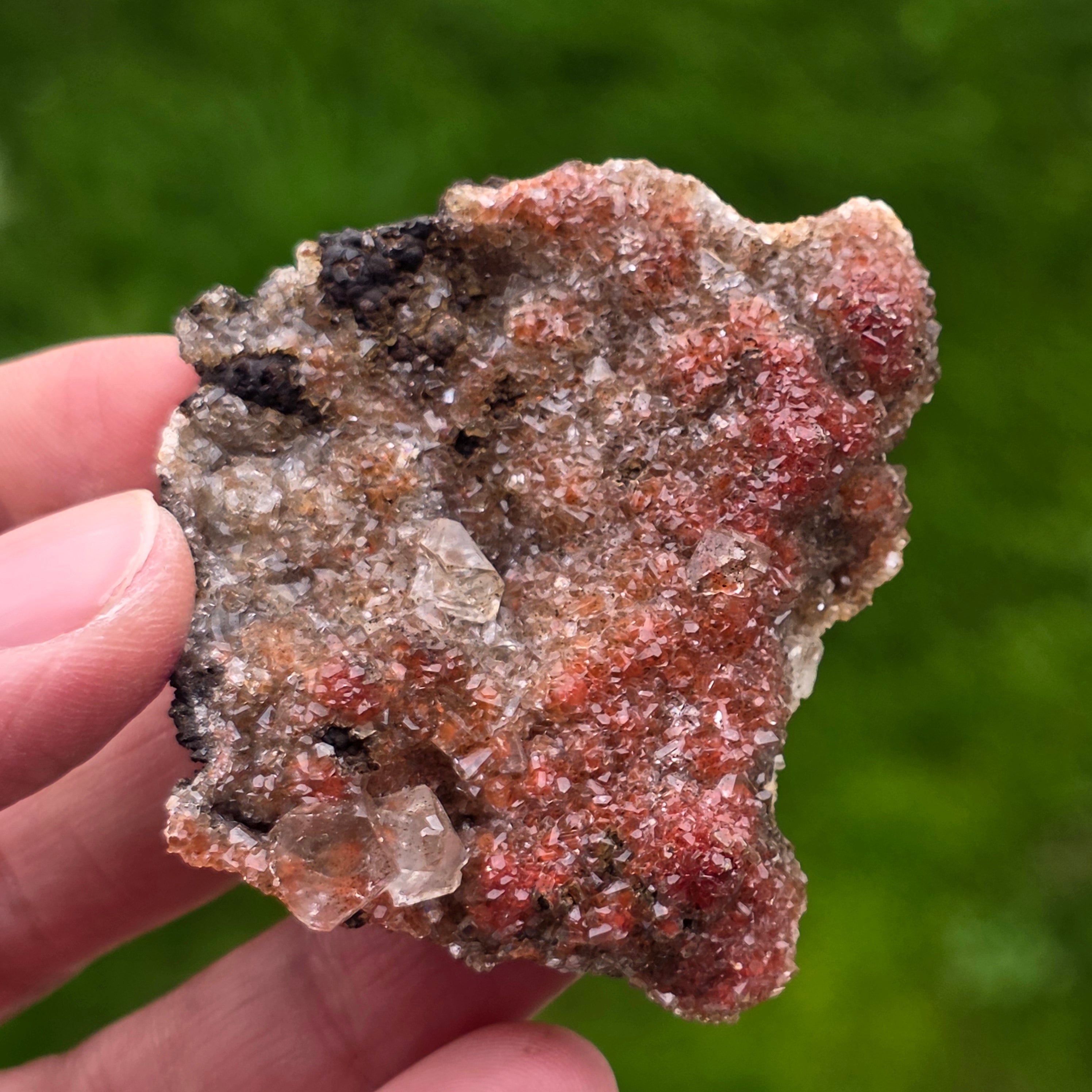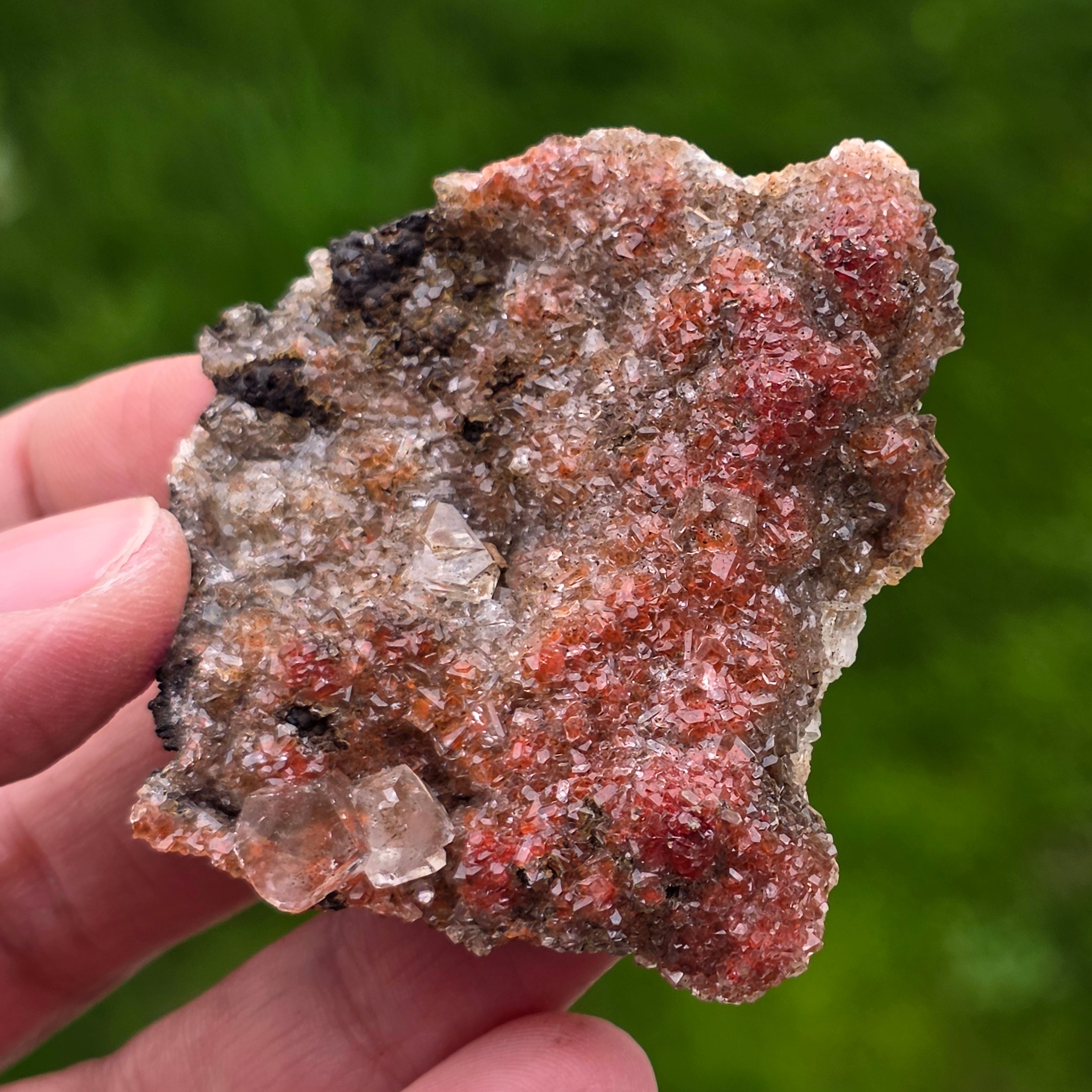 Die Calcitkristalle zeigen das spezifische Habit namens „Diamond Calcit“, gekennzeichnet durch wohlgeformte Spitzen und glänzende Flächenden, die das Licht subtil, aber ausdrucksstark reflektieren. Die kompakte Anordnung der Kristalle erzeugt eine funkelnde Oberfläche mit reicher Textur, wobei jedes Stück in Form, Farbintensität und Kristallverteilung unterschiedlich ist.