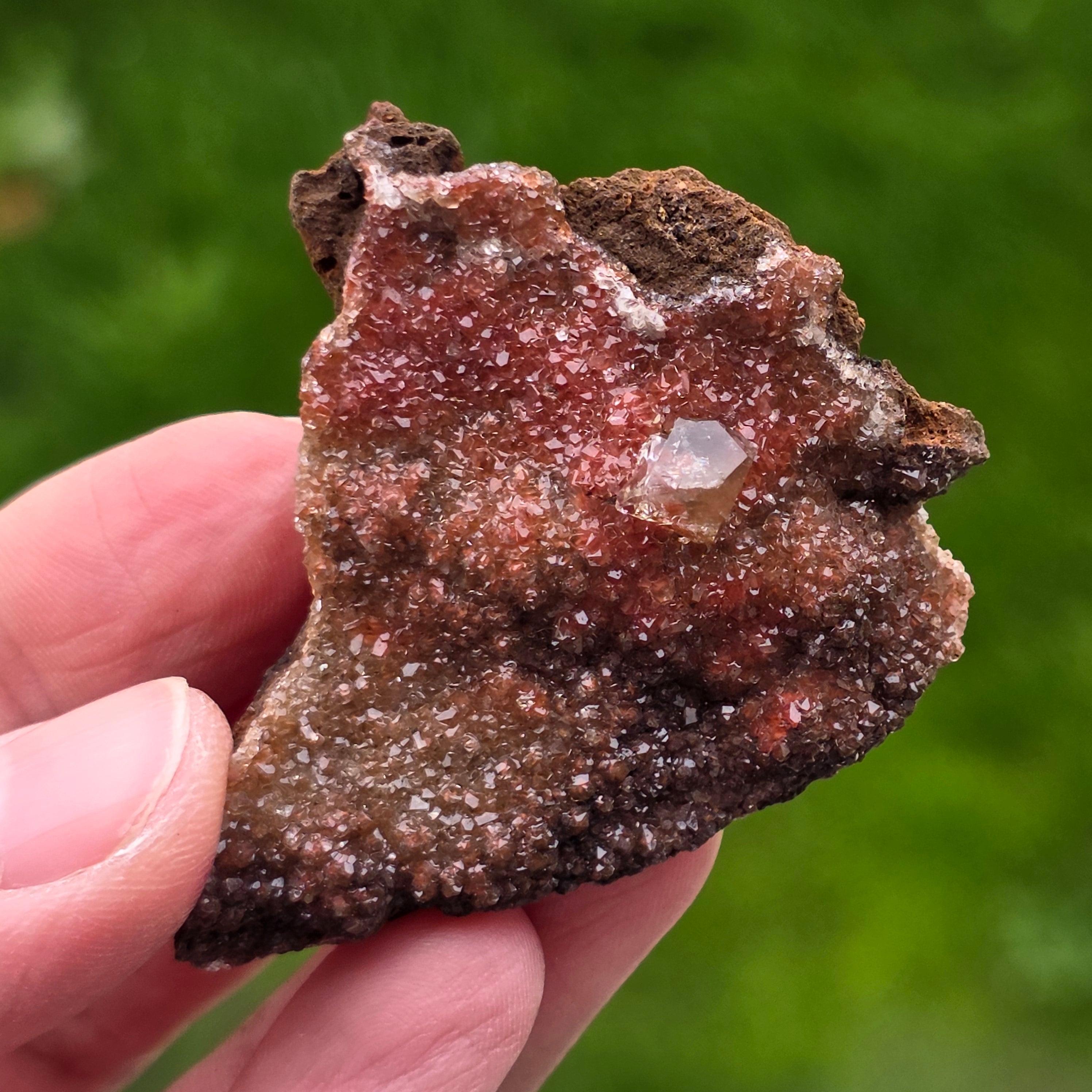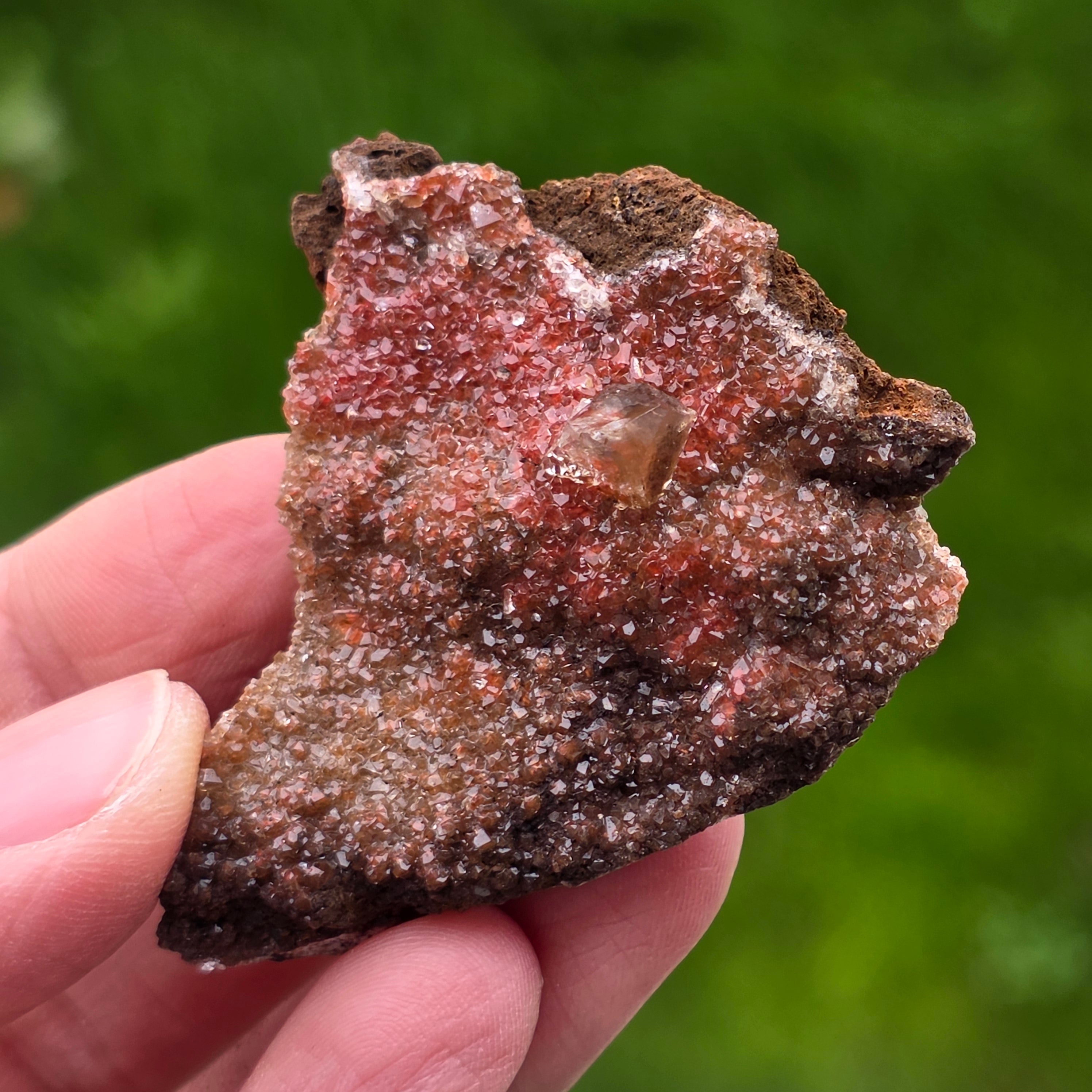 Die Calcit-Kristalle zeigen die typische Form, die als „Diamond Calcite“ bekannt ist, gekennzeichnet durch wohlgeformte Enden und glänzende Flächen, die das Licht subtil, aber ausdrucksvoll reflektieren. Die kompakte Anordnung der Kristalle schafft eine funkelnde Oberfläche mit reicher Textur, wobei jedes Stück in Form, Farbintensität und Kristallverteilung einzigartig ist.