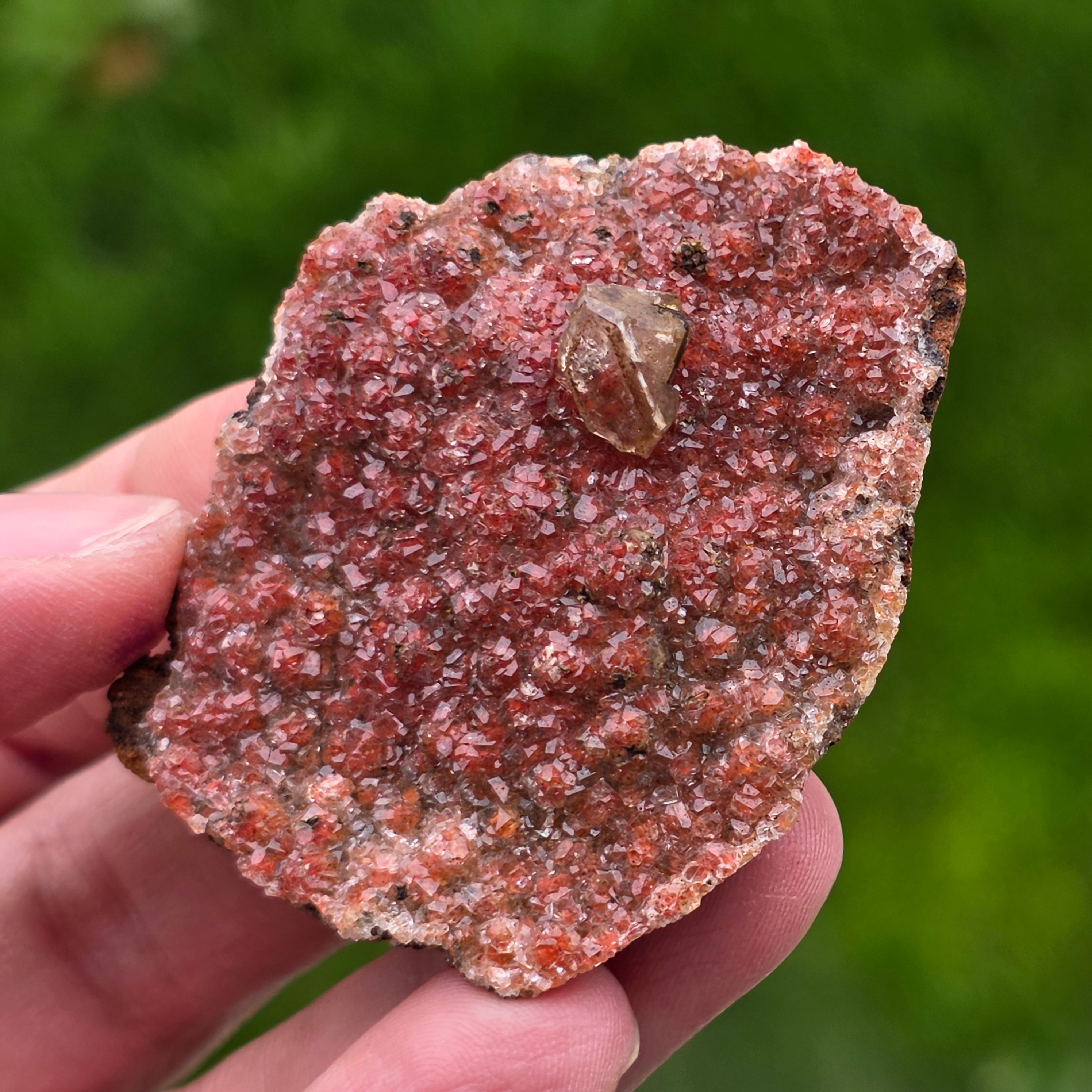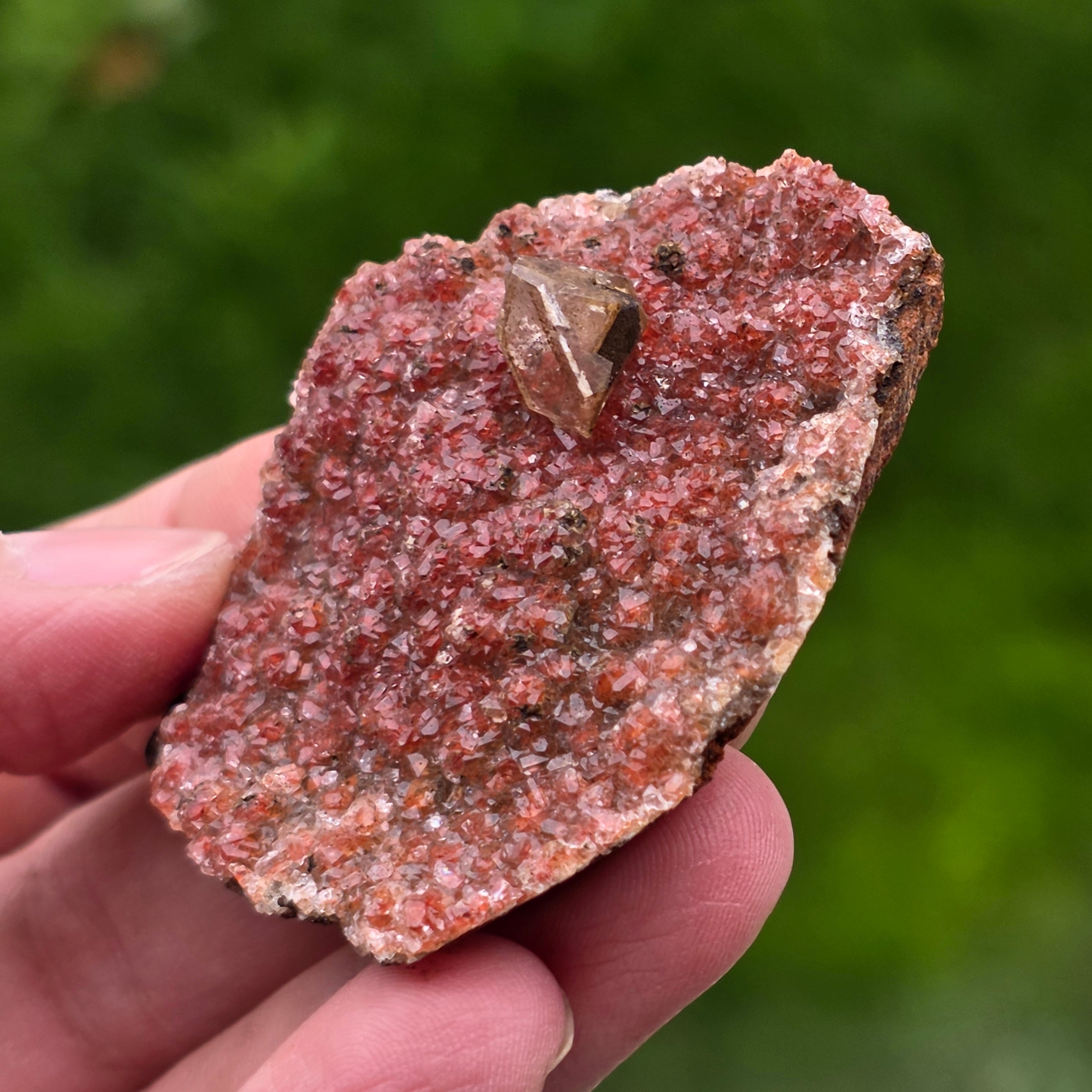 Die Calcitkristalle zeigen die typische Form, die als „Diamant-Calcit“ bezeichnet wird, gekennzeichnet durch wohlgeformte Enden und glänzende Flächen, die das Licht subtil, aber ausdrucksvoll reflektieren. Die kompakte Anordnung der Kristalle schafft eine funkelnde Oberfläche mit reicher Textur, wobei jedes Stück in Form, Farbintensität und Kristallverteilung unterschiedlich ist.