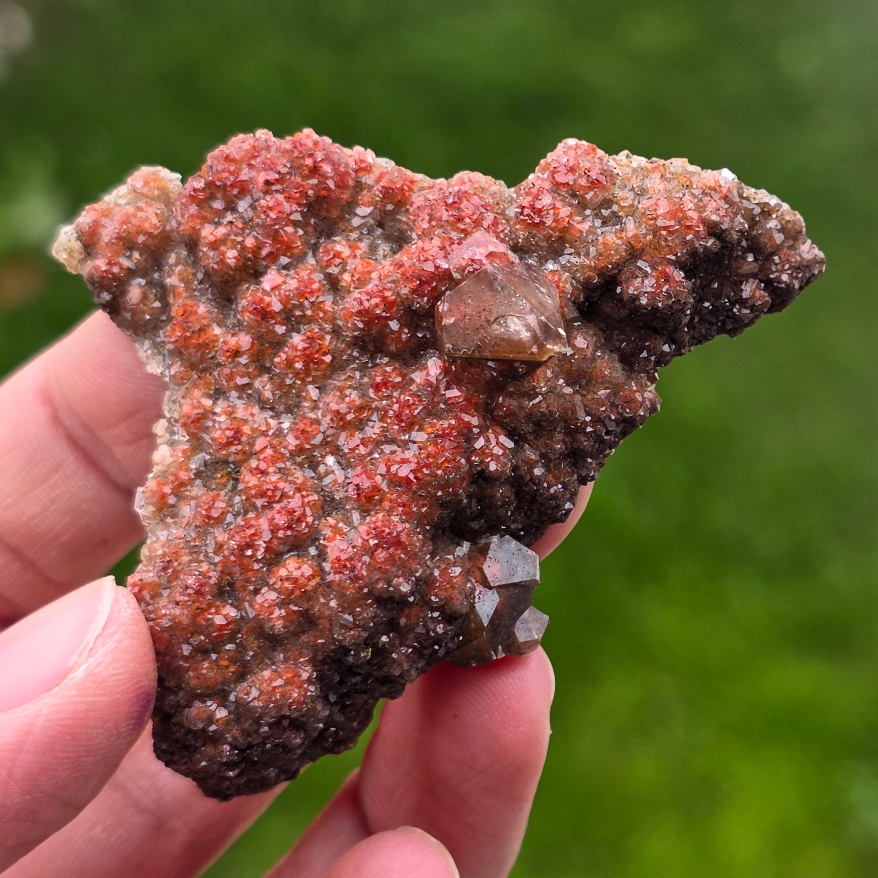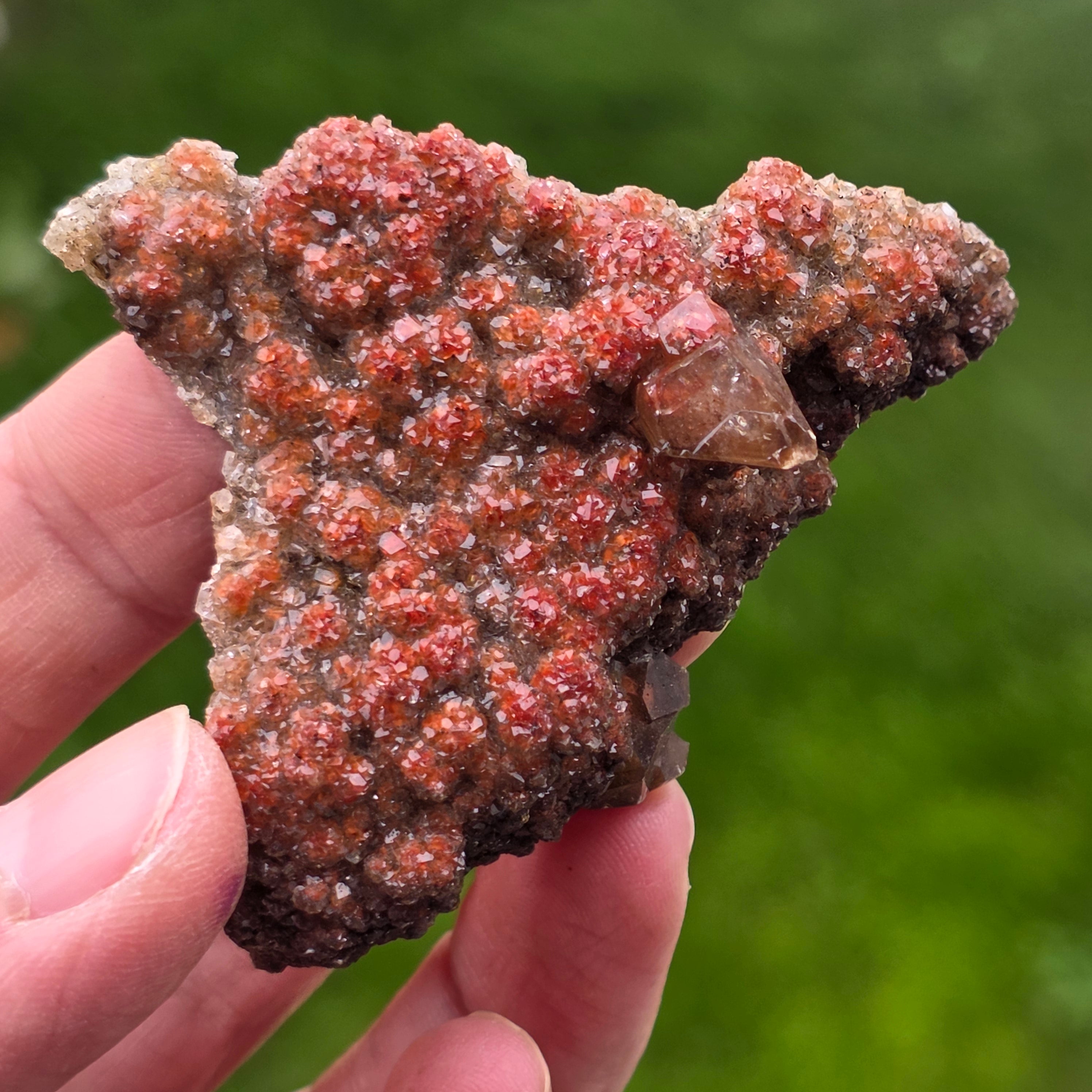 Die Calcitkristalle zeigen das spezifische Habit „Diamant-Calcit“, gekennzeichnet durch wohlgeformte Enden und glänzende Flächen, die das Licht subtil, aber ausdrucksvoll reflektieren. Die kompakte Anordnung der Kristalle erzeugt eine funkelnde Oberfläche mit reicher Textur, wobei jedes Stück in Form, Farbintensität und Kristallverteilung unterschiedlich ist.