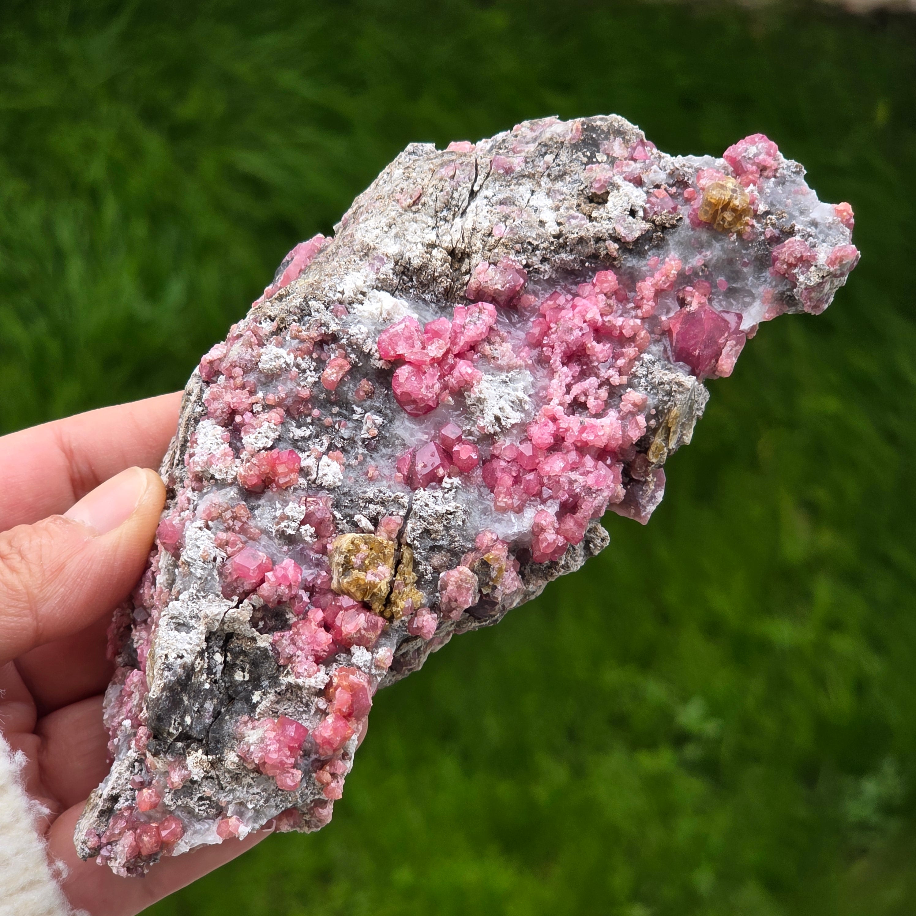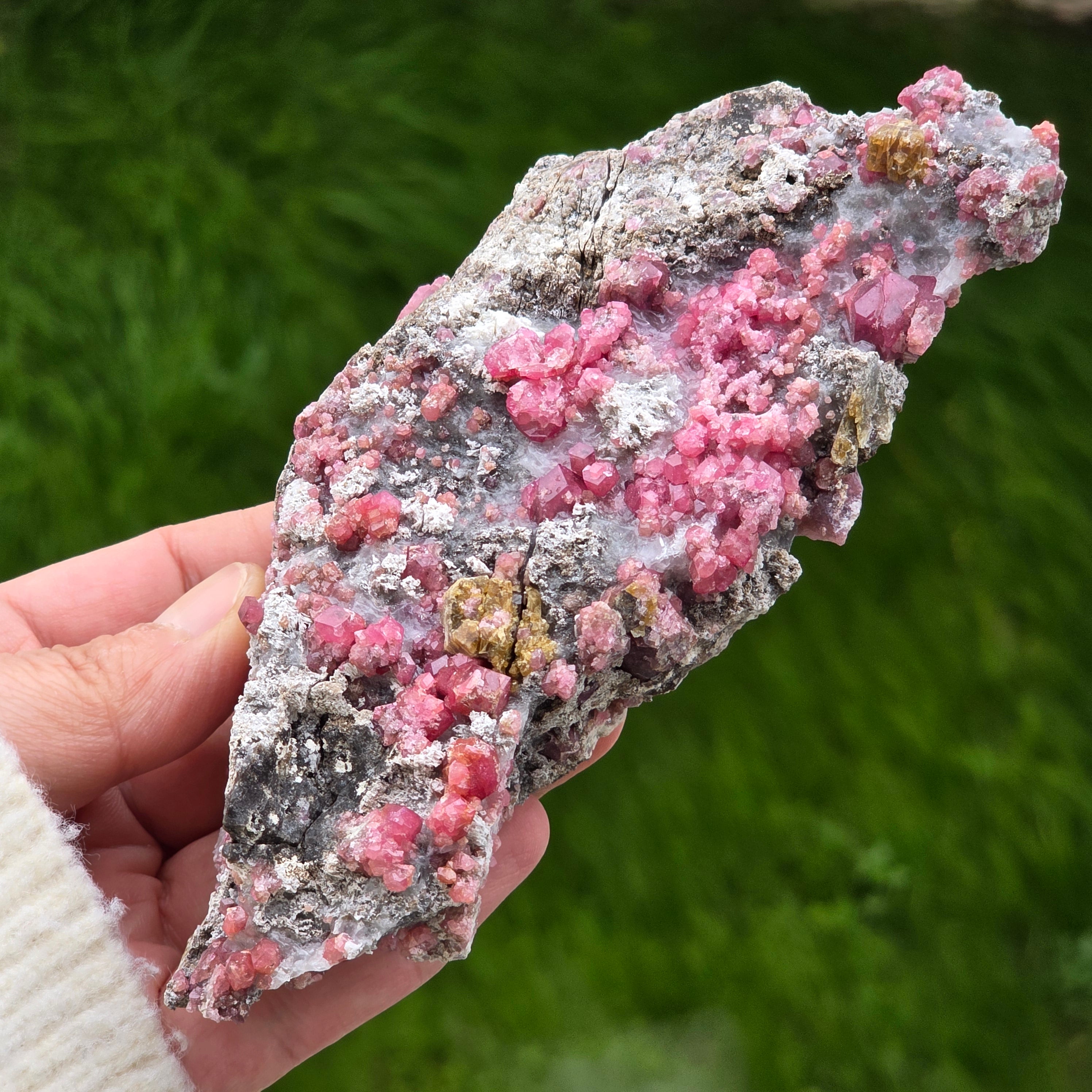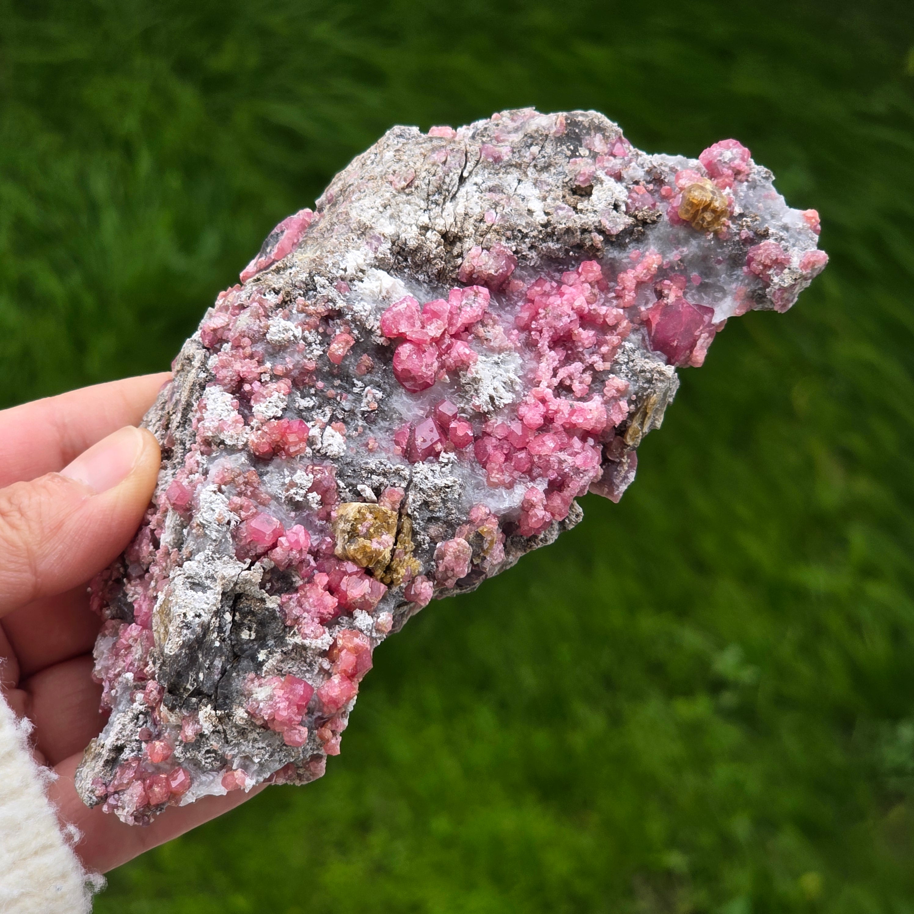 Die rosa Granatkristalle sind direkt in der Matrix sichtbar, mit gut definierten natürlichen Formen, organisch in der Gesteinsstruktur gewachsen. Der Kontrast zwischen den warmen Tönen des Granats und der rohen Textur der Matrix verleiht dem Exemplar ein ausgewogenes und authentisches Aussehen, das für Sammlerstücke typisch ist. Die Präsenz der Matrix bewahrt den Bildungskontext des Minerals und steigert sowohl den ästhetischen als auch den mineralogischen Wert.