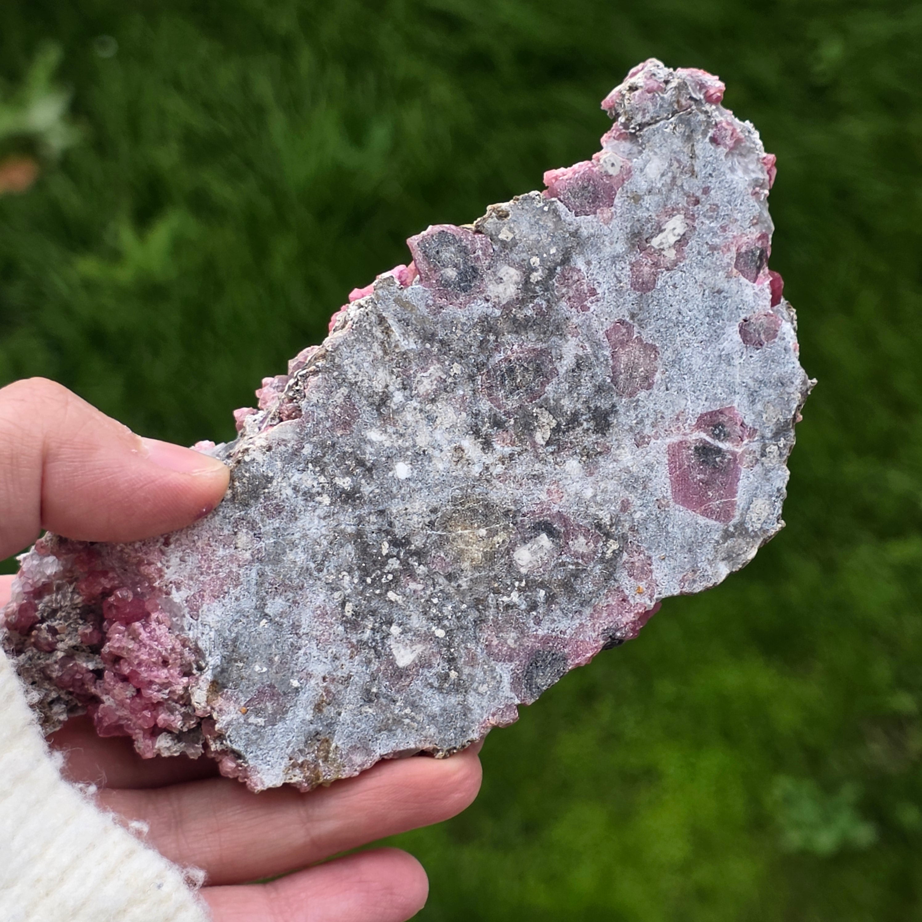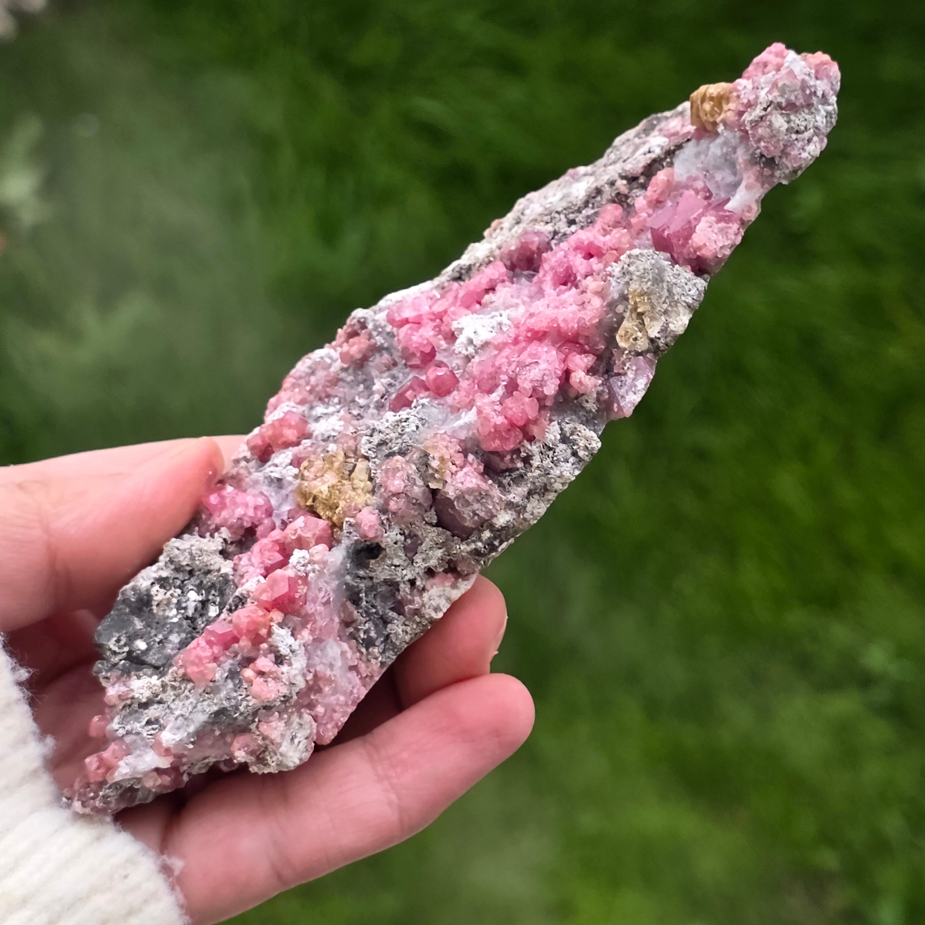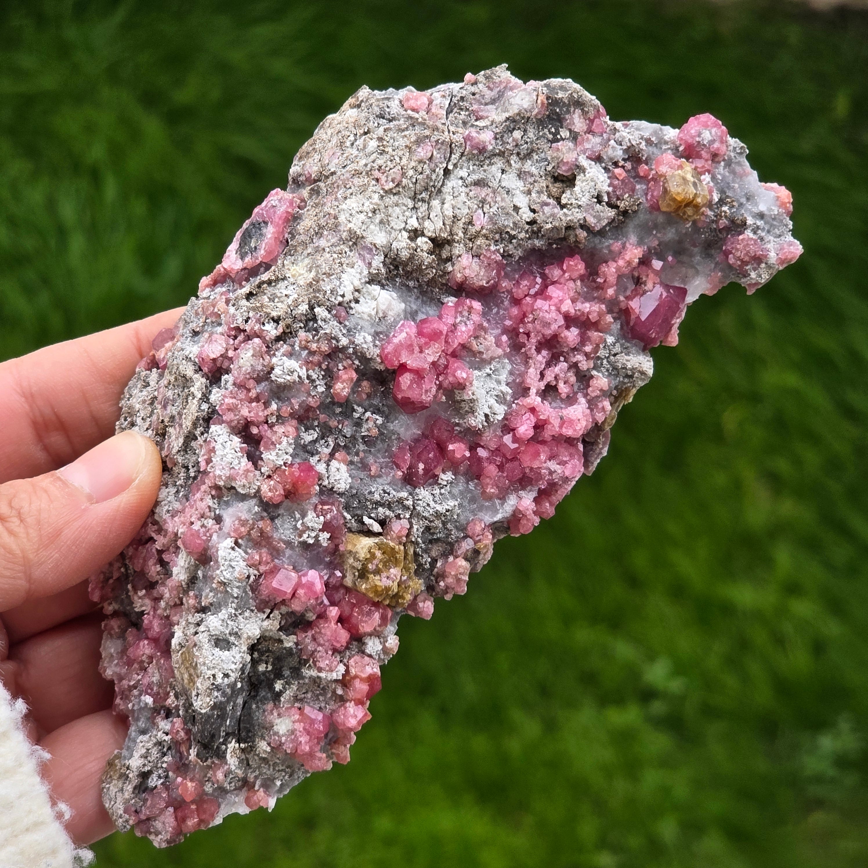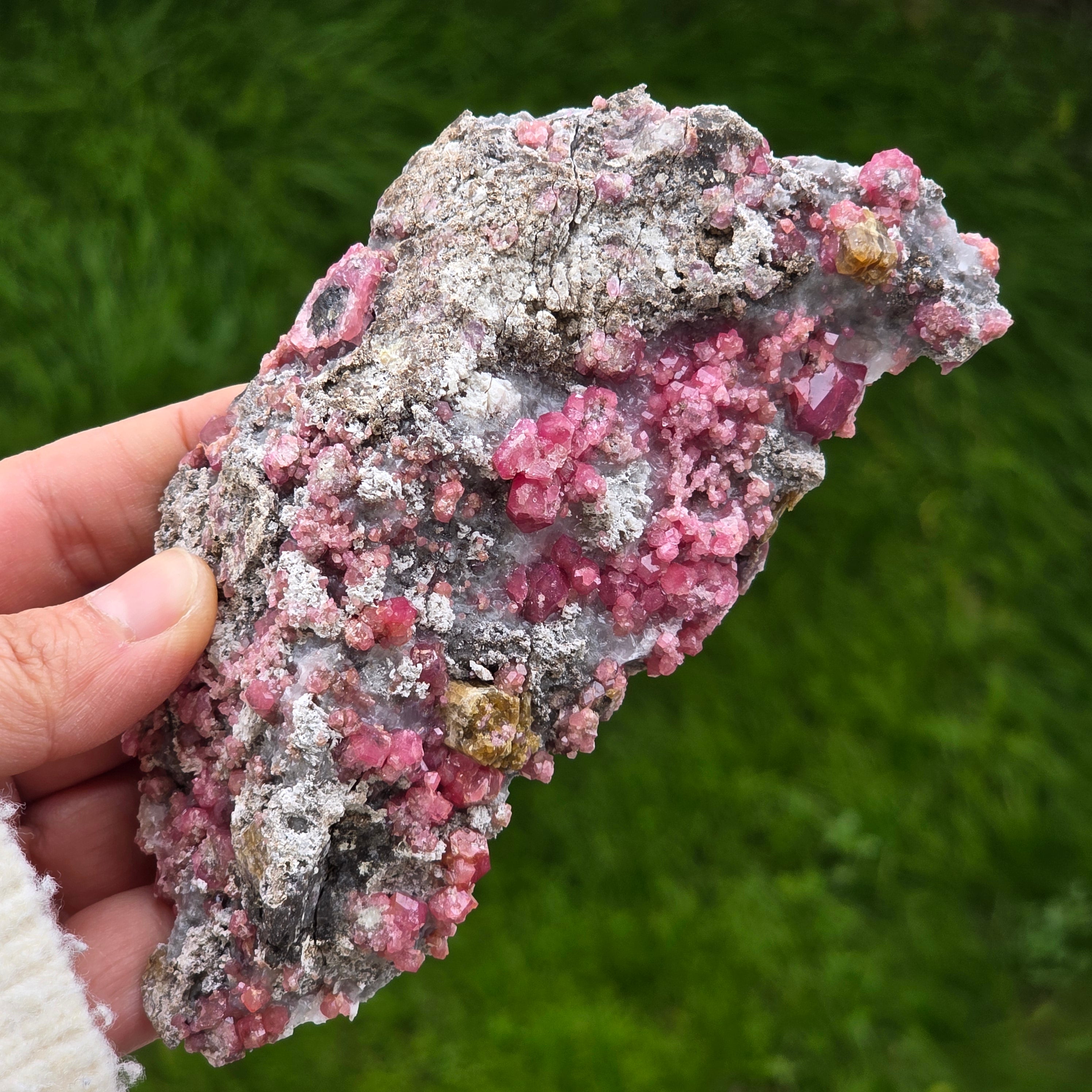 Die rosa Granatkristalle sind direkt in der Matrix sichtbar, mit gut definierten natürlichen Formen, organisch in der Gesteinsstruktur gewachsen. Der Kontrast zwischen den warmen Tönen des Granats und der rohen Textur der Matrix verleiht dem Exemplar ein ausgewogenes und authentisches Aussehen, das für Sammlerstücke typisch ist. Die Präsenz der Matrix bewahrt den Bildungskontext des Minerals und steigert sowohl den ästhetischen als auch den mineralogischen Wert.