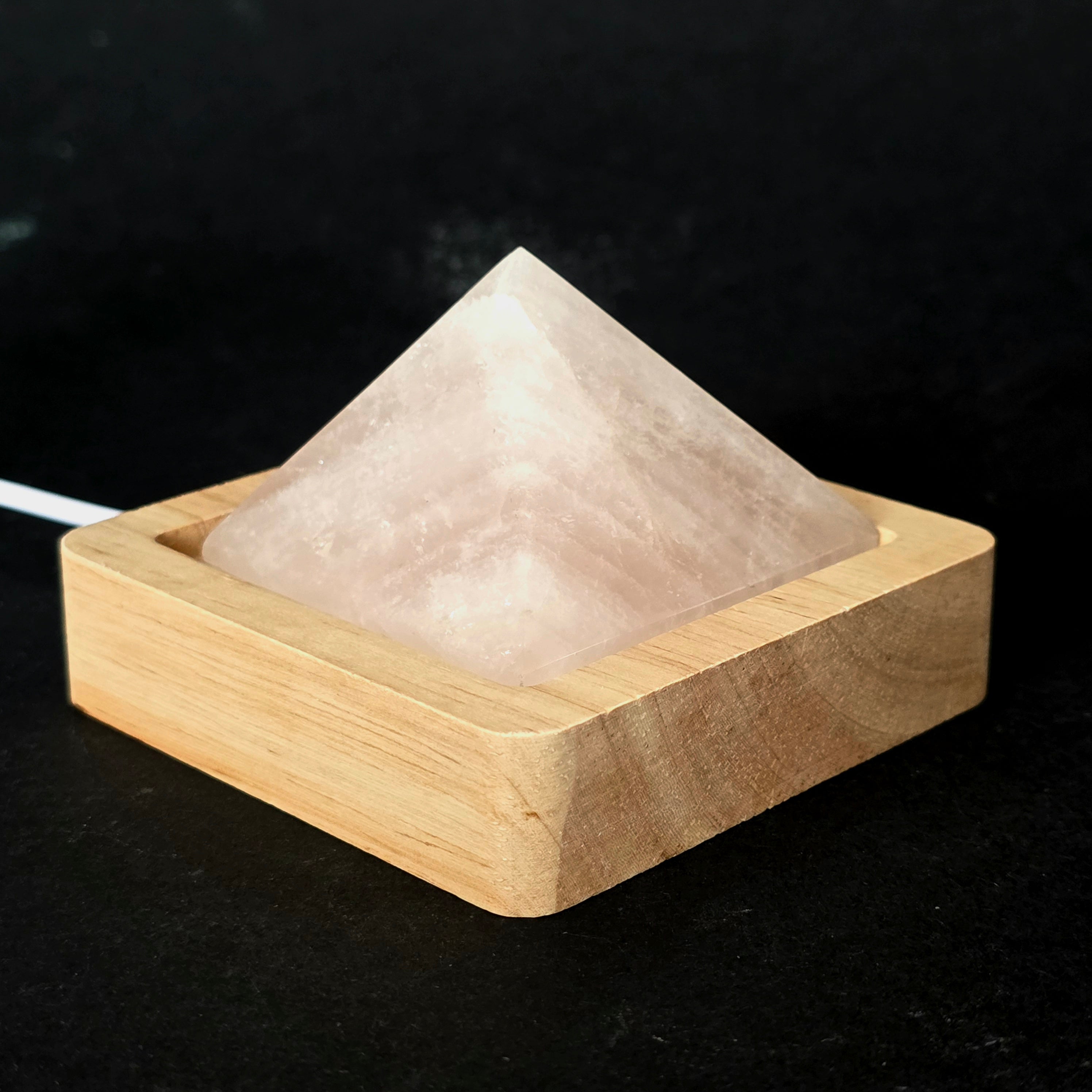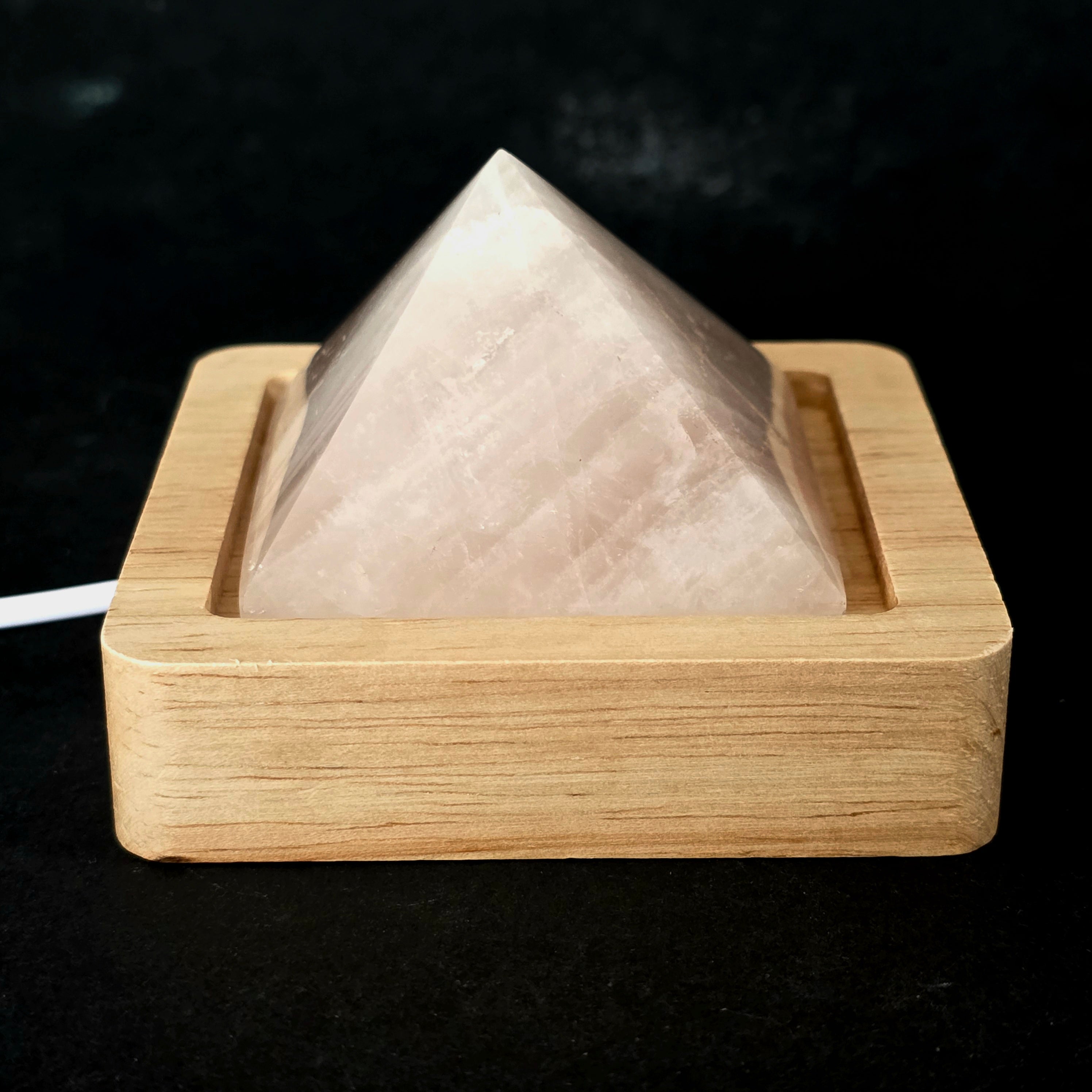 Materialien: natürliche Rosenquarzpyramide, dekorative Lampenbasis aus Holz, Beleuchtungssystem mit USB-Stromversorgung.