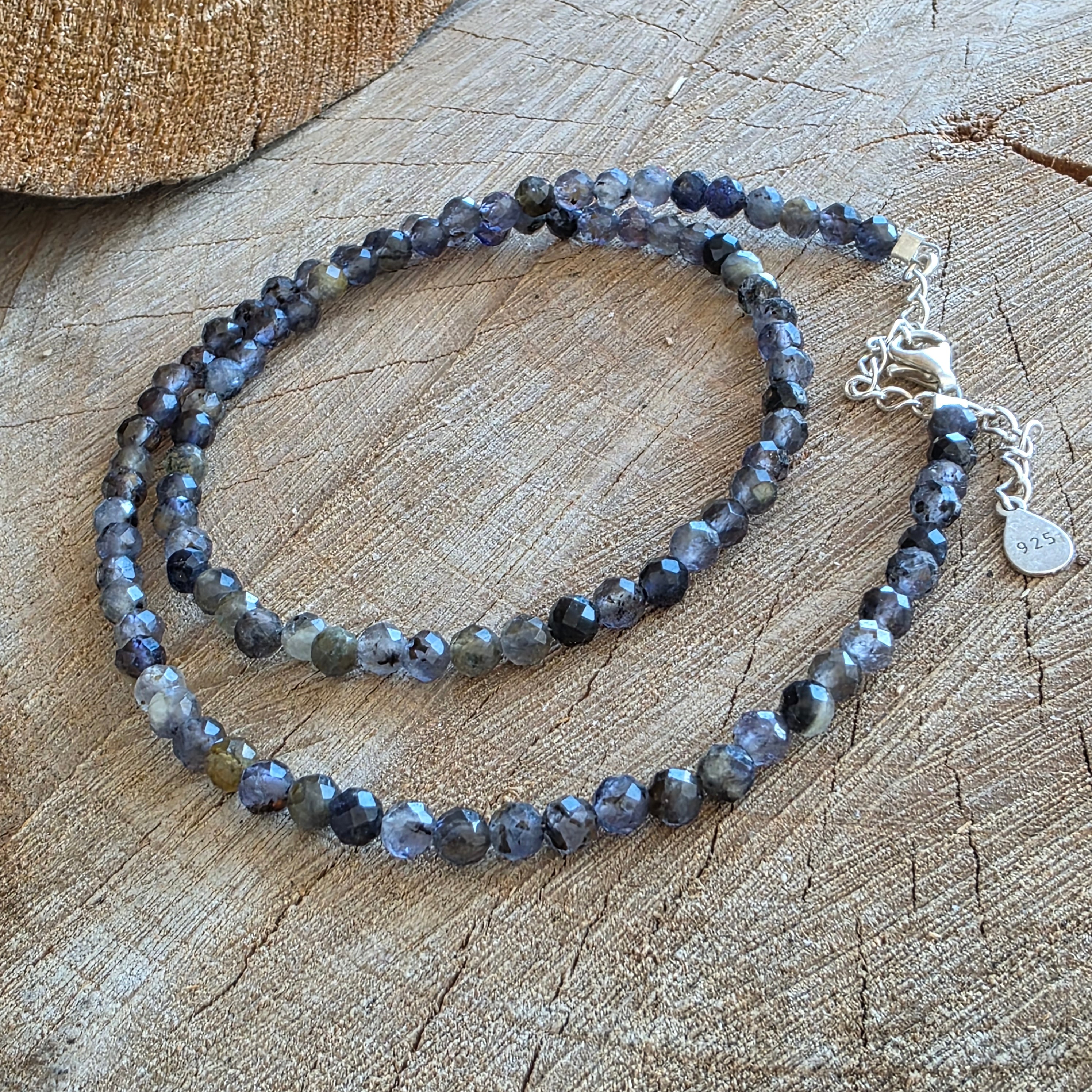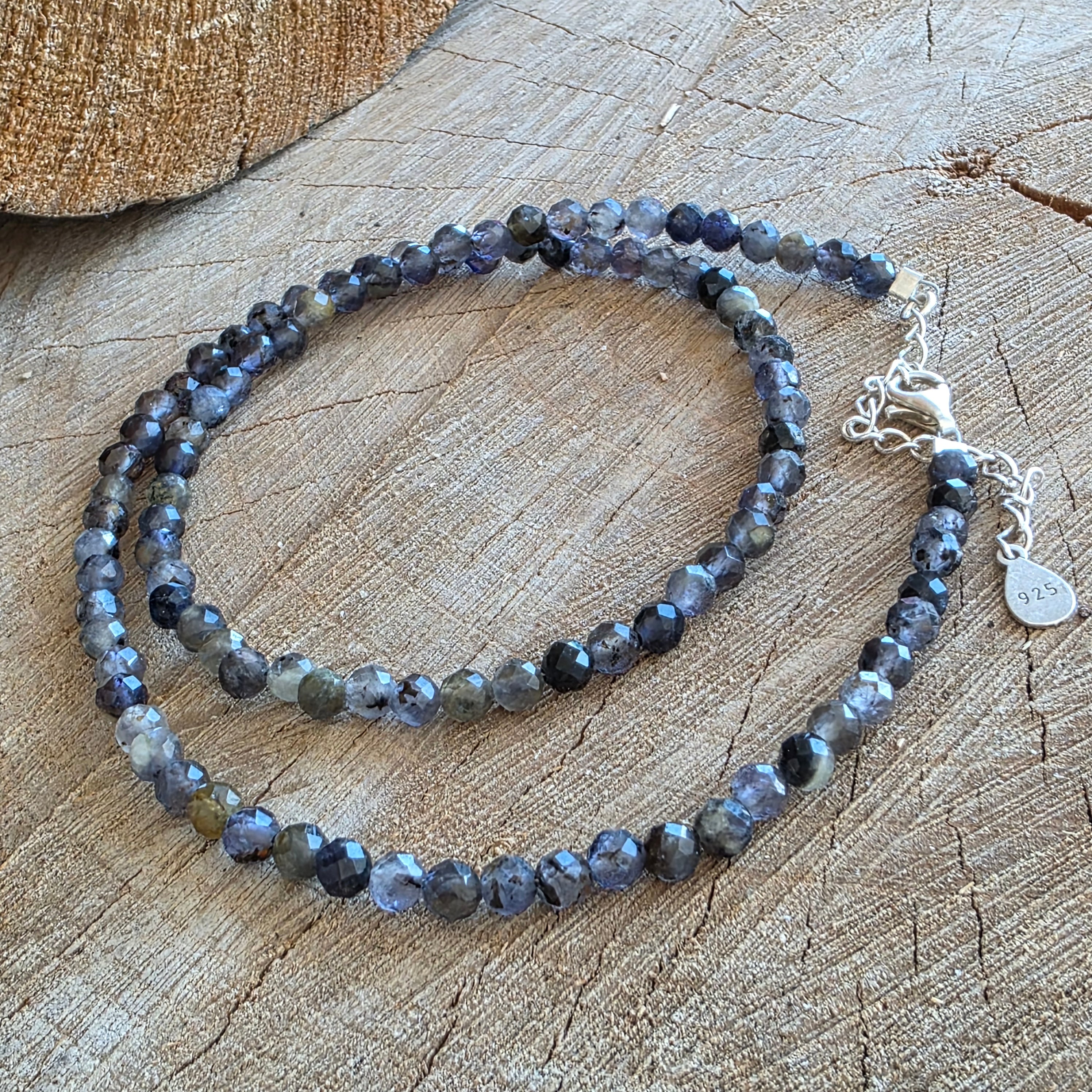 Eine Halskette mit ruhiger Tiefe und subtiler Eleganz, gefertigt aus 4 mm facettierten Iolith-Kugeln, die eine feine und ausgewogene Linie um den Hals bilden. Die blau-violetten Nuancen, manchmal mit gräulichen oder transparenten Akzenten, erzeugen ein dezentes Farbenspiel, während die feine Facettierung zarte Reflexe hinzufügt, ohne das Schmuckstück optisch zu überladen. Das Design bleibt klar und harmonisch und betont den natürlichen Charakter des Steins.
