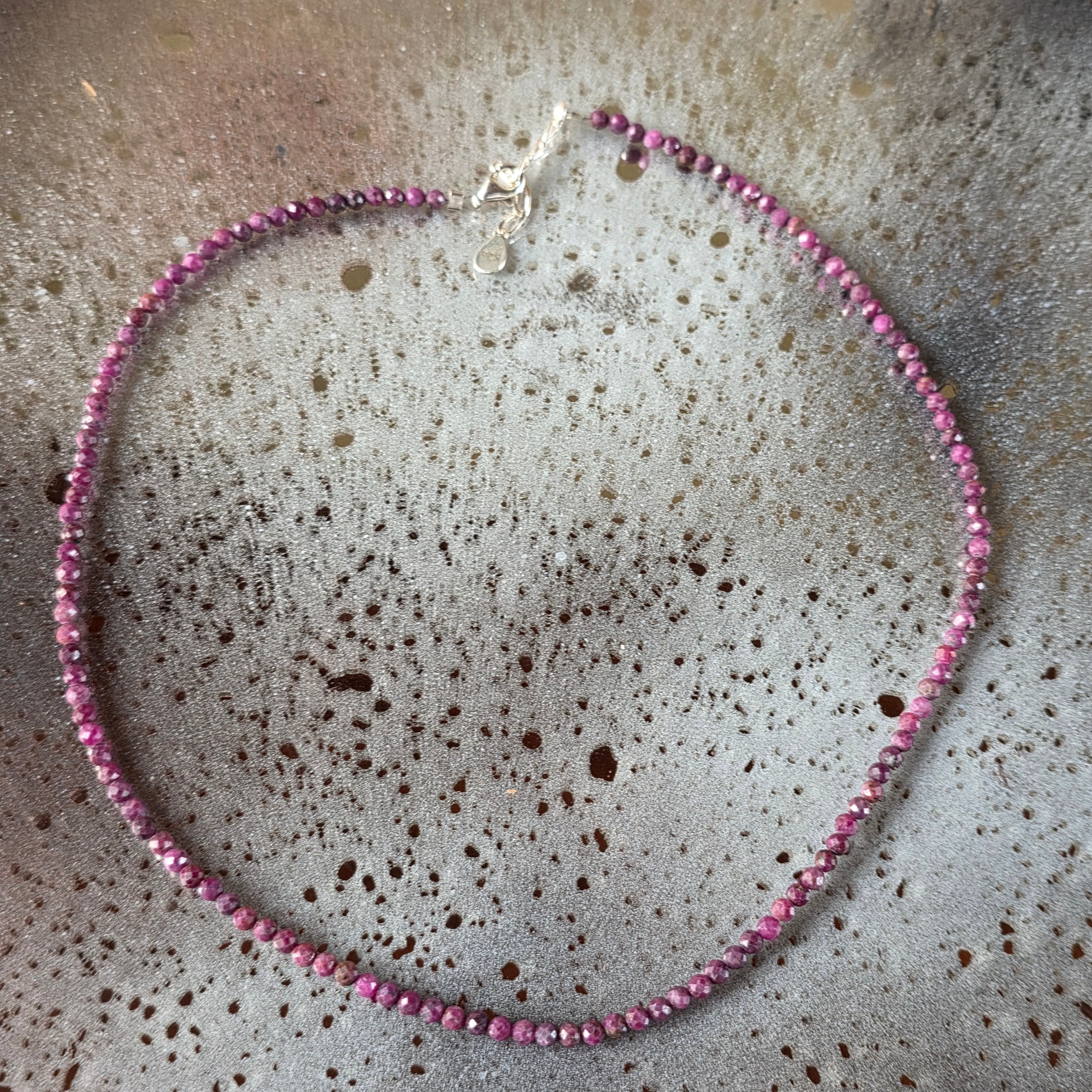 Eine feine, aber präsente Halskette, gefertigt aus facettierten Kugeln aus 3 mm natürlichem Rubinin einem tiefen intensiv kirschroten Farbtonmit warmen und fast königlichen Reflexen. Jede kleine, stille Perle reflektiert das Licht dezent, wie ein Flüstern von Leidenschaft, Absicht und innerer Noblesse.