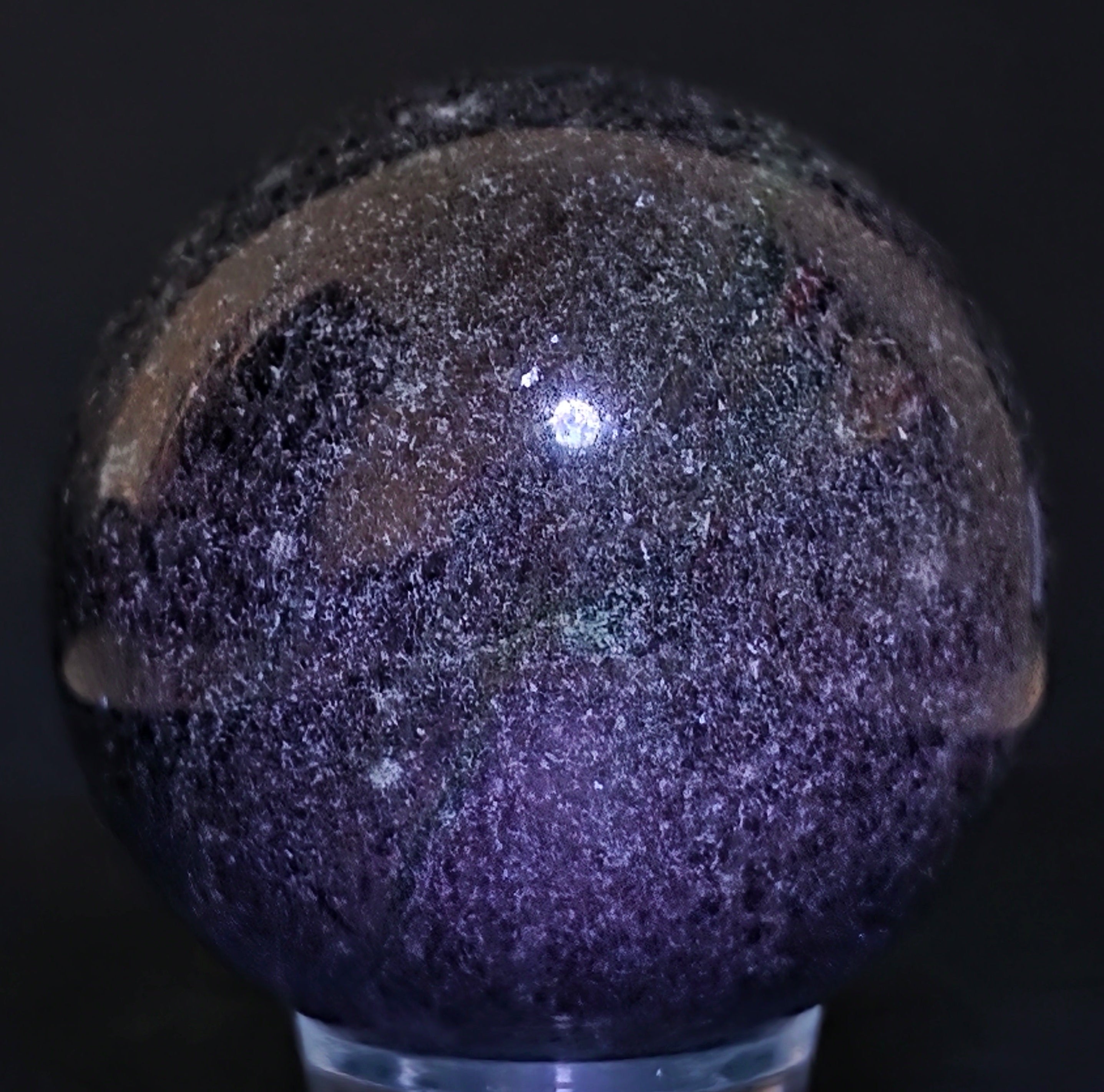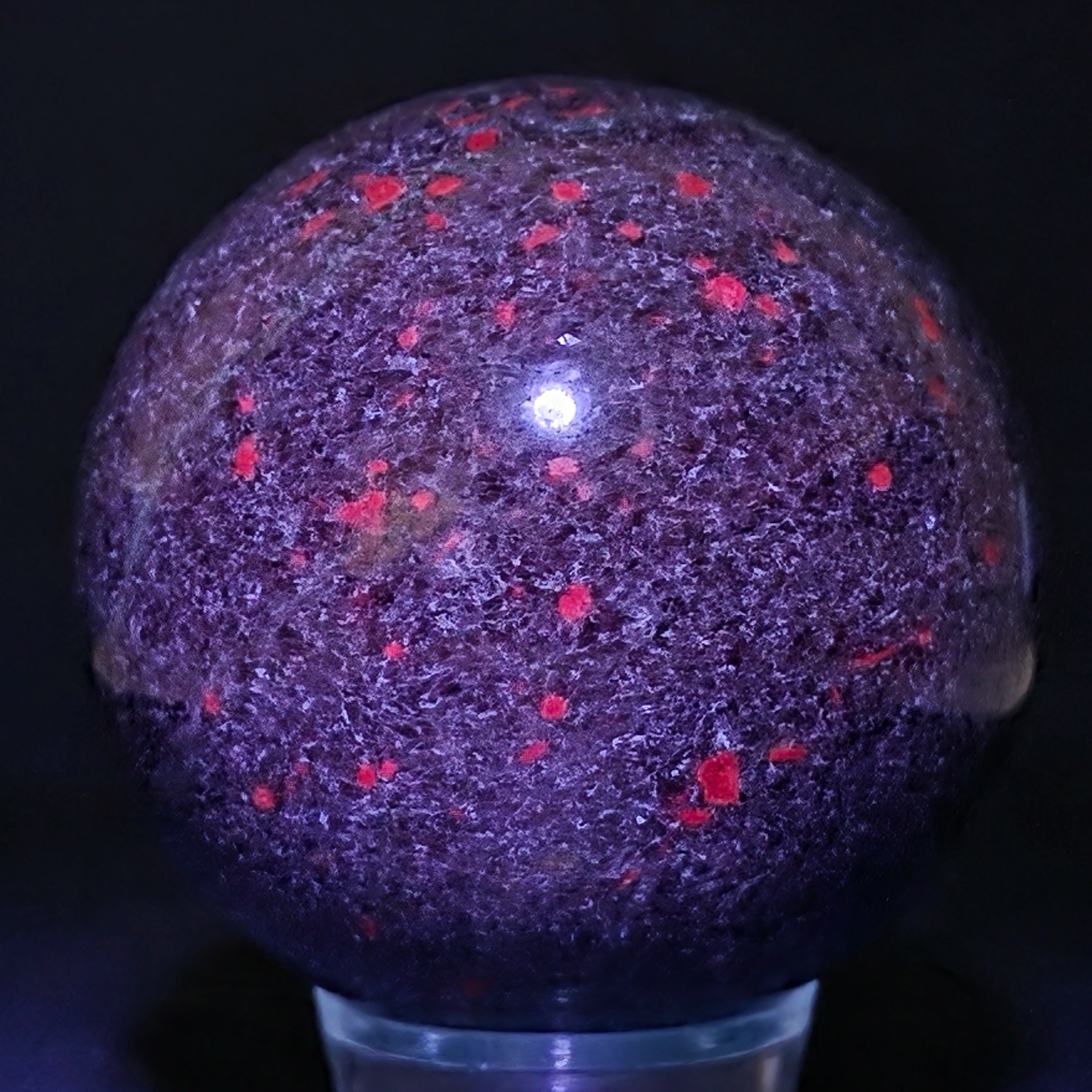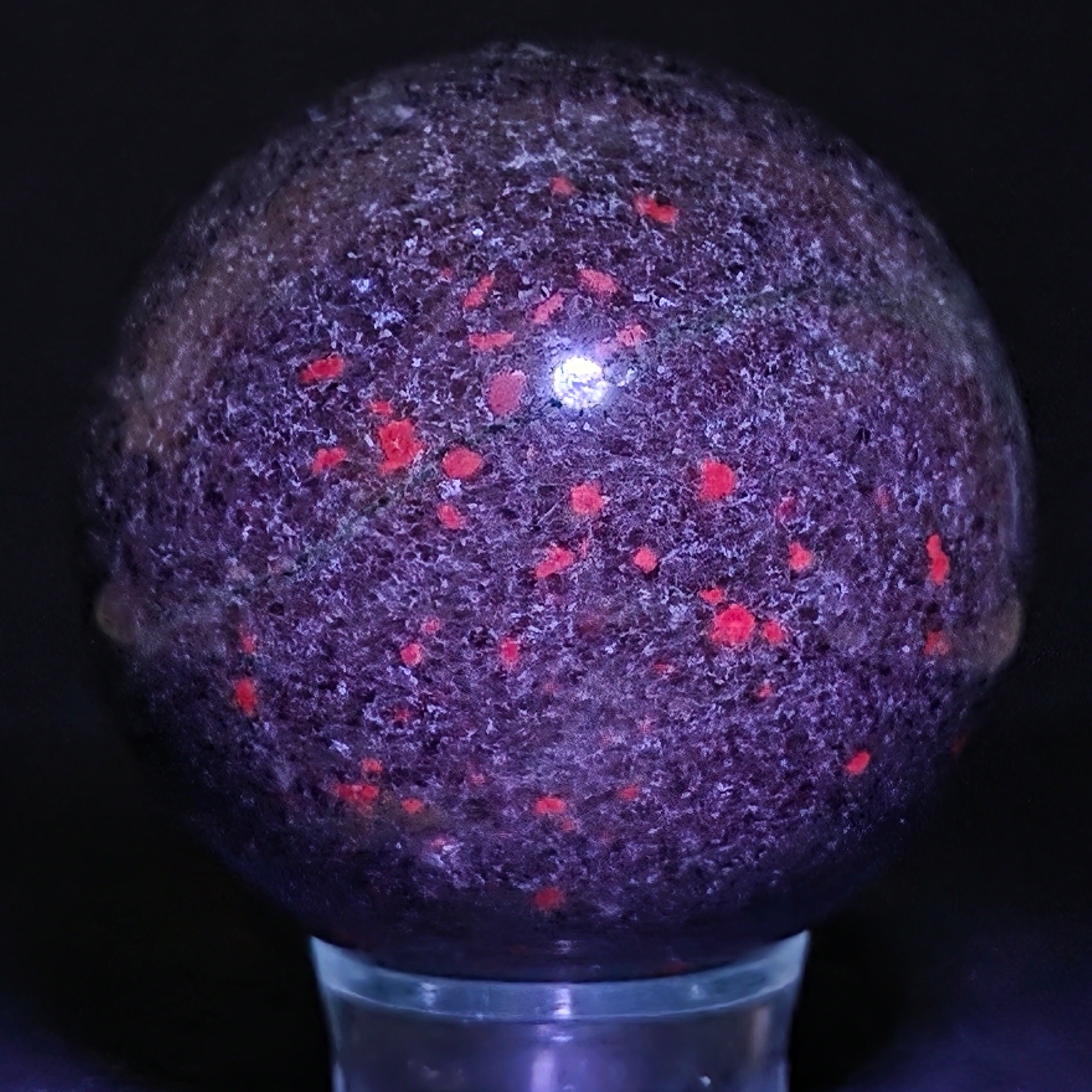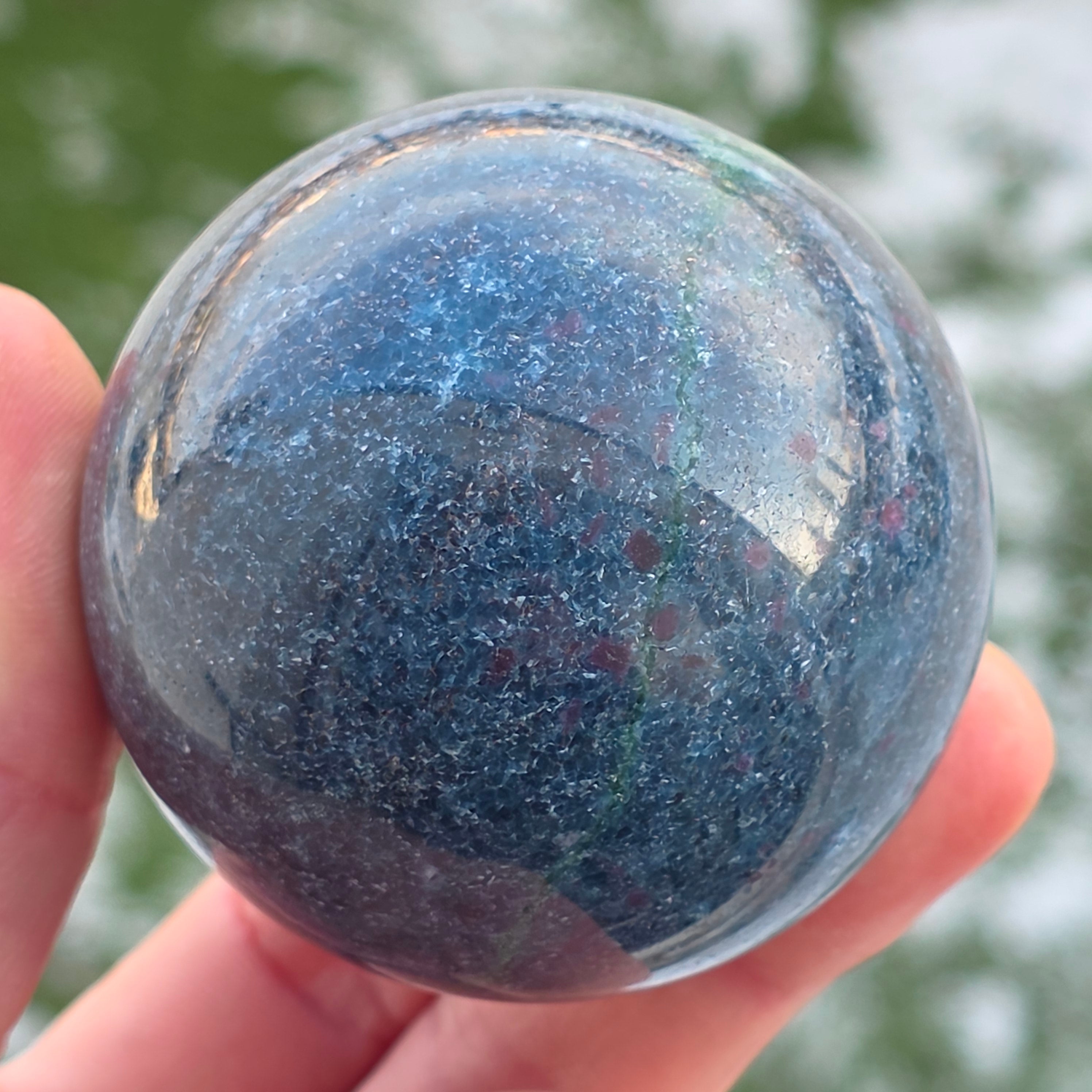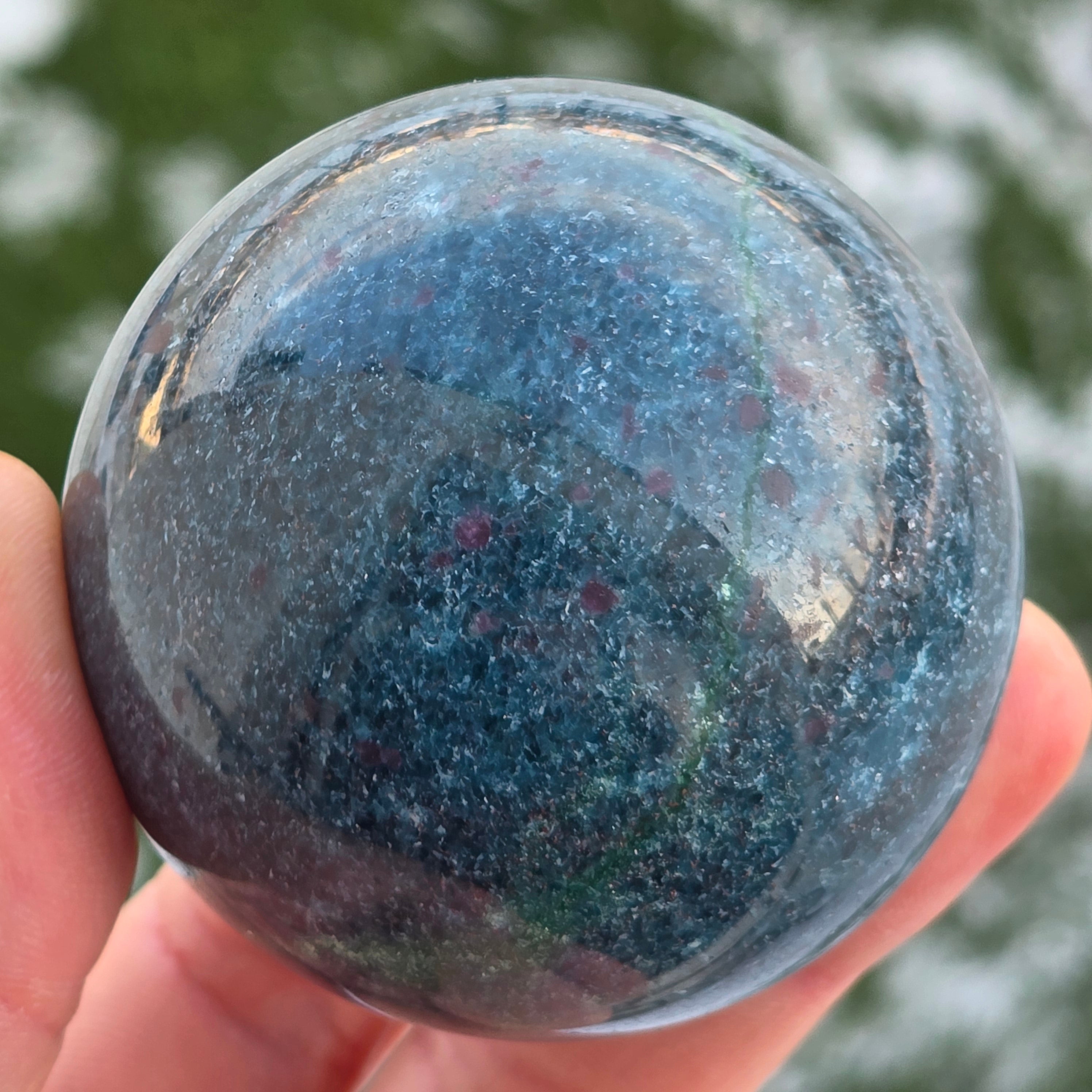 Die Rubin-in-Fuchsit-Sphäre mit Kyanit vereint drei komplementäre Energien: die Vitalität des Rubins, die regenerierende Ruhe des Fuchsits und die Klarheit des Kyanits. Die Kugelform unterstützt das Gleichgewicht zwischen Leidenschaft, Ruhe und authentischem Ausdruck und wird mit der Harmonisierung der Emotionen und der Stärkung der Verbindung zwischen Herz und Geist in Verbindung gebracht.