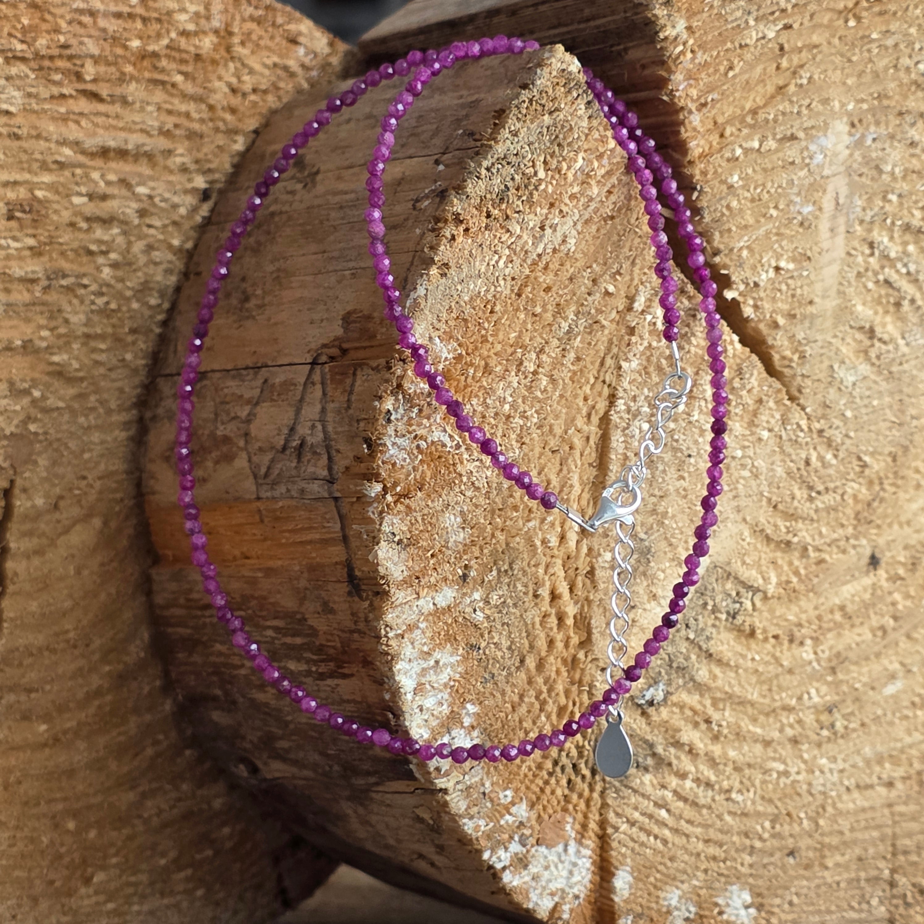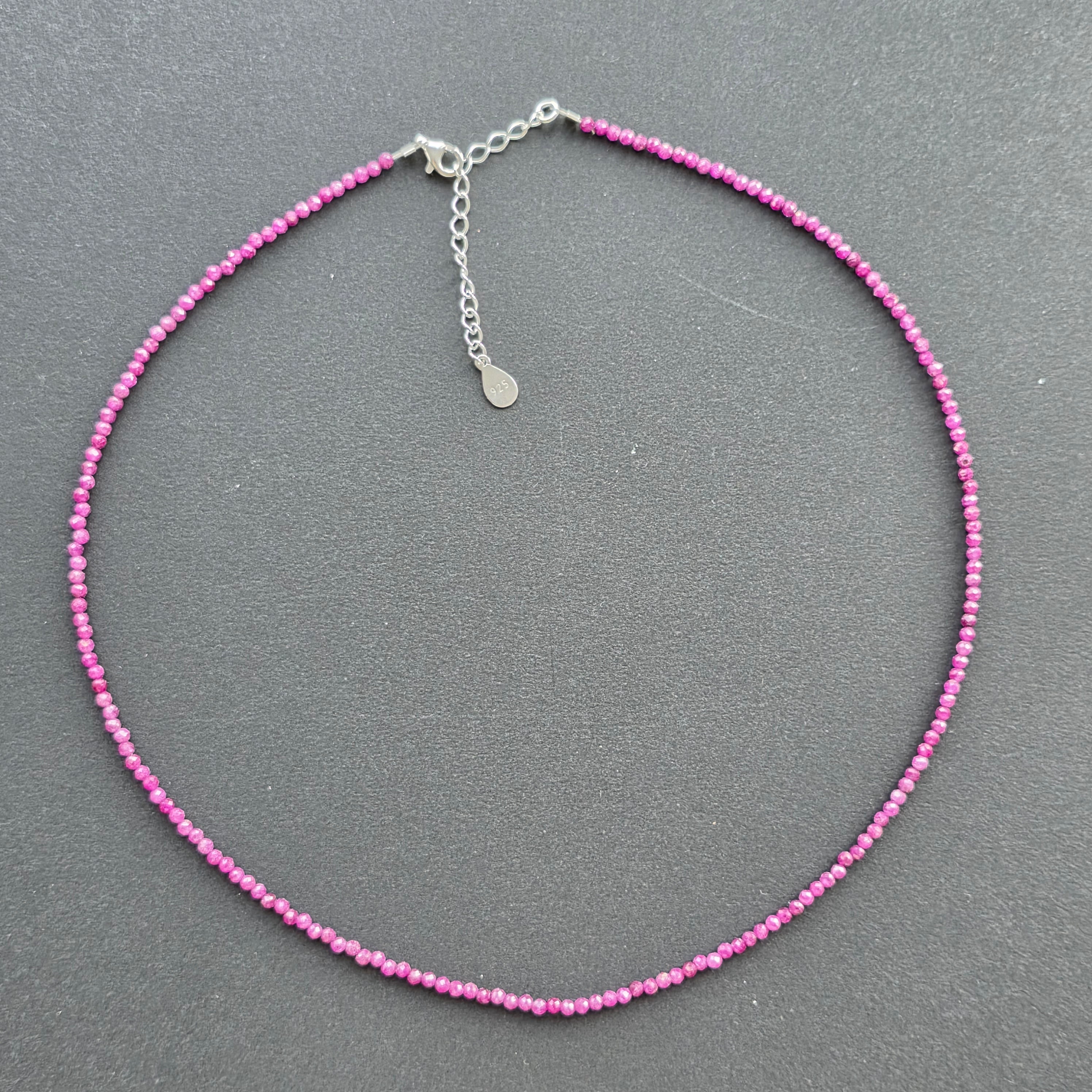 Eine feine, aber präsente Kette, gefertigt aus facettierten Kugeln aus natürlichem Rubin von 2,5 mmin einem tiefen intensiven Weinrotmit warmen und fast königlichen Reflexen. Jede kleine, stille Perle reflektiert das Licht dezent, wie ein Flüstern von Leidenschaft, Absicht und innerer Noblesse.