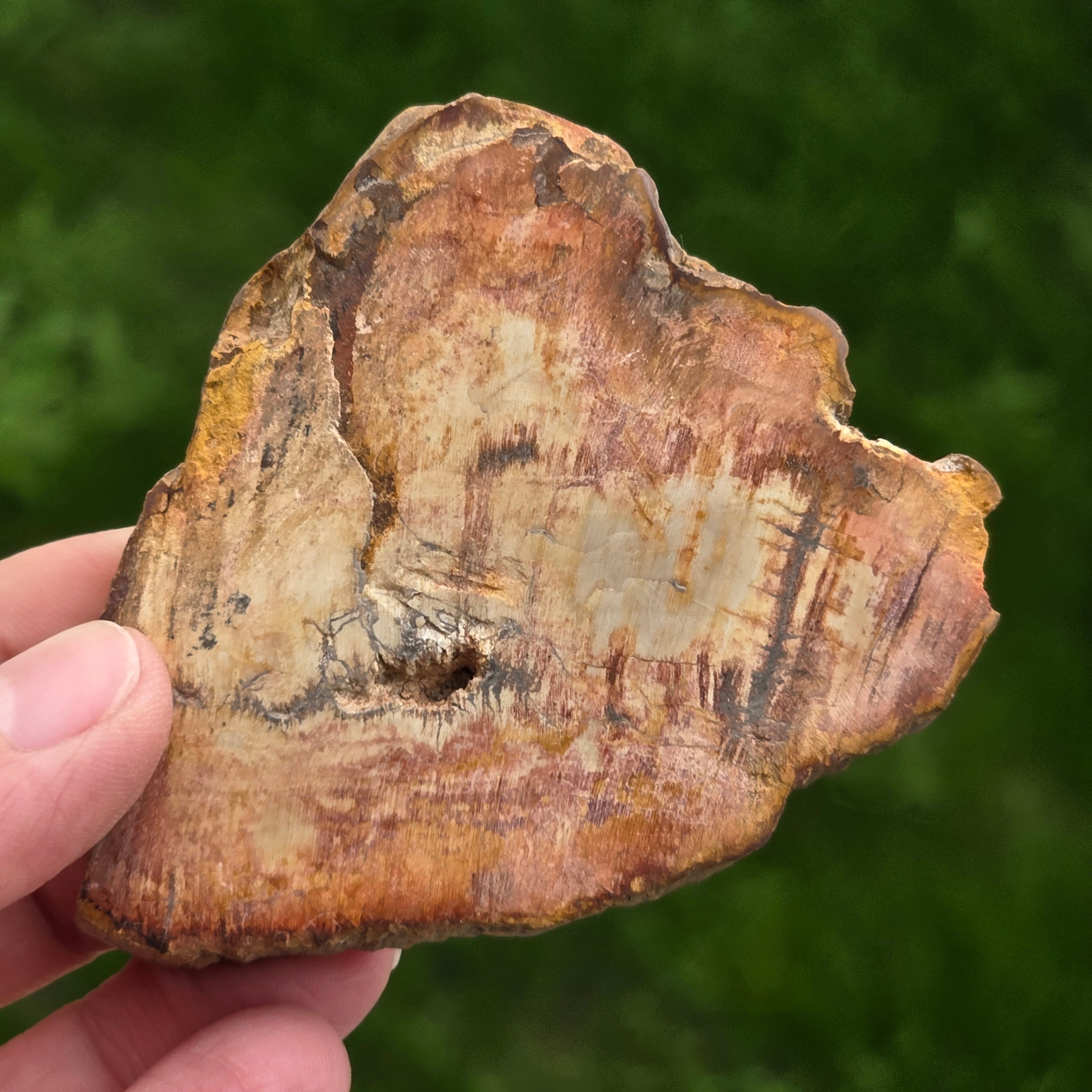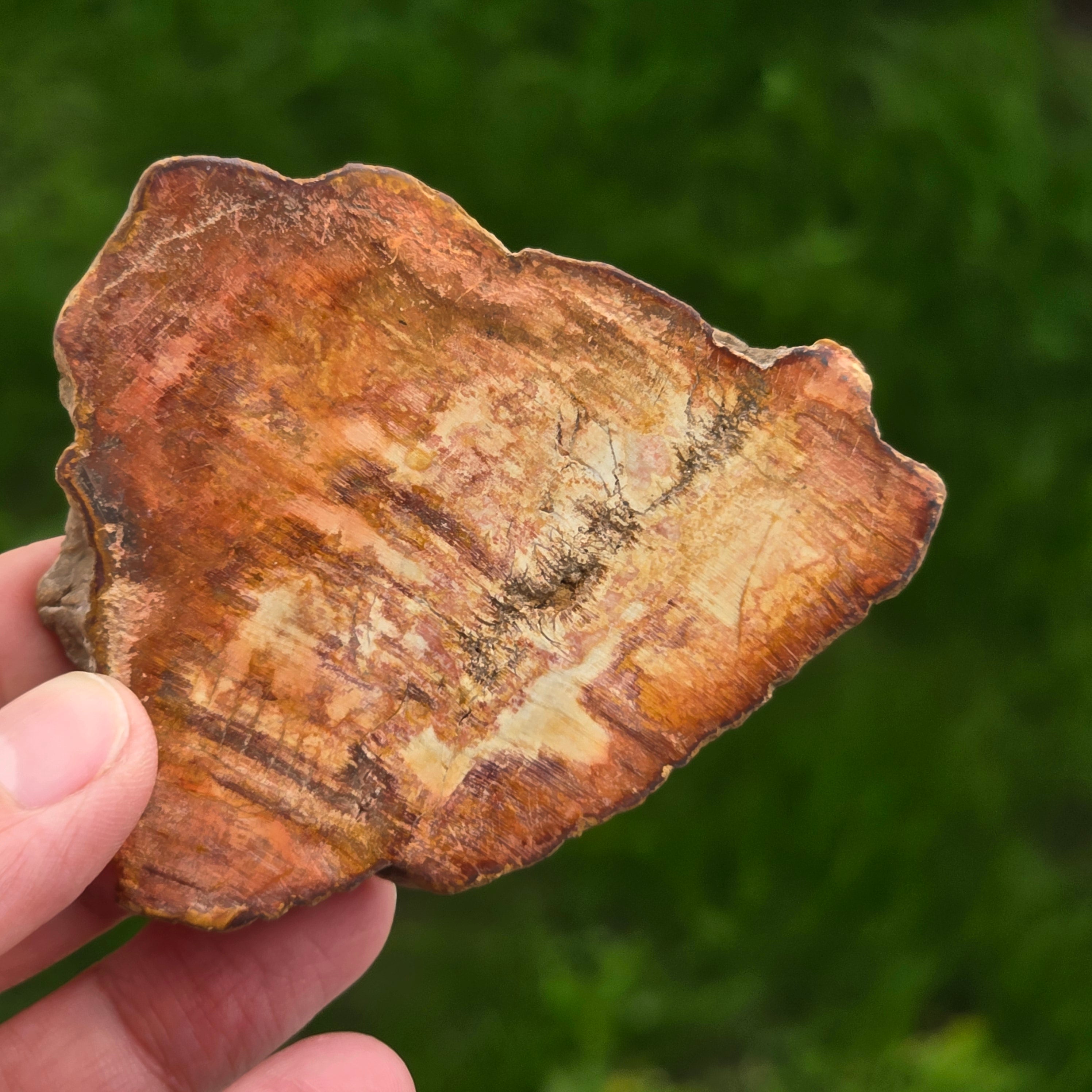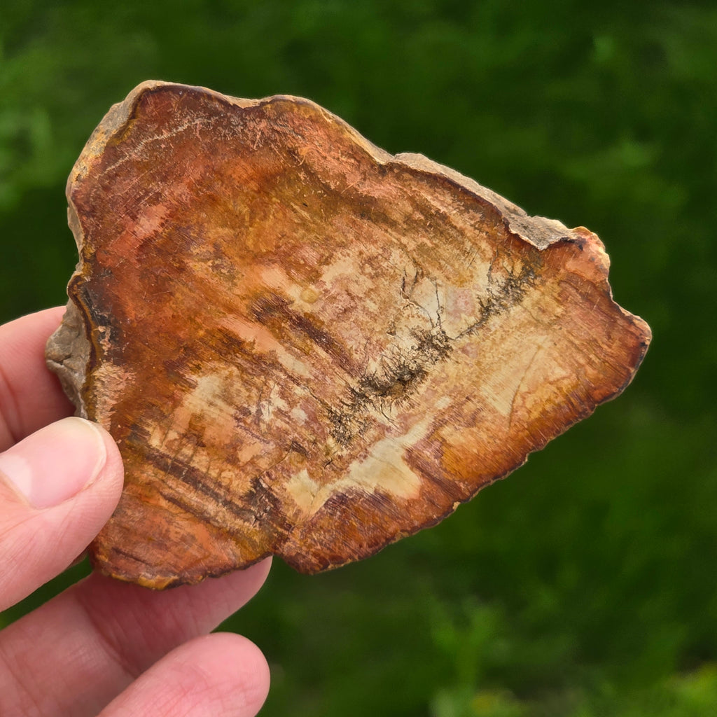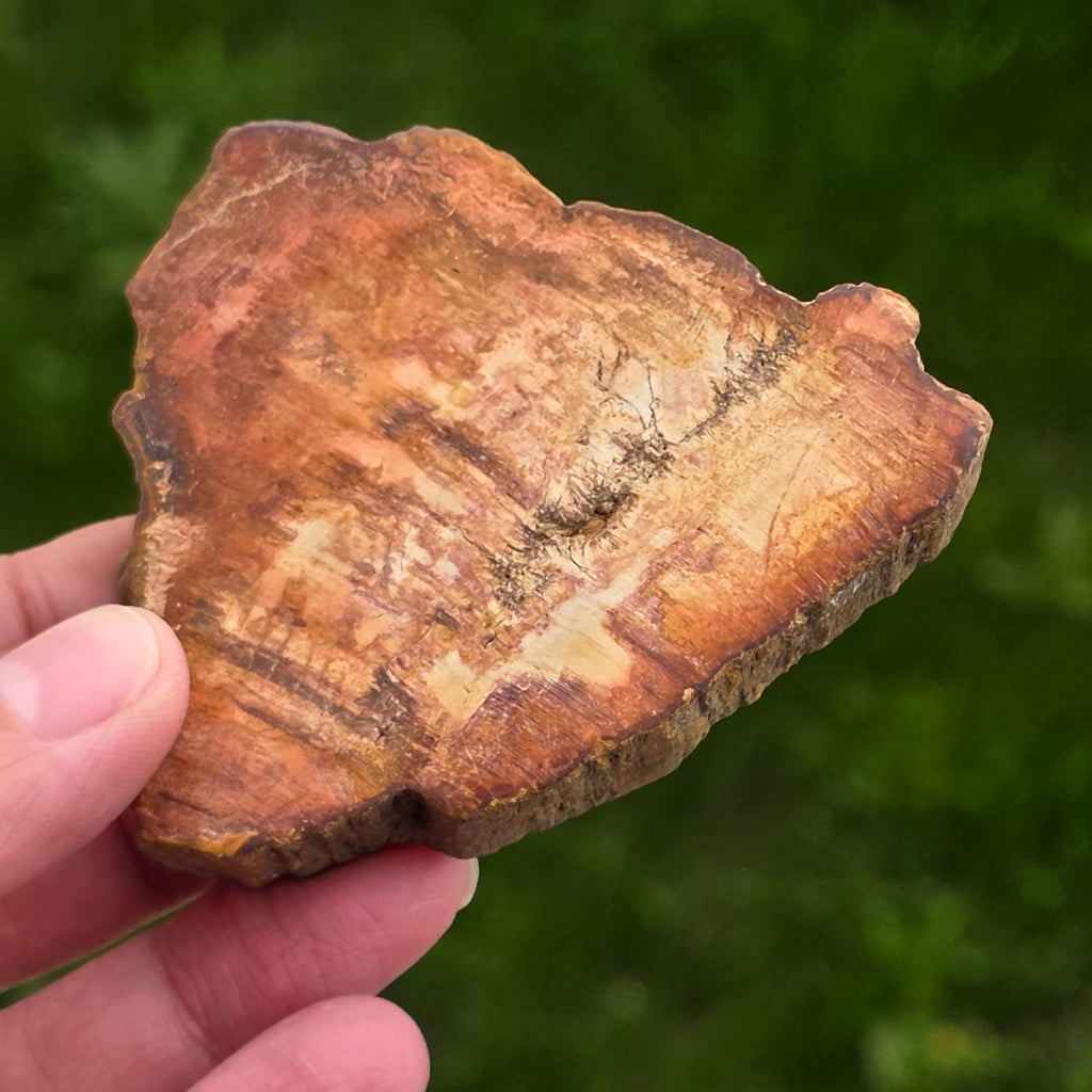 Im Laufe der Zeit entwickeln sich die Farben von versteinertem Holz aufgrund mineralischer Verunreinigungen: Eisen fügt rotes oder orange, Mangan mit schwarzen und lila Tönen und Kupfer kann grüne oder blaue Akzente einführen. Obwohl es Holz auf den ersten Blick scheint, ist dieser Stein völlig mineralisiert, mit einem MOHS -Härte von ca. 6,5 - 7ähnlich wie der Quarz.