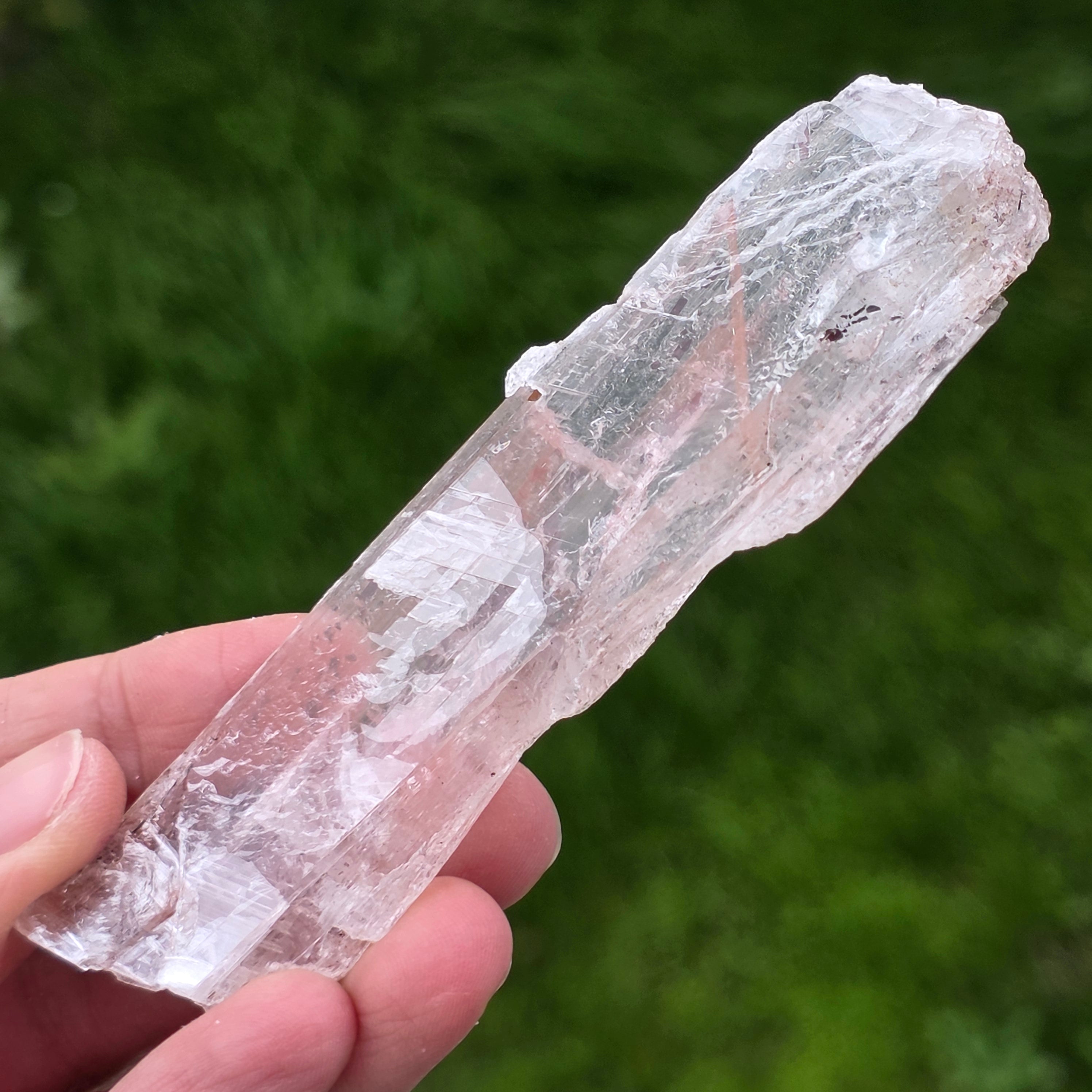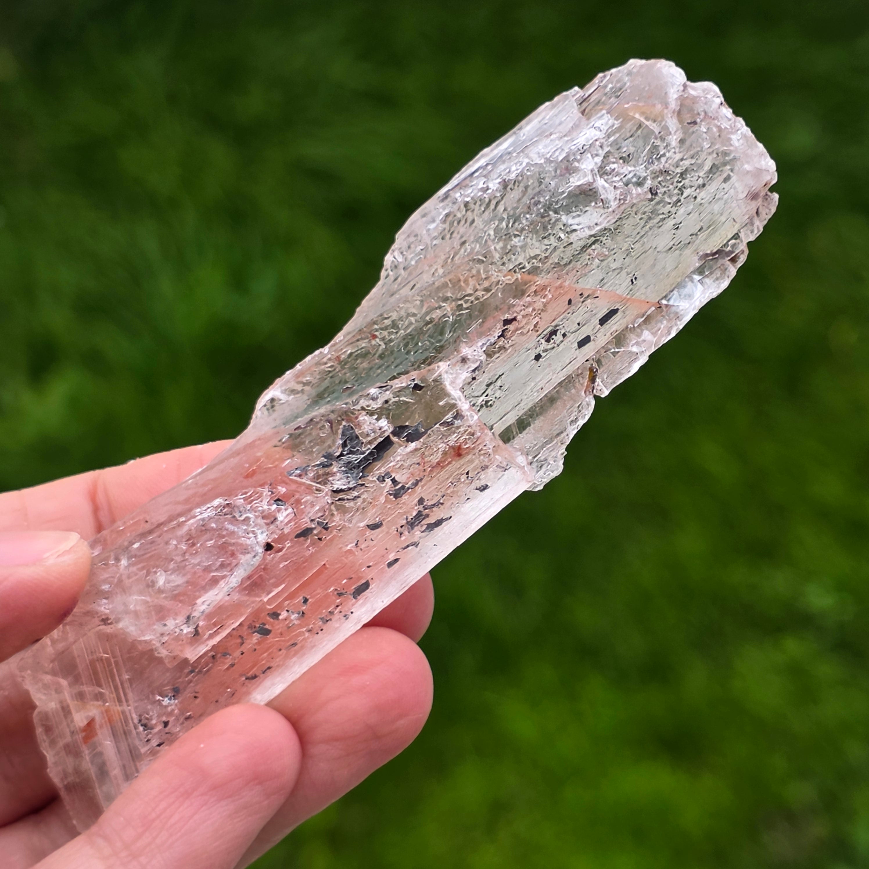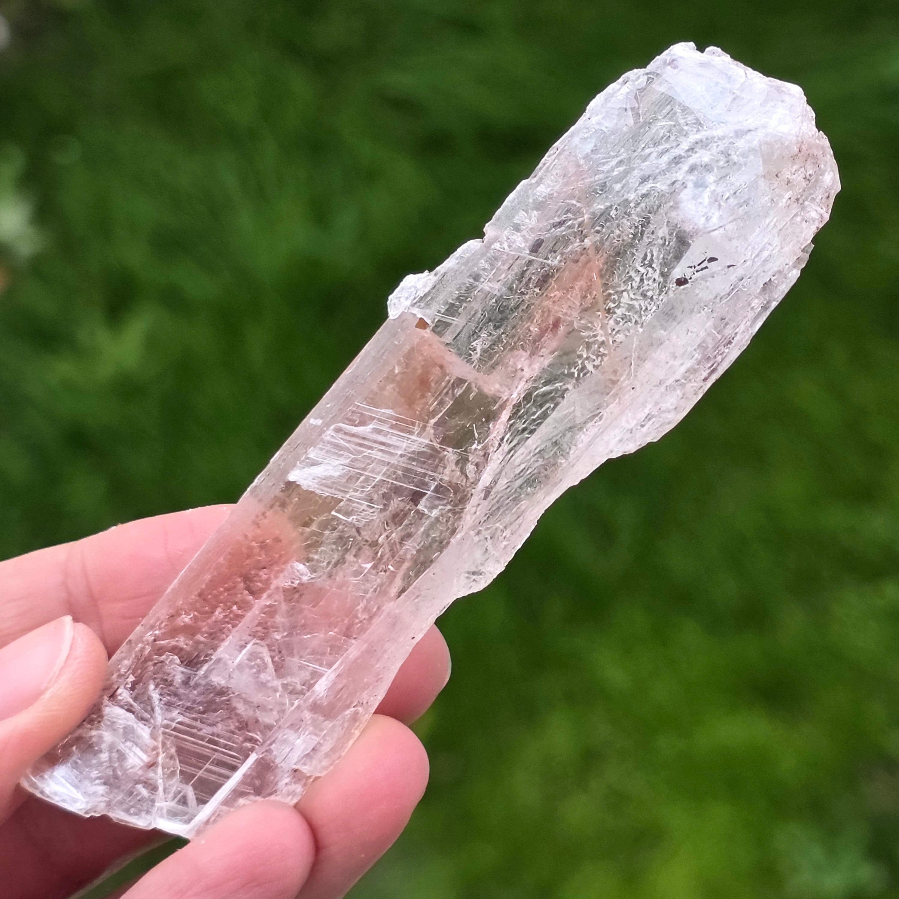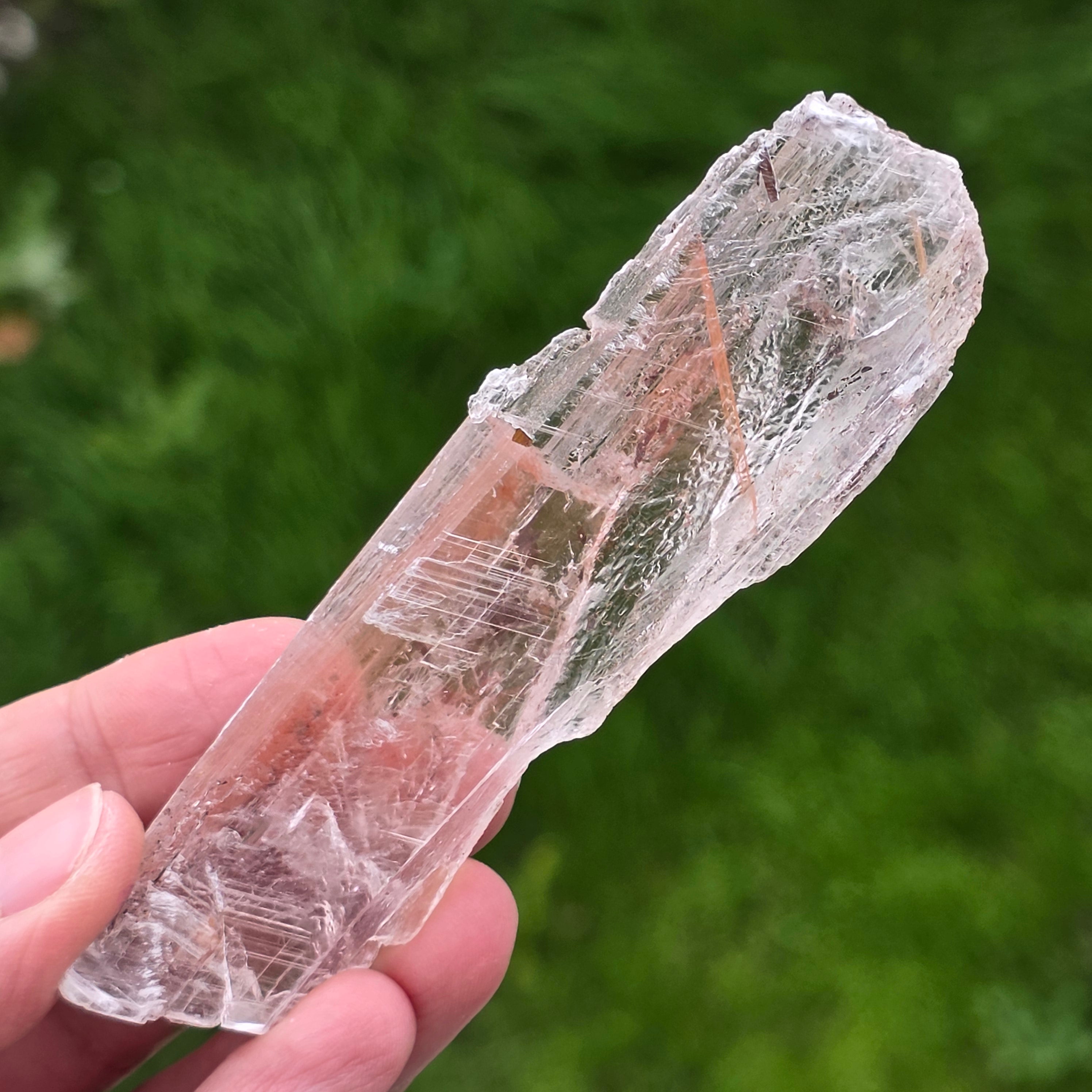 Selenitul apare sub formă de cristale alungite sau plăci translucide, cu luciu mătăsos și textură fină, în timp ce hematitul este prezent sub formă de incluziuni, pelicule sau depuneri naturale, care accentuează structura cristalului și îi conferă profunzime vizuală.
