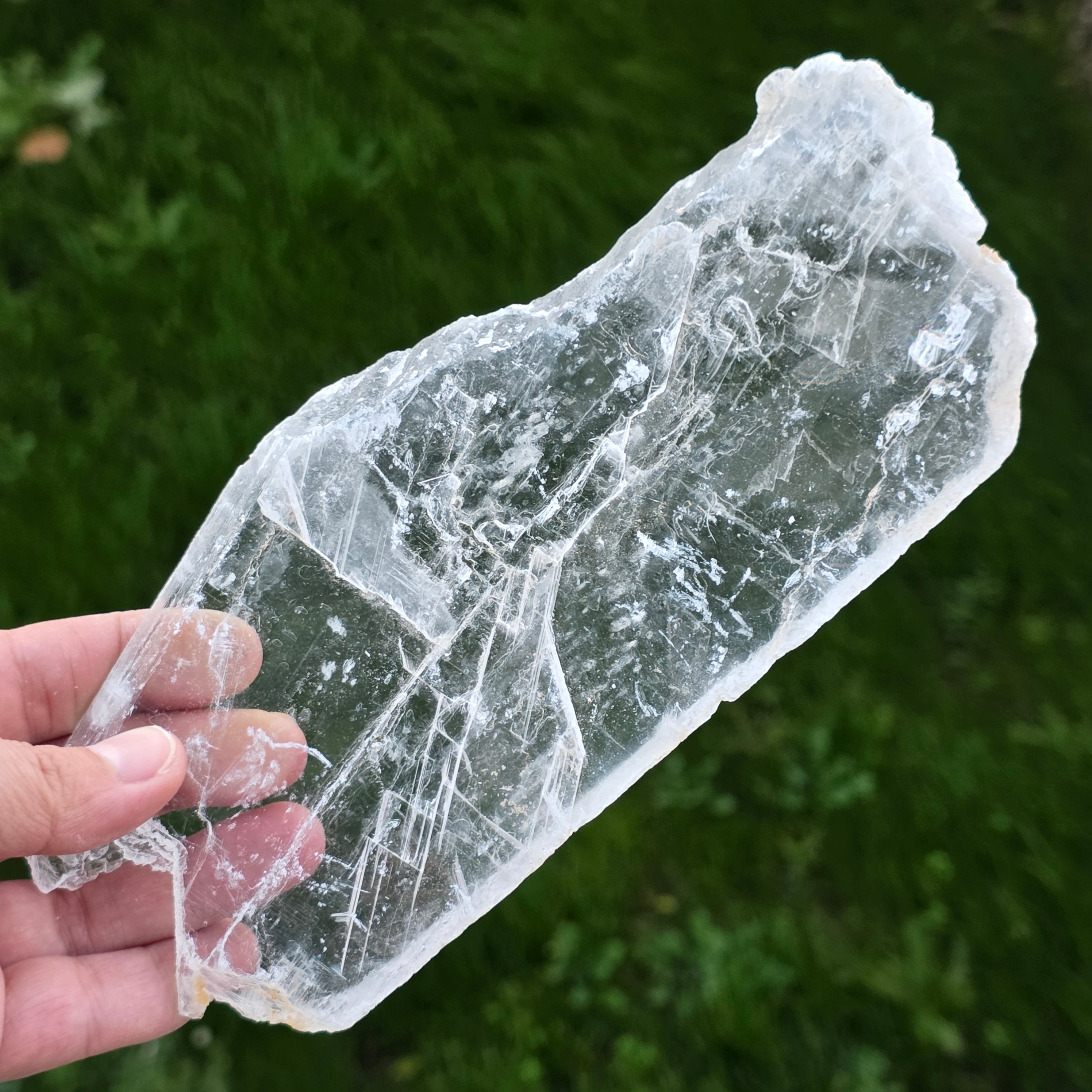 Dieses hier glasiger Selenit-Rohstein es scheint von einem Fragment aus erstarrtem Licht gelöst zu sein. Seine durchscheinenden Schichten und durchsichtigen Reflexionen fangen das Licht in einem subtilen Tanz ein und vermitteln ein Gefühl von Reinheit und Frieden.