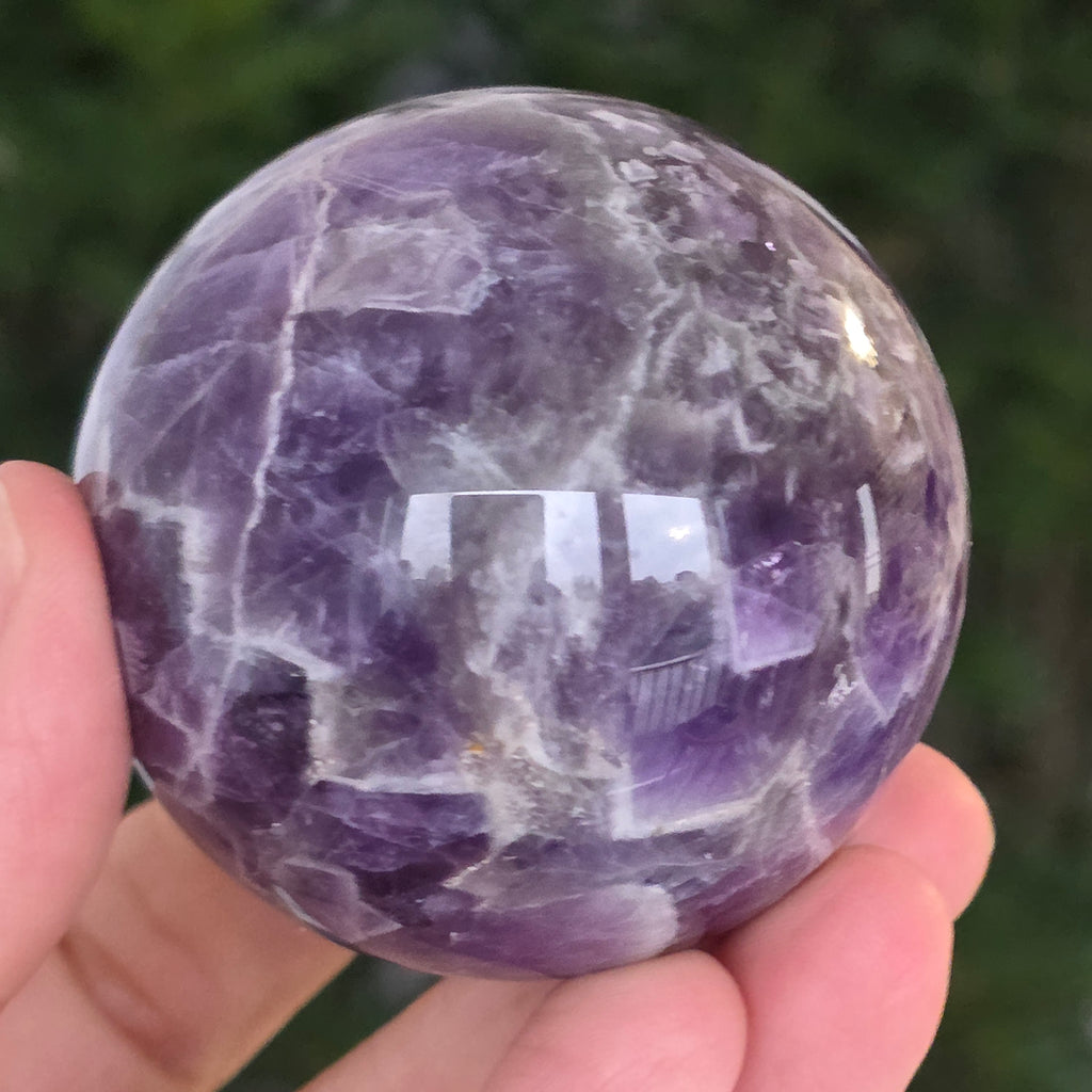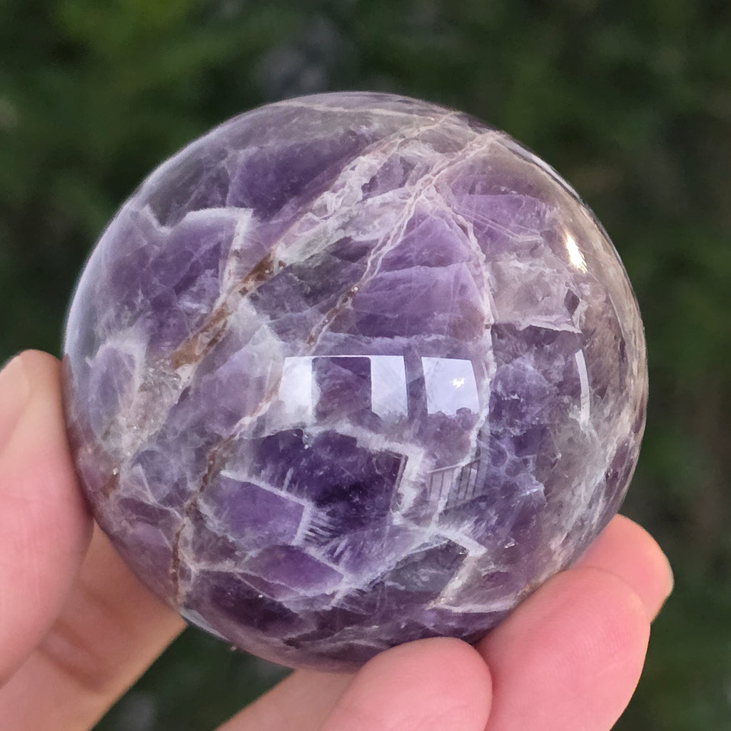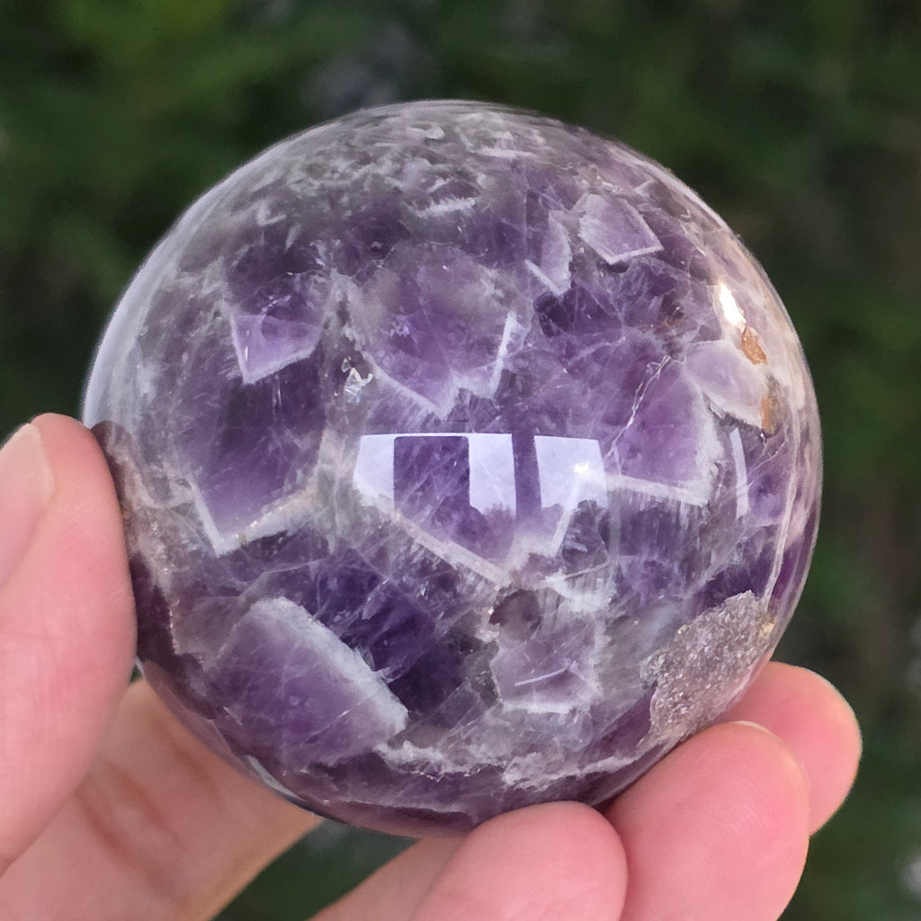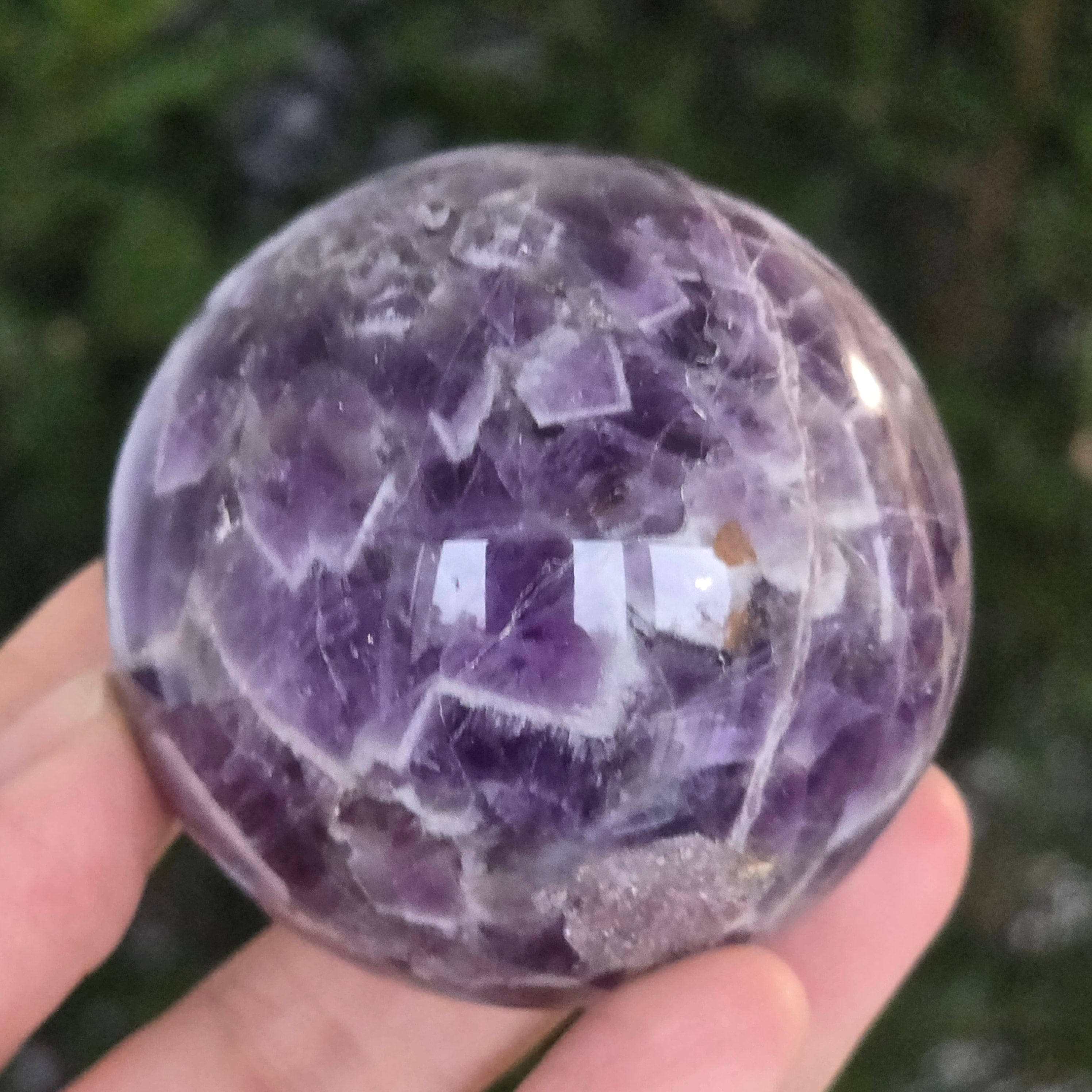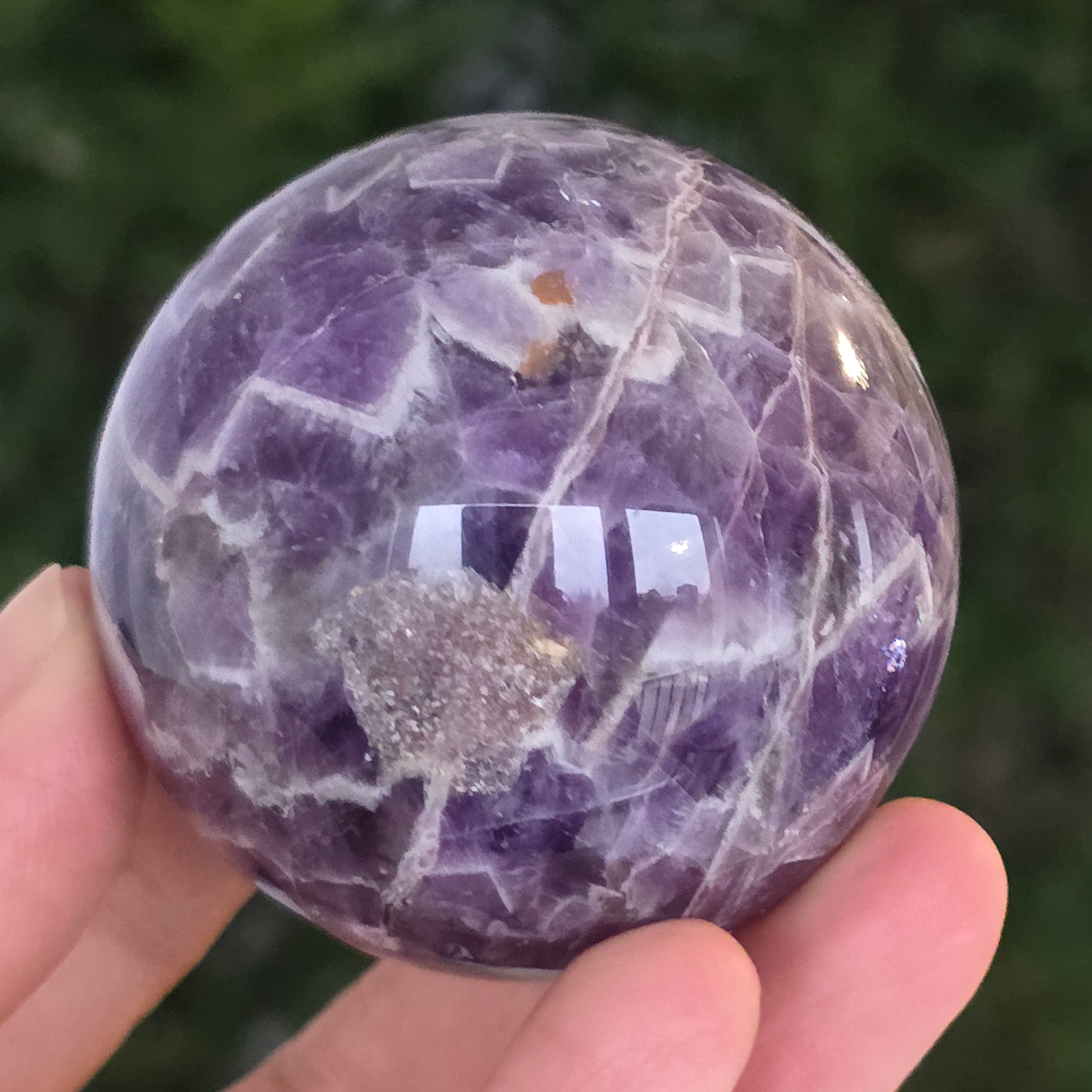 O sferă ce pare să concentreze în interior lumina unei nopți liliachii. Această piesă unicat din ametist chevron natural, dezvăluie straturi uimitoare de violet, alb și lavandă, dispuse în forme în V – semnul distinctiv al acestei varietăți rare de ametist. Suprafața perfect șlefuită, catifelată la atingere, oglindește lumina cu o finețe hipnotică, aducând liniște și rafinament în orice spațiu.