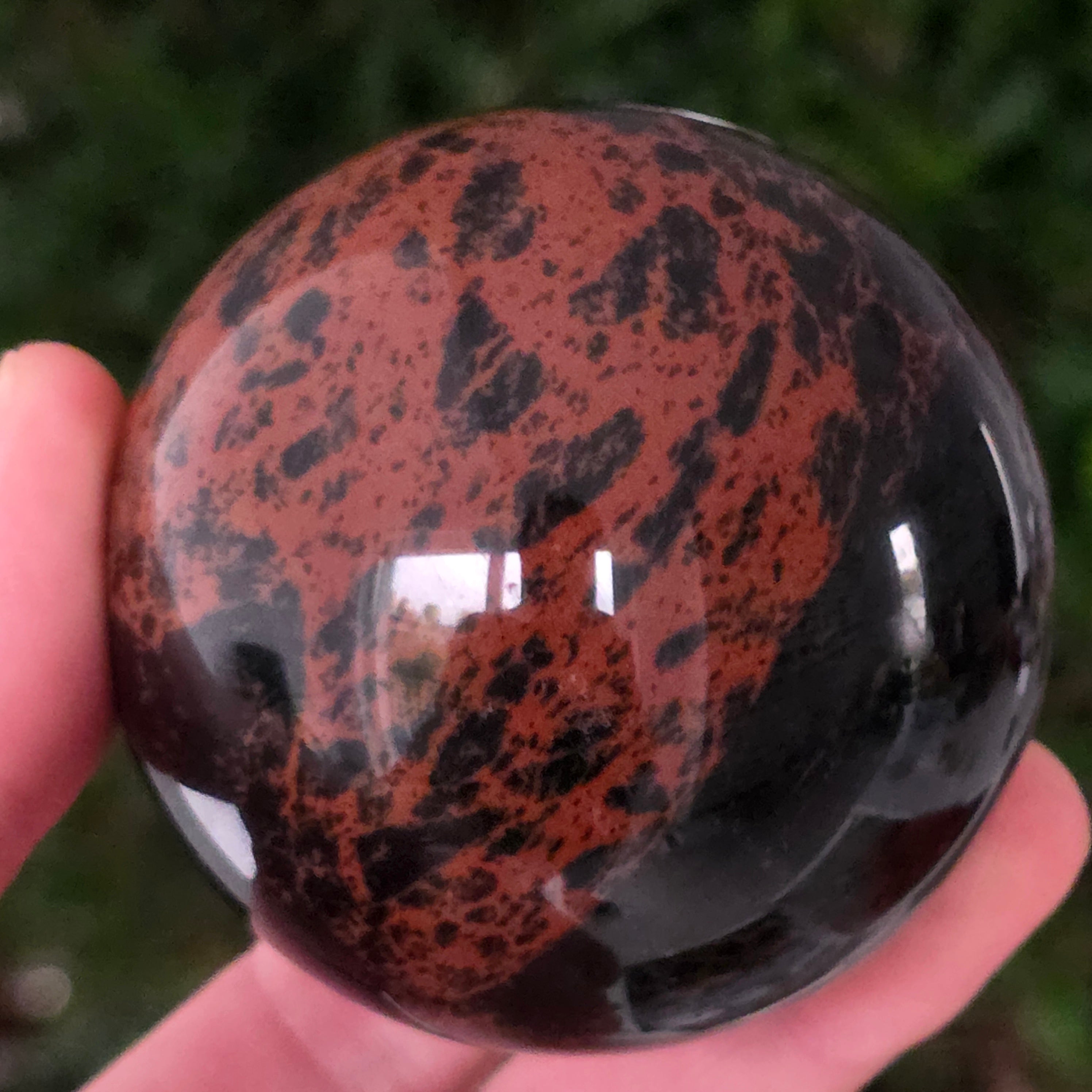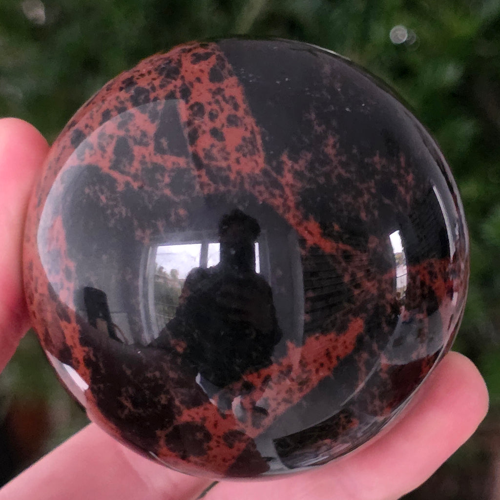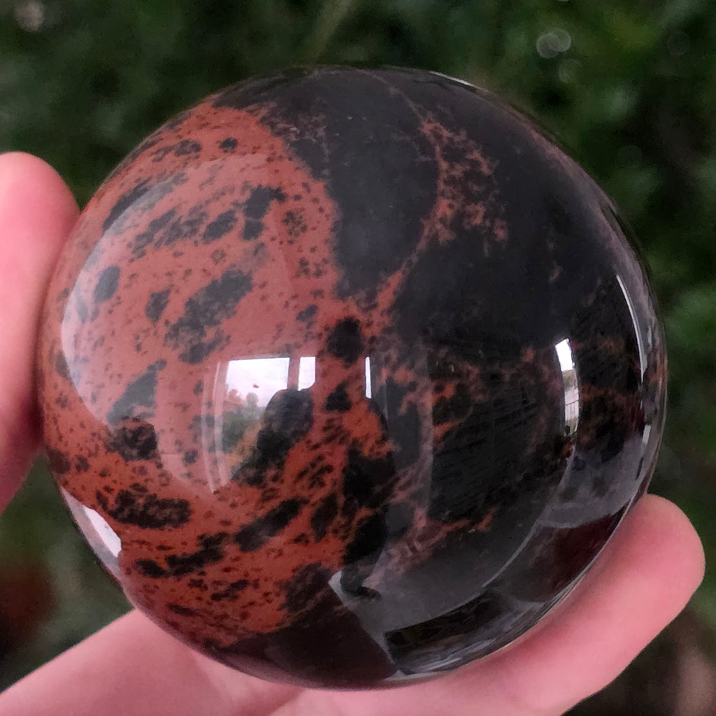 Această sferă din obsidian mahon este o întrupare a forței primordiale a Pământului — o piatră a rădăcinilor, a siguranței și a transformării interioare.