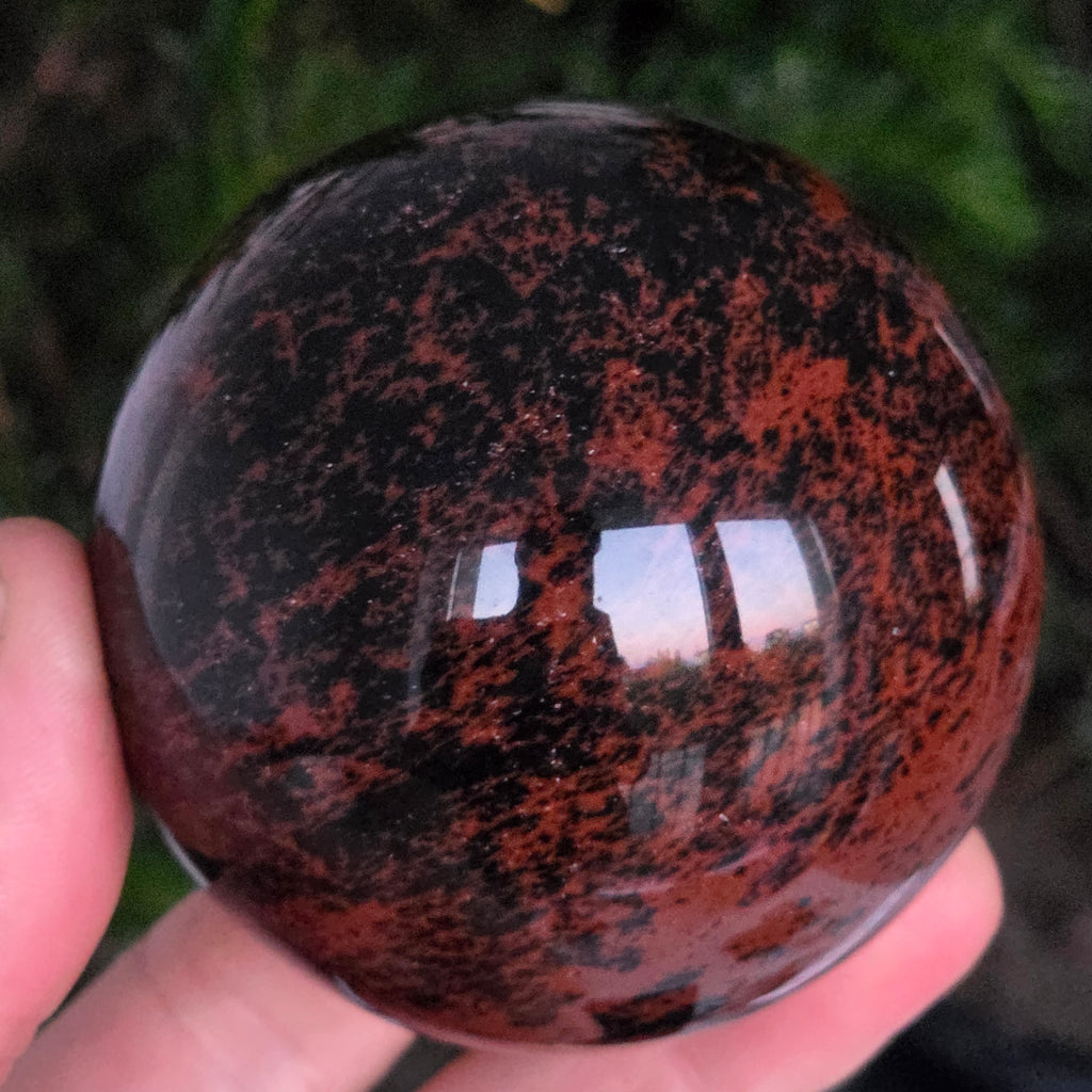 Această sferă din obsidian mahon este o întrupare a forței primordiale a Pământului — o piatră a rădăcinilor, a siguranței și a transformării interioare.