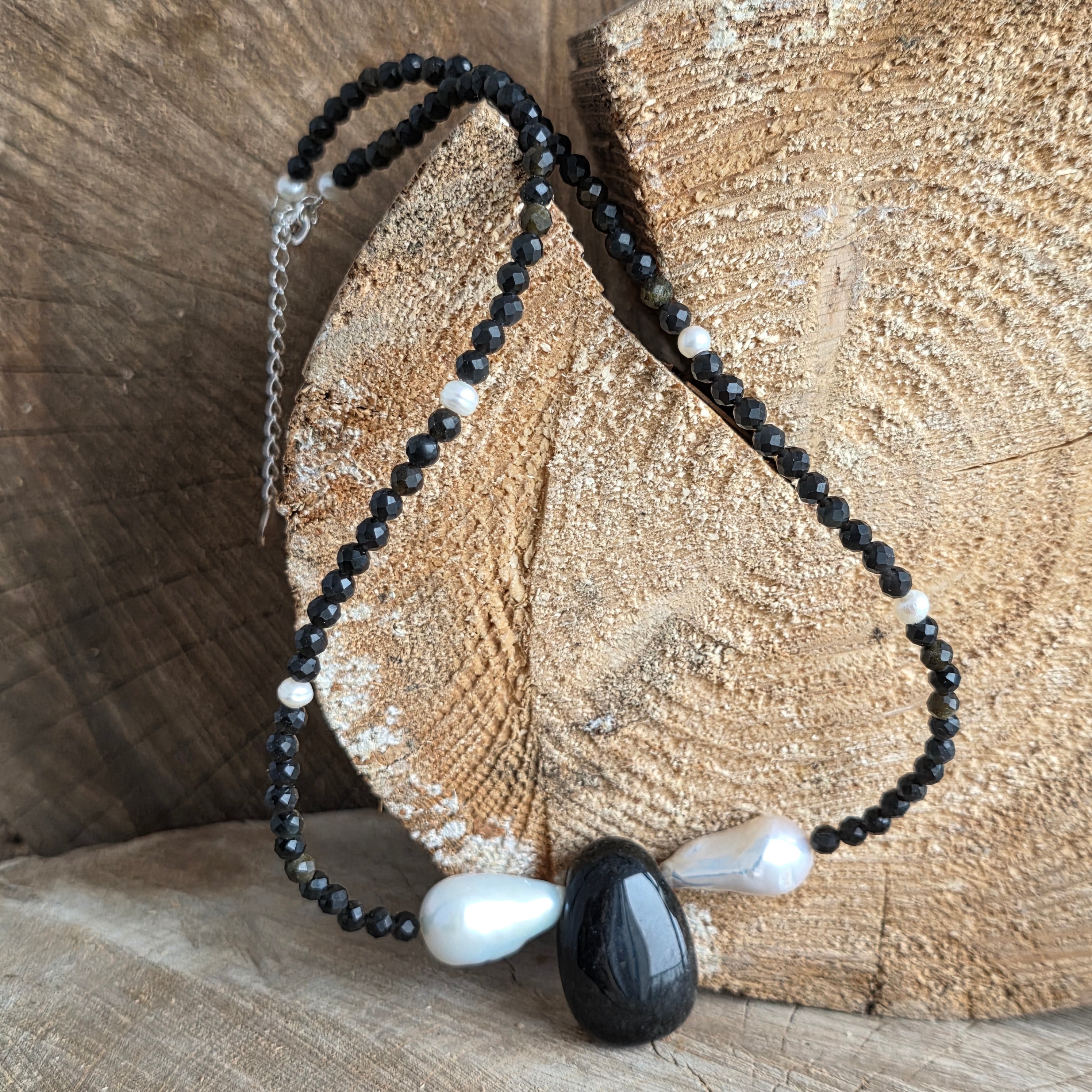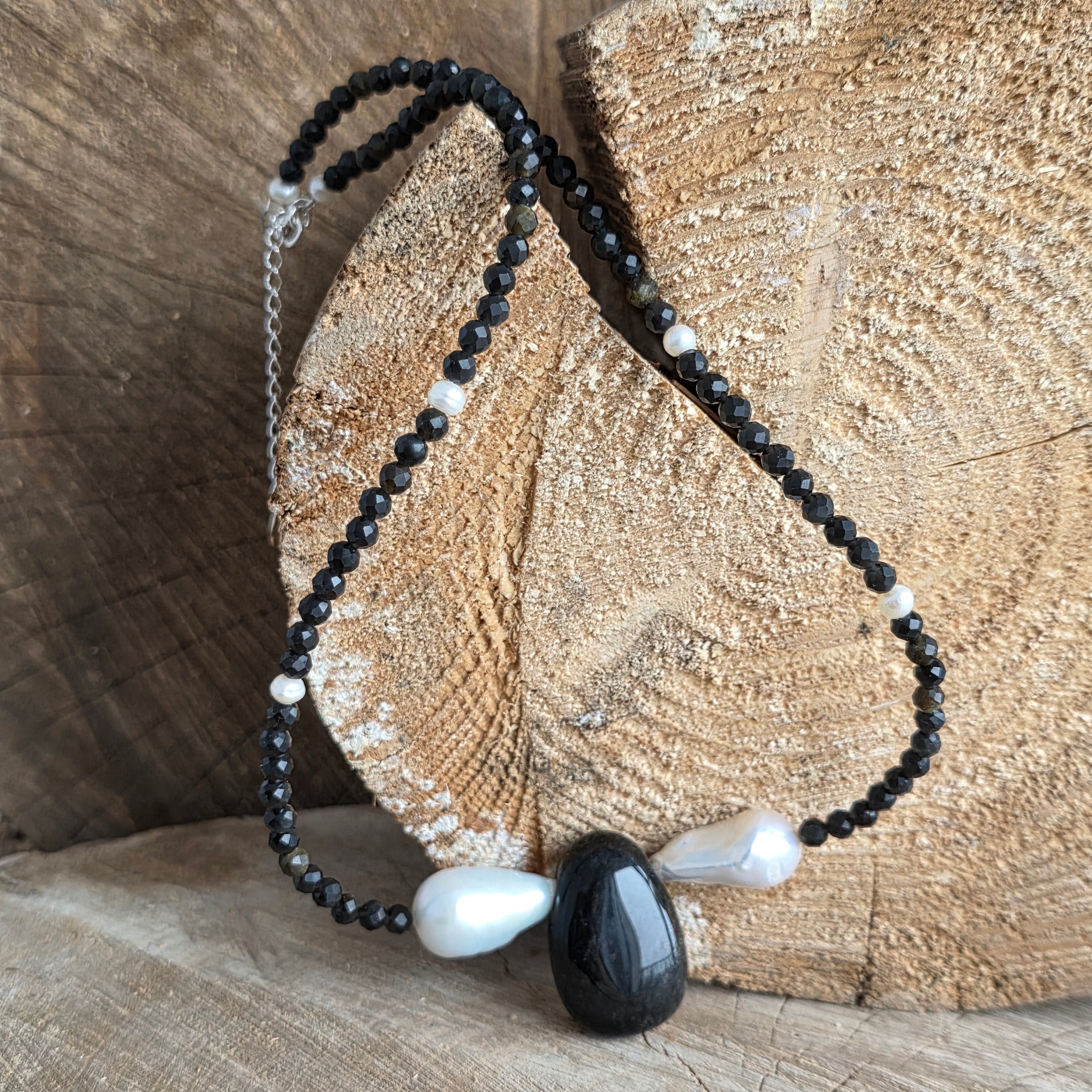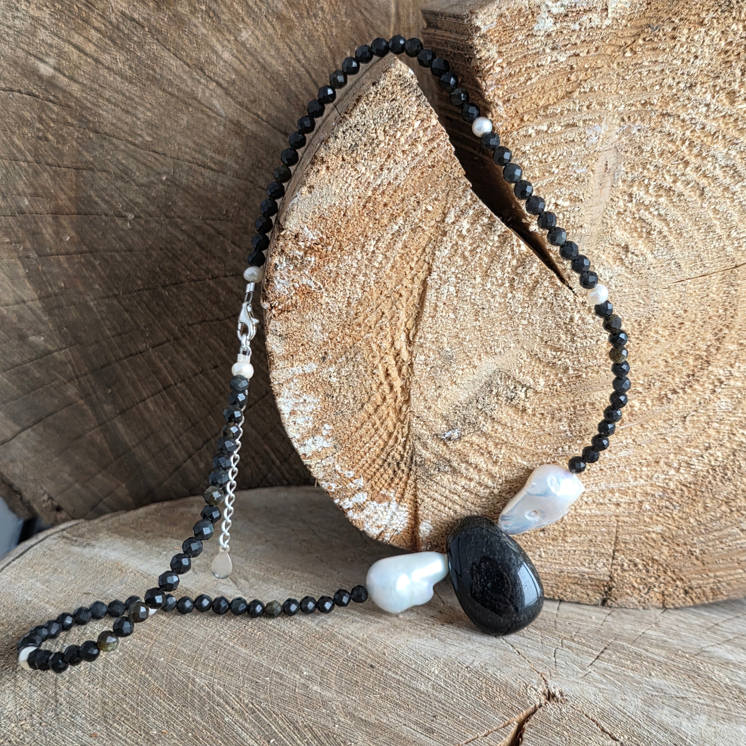 In der Mitte der Halskette ein Anhänger FALLEN 3 cm vom silbernen Obsidian fällt wie ein Schutz, tiefes und helles Siegel und bewache das Herz mit einer ruhigen und entschlossenen Präsenz. Zwei natürliche Perlen vervollständigen die Komposition mit Gnade und Ausgleichsnotizen - eine Vereinigung zwischen der Stärke der Erde und dem sanften Wasser.