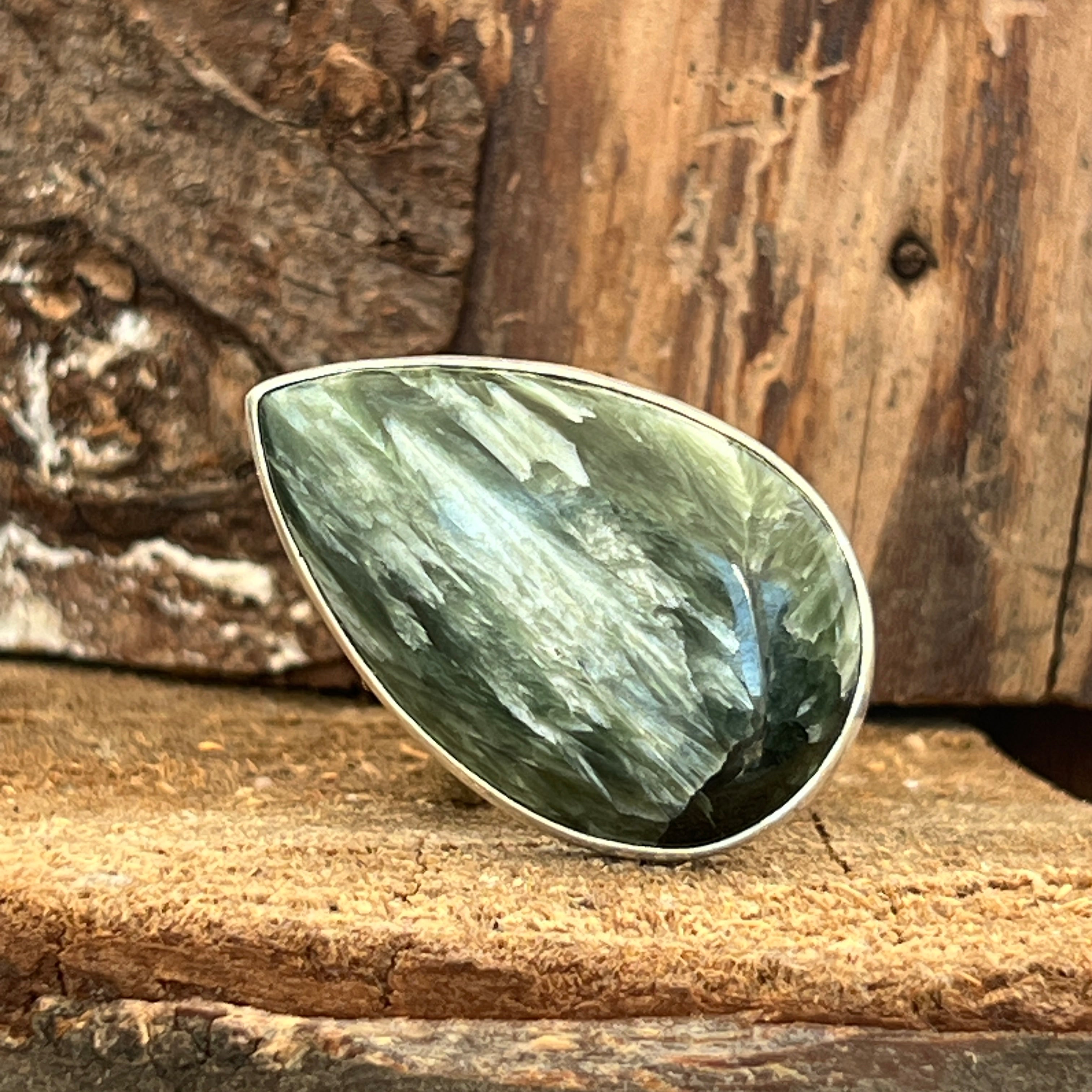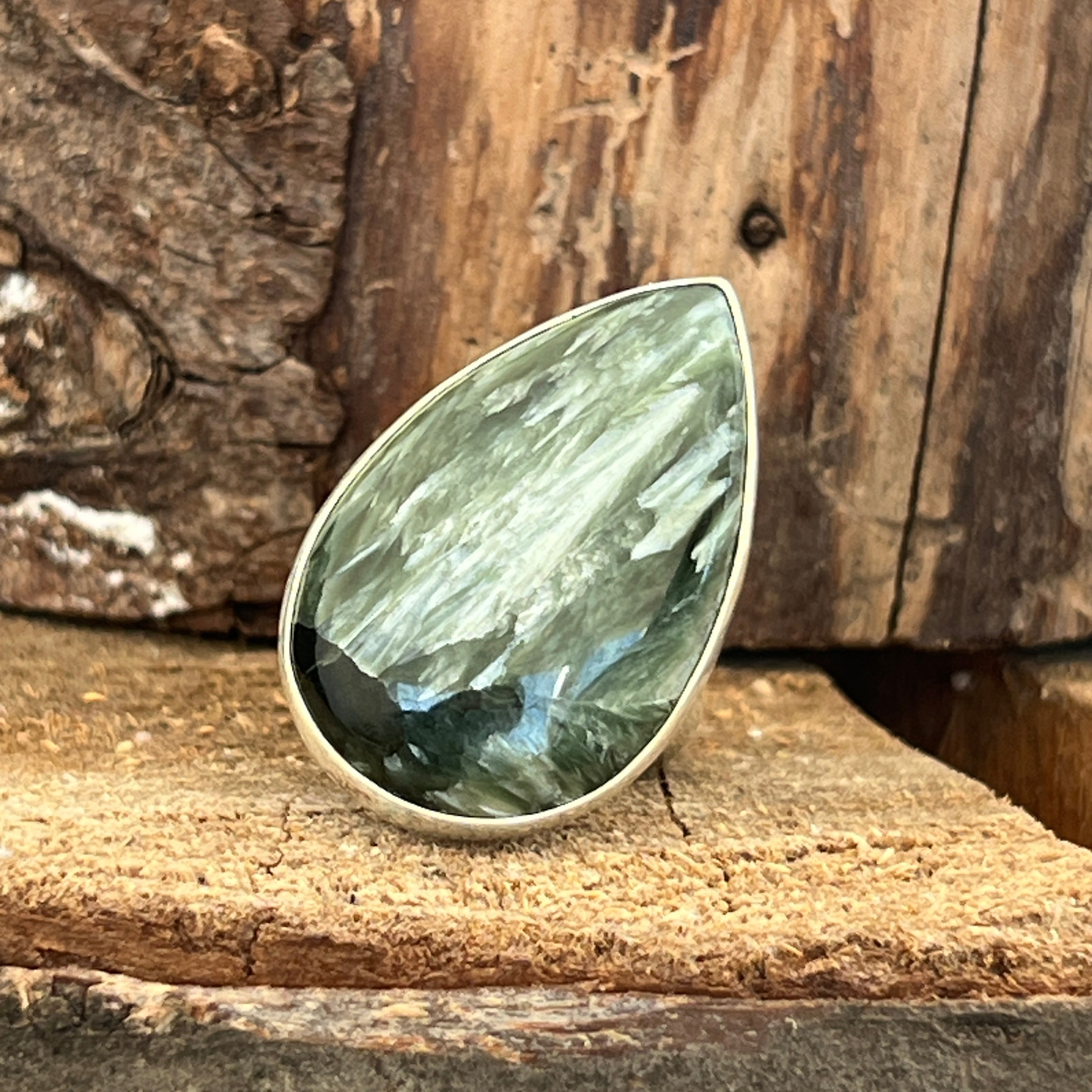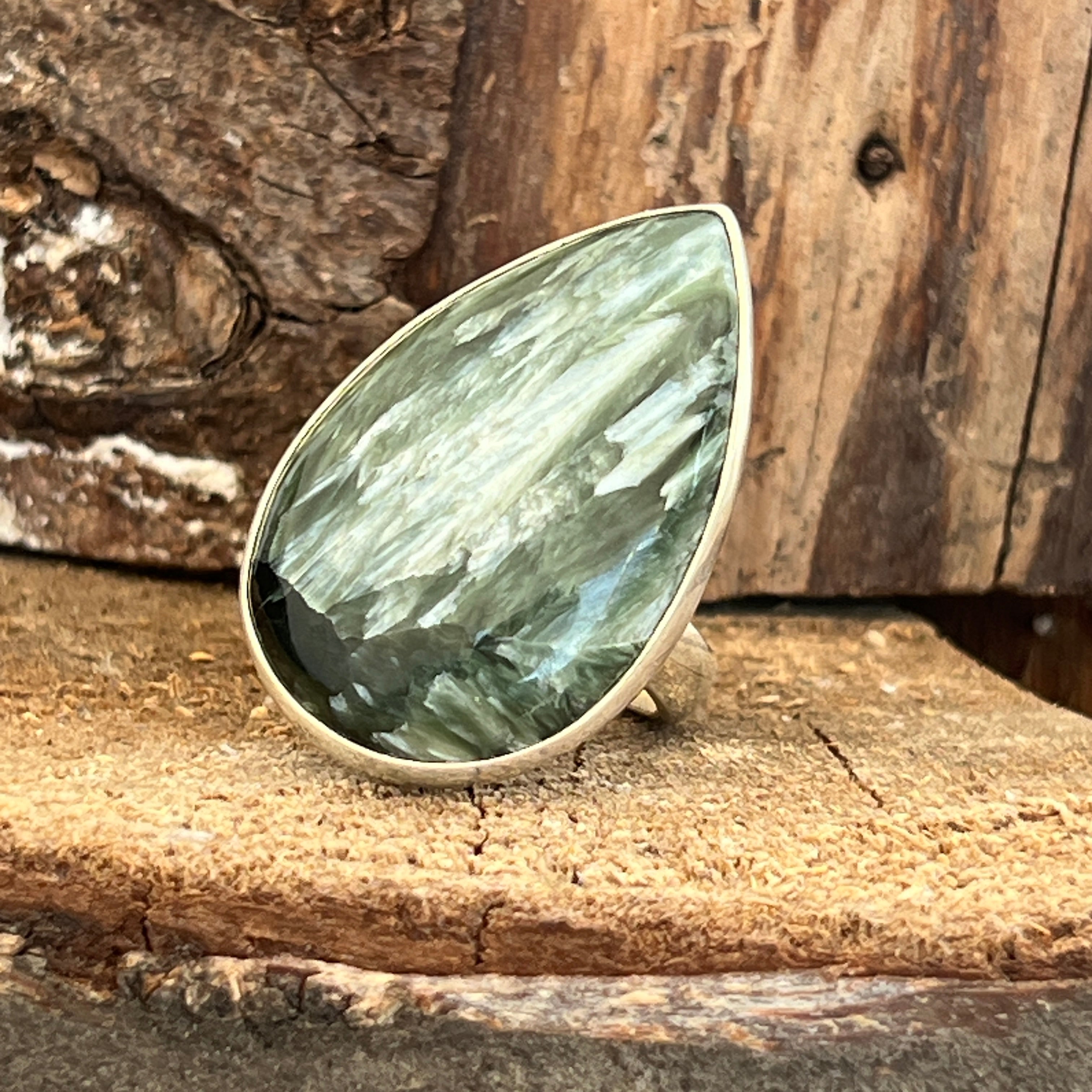 Serafinitul ist bekannt für seine subtilen grünen, harmonisch kombiniert mit silbernen oder weißen Streifen, die den Flügeln eines Engels ähneln. Diese Kombination von Farben und natürlichen Mustern erzeugt ein zartes und charmantes Erscheinungsbild im Schmuck. Serafinitus wird oft mit engelhaften und spirituellen Energien verbunden, die als Stein des göttlichen Lichts und der Liebe angesehen werden.