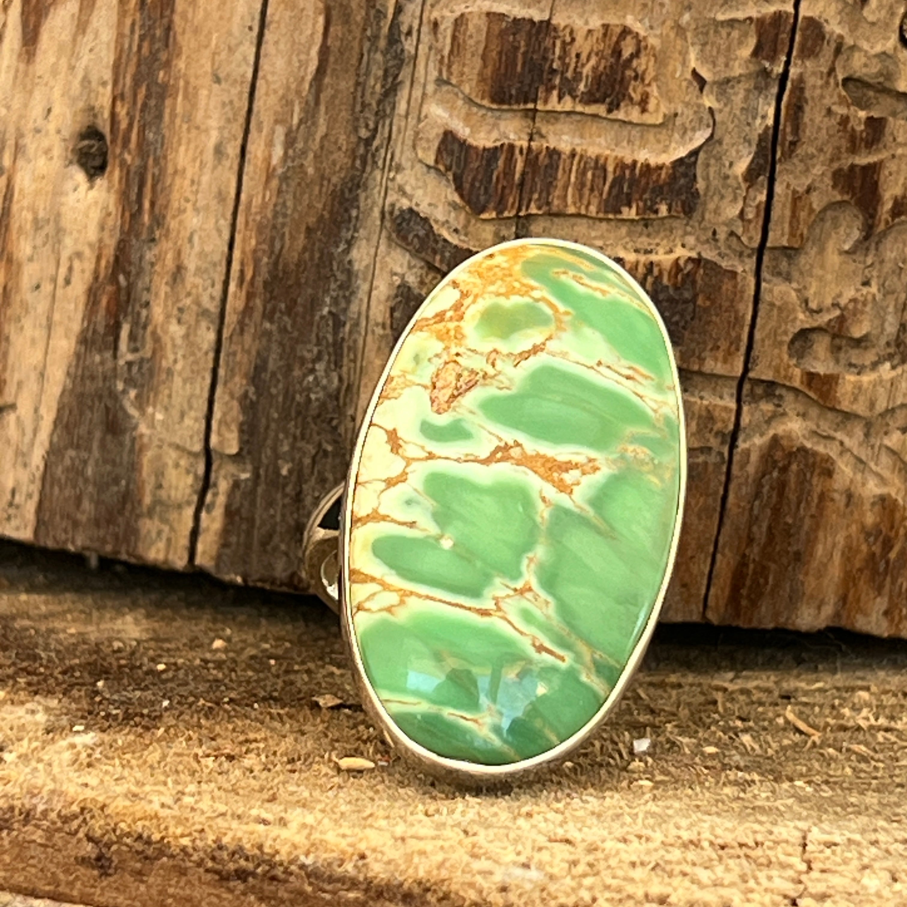 Dieser einzigartige Ring mit Variscit zeigt die grausame Schönheit der Natur in einem intensiven grünen und goldenen Tanz, der an die Wurzeln der Erde erinnert. Sein ovaler heller Stein erinnert nach dem Regen und der reinen Energie der Anfänge an den Frieden einer Ecke des Waldes.