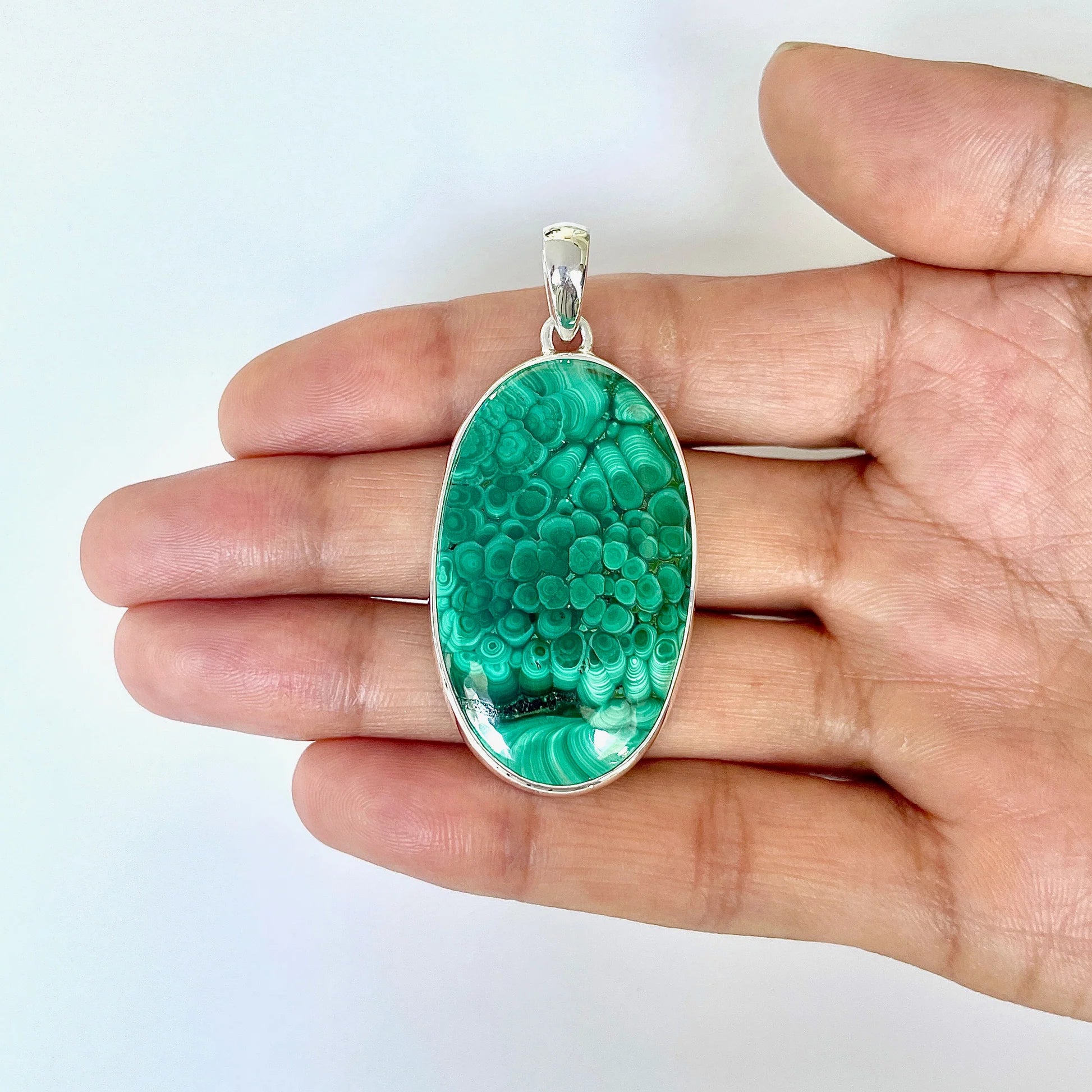 Dieser massive Anhänger von Naturalachit Und 925 Silber Es ist bekannt für seine intensiven grünen und spektakulären kreisförmigen Modelle, die für dieses Mineral spezifisch sind. Der Stein, der im Cabochon -Stil geschliffen wurde, wird durch eine einfache silberne Halterung hervorgehoben, die seine natürliche Schönheit bewahrt.