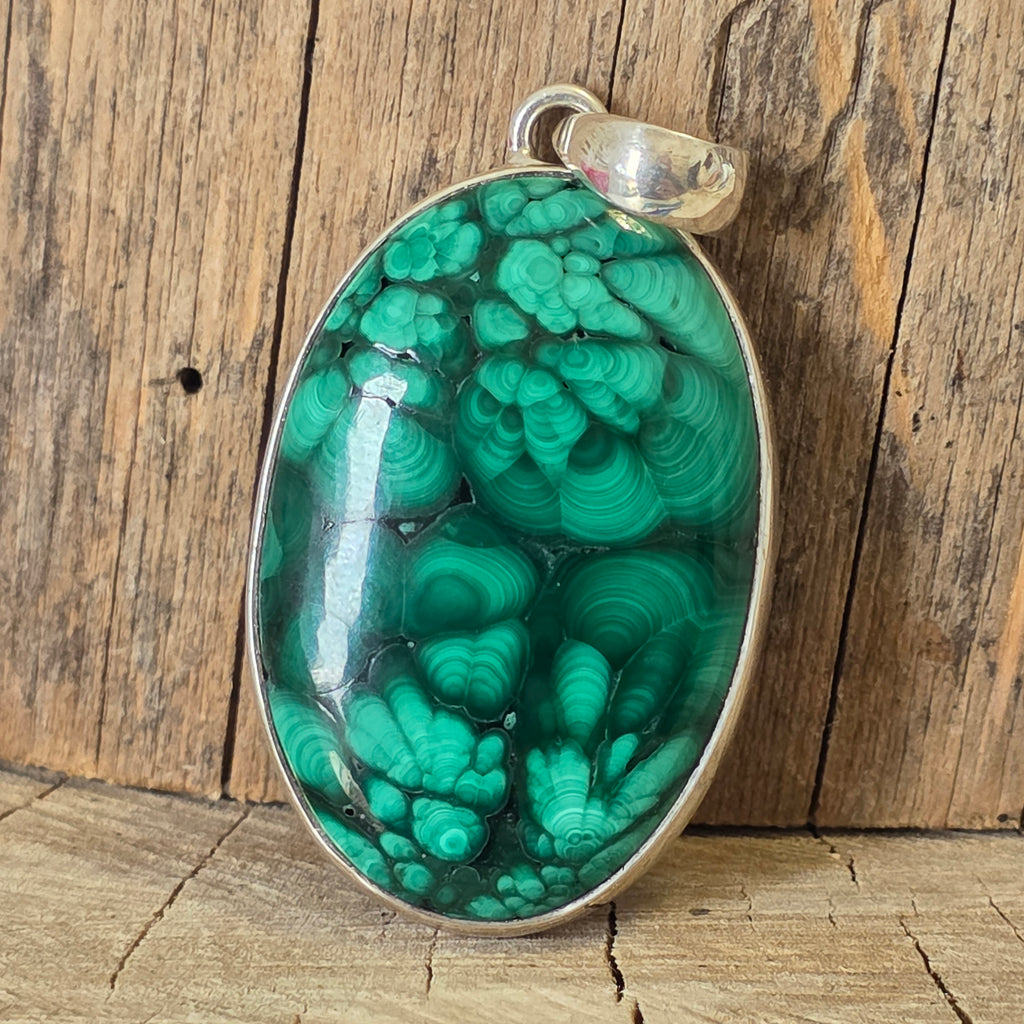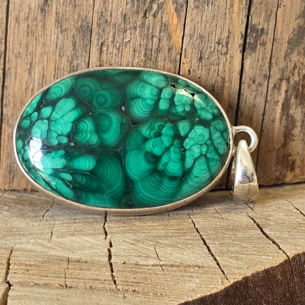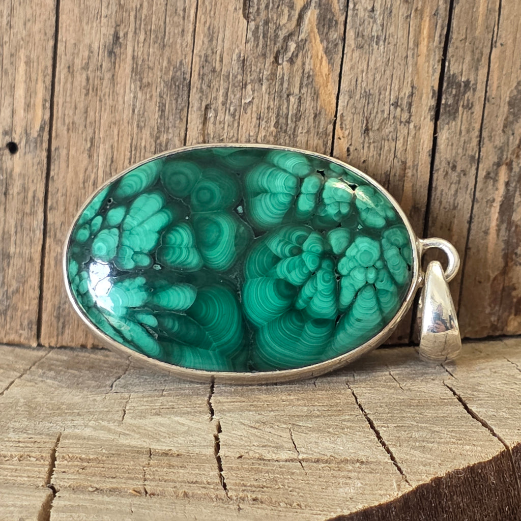 Dieser massive Anhänger von Naturalachit Und 925 Silber Es ist bekannt für seine intensiven grünen und spektakulären kreisförmigen Modelle, die für dieses Mineral spezifisch sind. Der Stein, der im Cabochon -Stil geschliffen wurde, wird durch eine einfache silberne Halterung hervorgehoben, die seine natürliche Schönheit bewahrt.