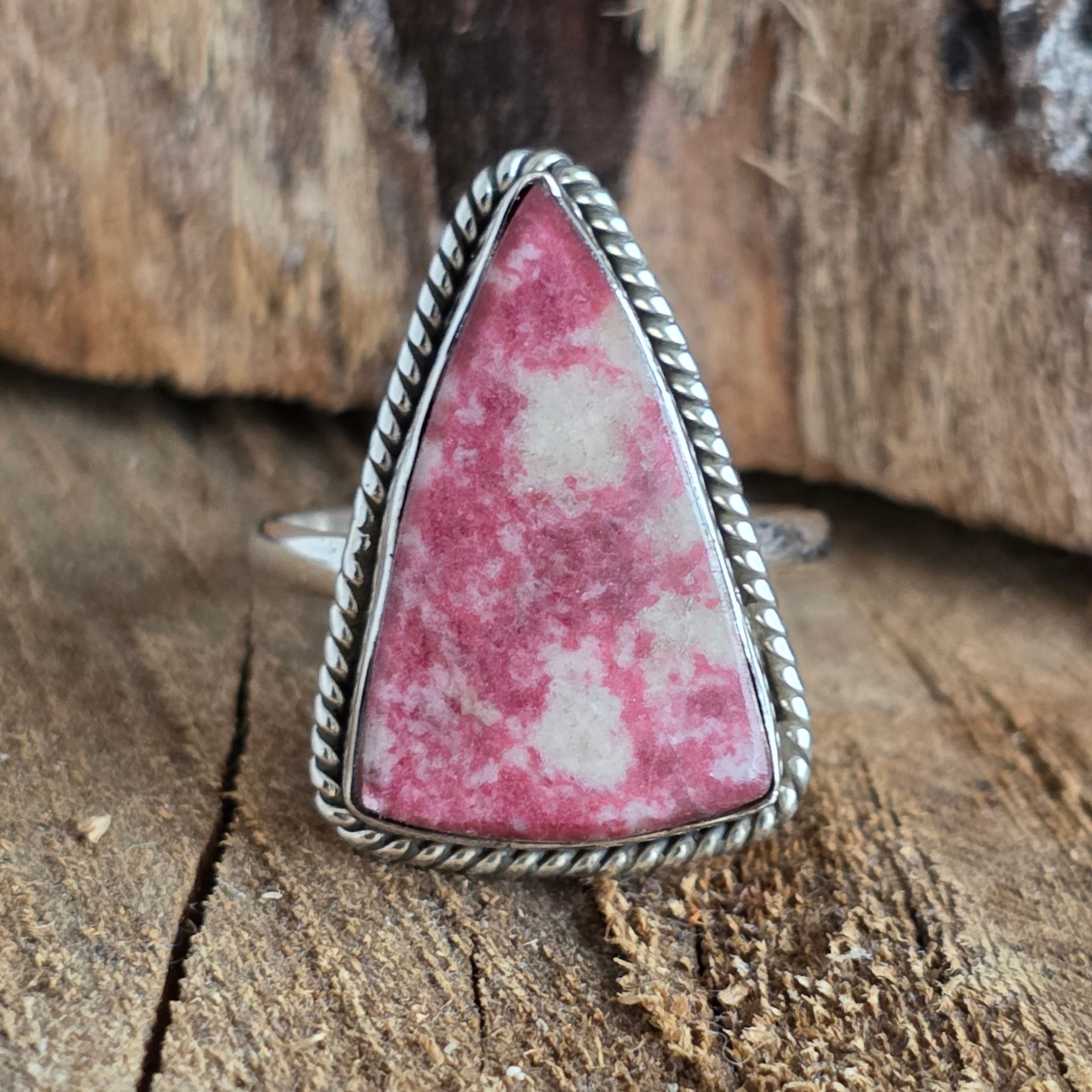 Ein 925er Silberring, der die Energie der nordischen Erde in sich trägt – Die Tulit, eine Zoisit-Rosa-Sorte mit natürlicher Textur und subtilen Farbvariationen zwischen Lachsrosa, Fuchsia und Kreideweiß.