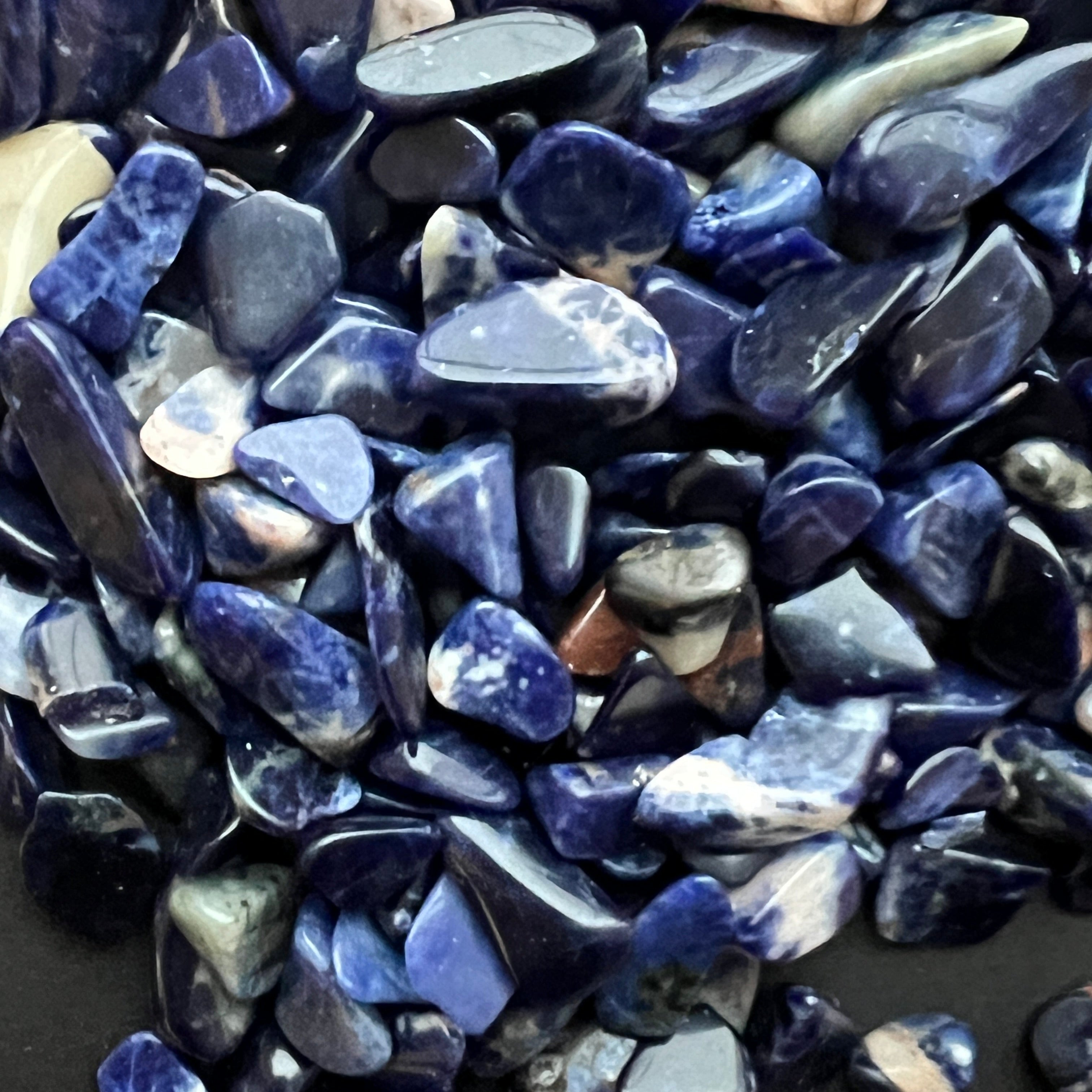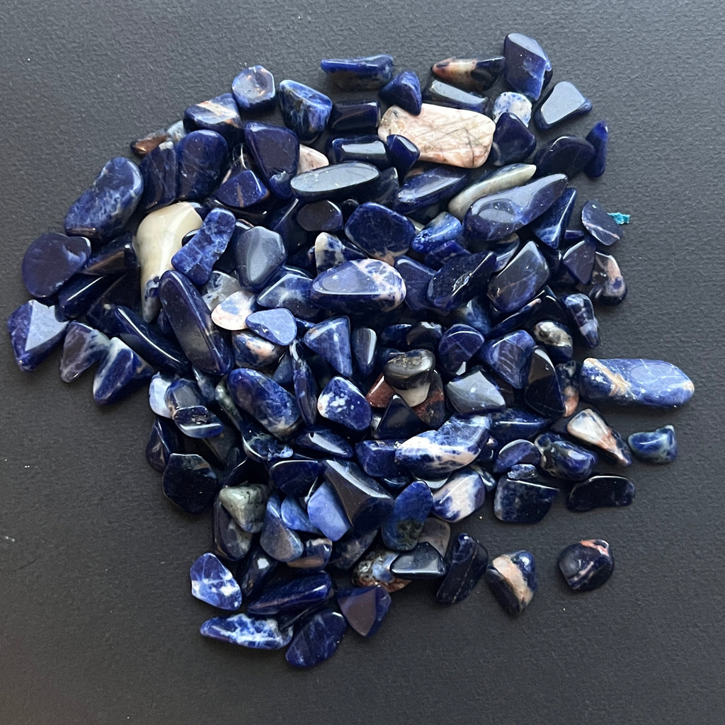 Sodalitul din Namibia este cunoscut pentru albastrul său profund, pigmentat, străbătut de vene albe de calcit care creează un contrast spectaculos. În forma de chipsuri, aceste fragmente mici și naturale păstrează caracterul autentic al pietrei: unele bucăți sunt intens albastre, altele mai deschise, iar unele prezintă zone albe sau chiar reflexe ușor violet, specifice materialului de calitate din sudul Africii.