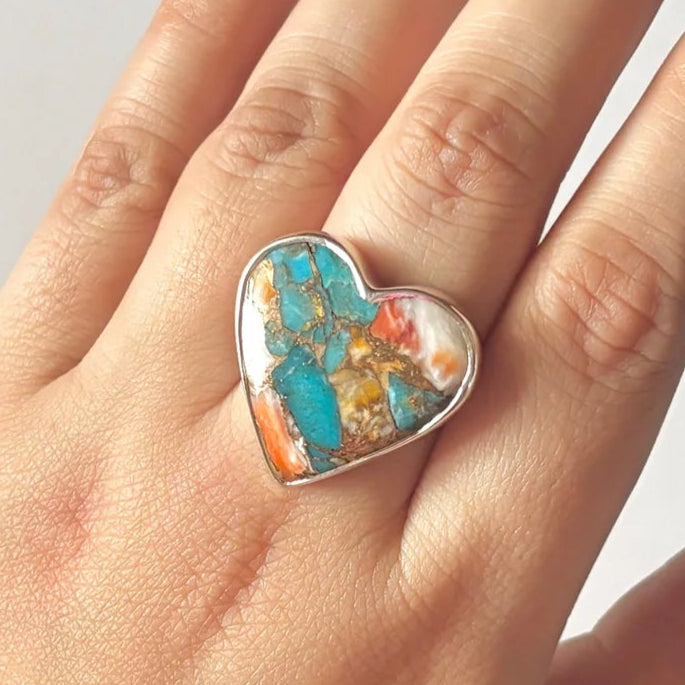 Dieser lebendige Ring aus 925 Silber und geschmückt mit einem zusammengesetzten Stein von Stachelige Auster und Türkis, in Form von Marquise (Katzenaugen/Navette) geschnitten, ist ein einzigartiges Stück, das den Look durch ihre spektakuläre Farbpalette anzieht: intensive orange, blau-turkase und weiß.