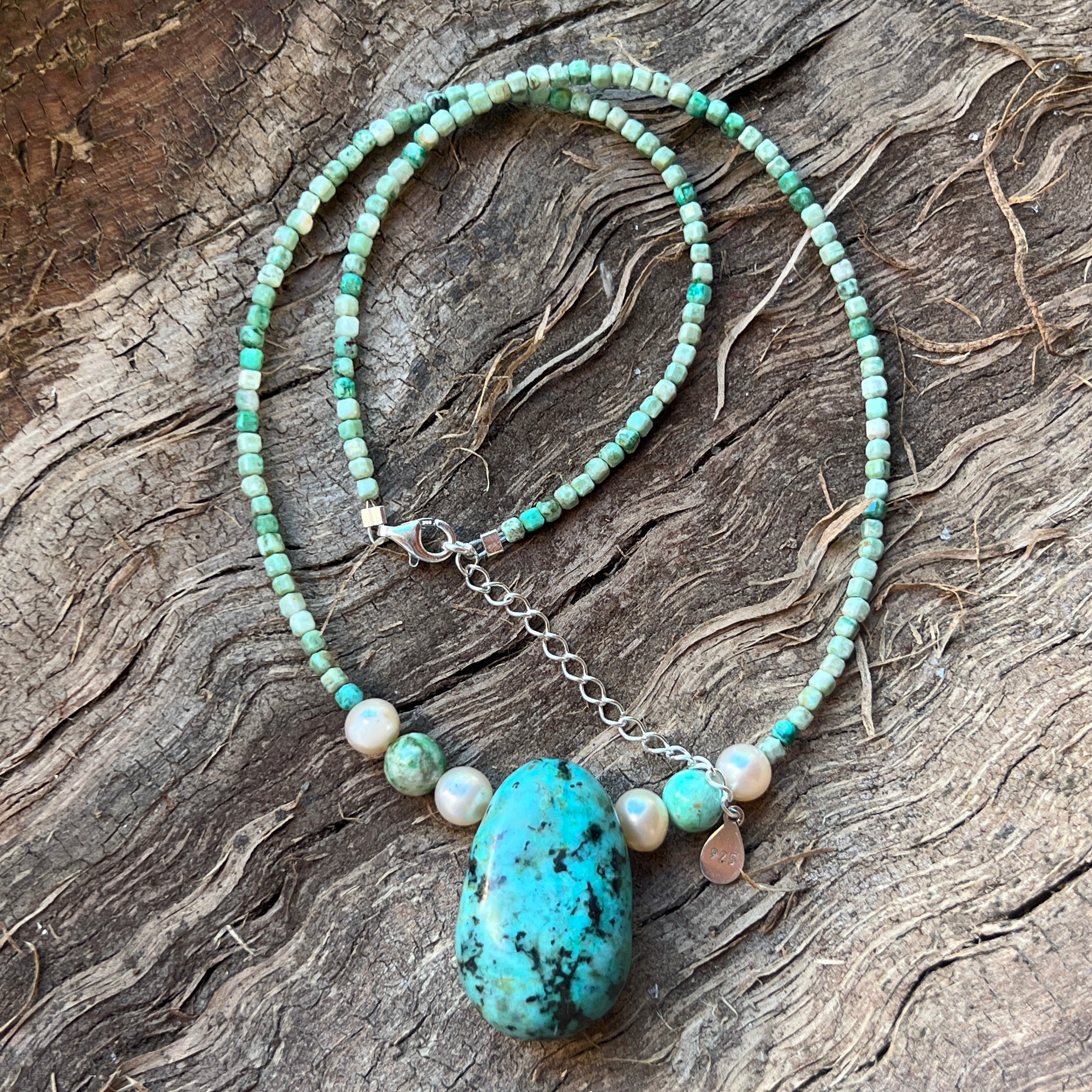 Der Türkis ist bekannt für seine Schutzergie, für den Mut und die aufrichtige Kommunikation, die es unterstützt. Die Perlen in ihrer ewigen Sanftmut erinnern die tiefe Weiblichkeit, die Harmonie und die subtile Weisheit, die aus Frieden geboren wird.