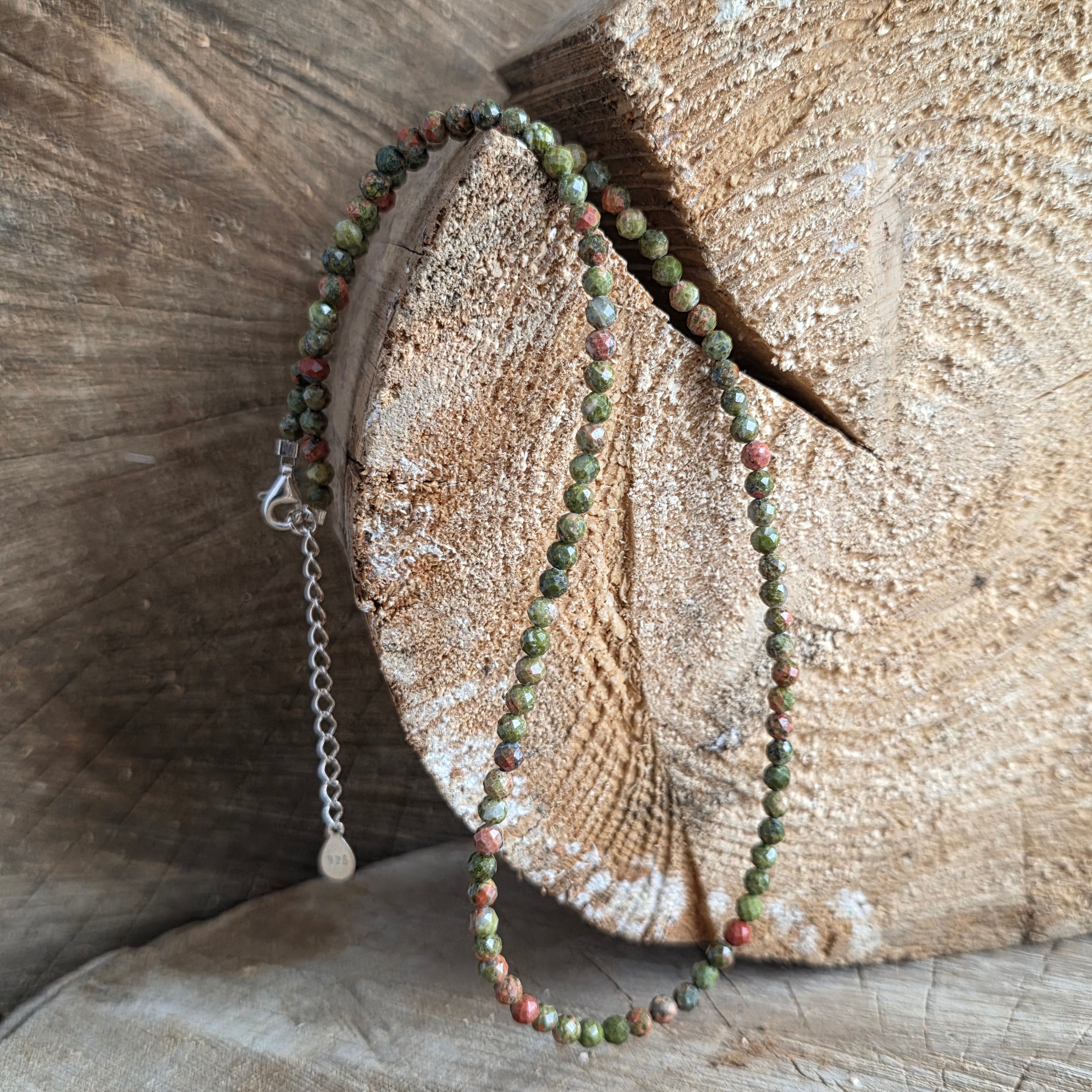 Eine Halskette mit der Seele lebendiger Erde – warm, ausgewogen und sanft. Die facettierten Unakit-Perlen von 4 mm verbinden Moosgrün- und Terrakotta-Rosatöne, wie eine herbstliche Landschaft, eingefangen in einem Schmuckstück.