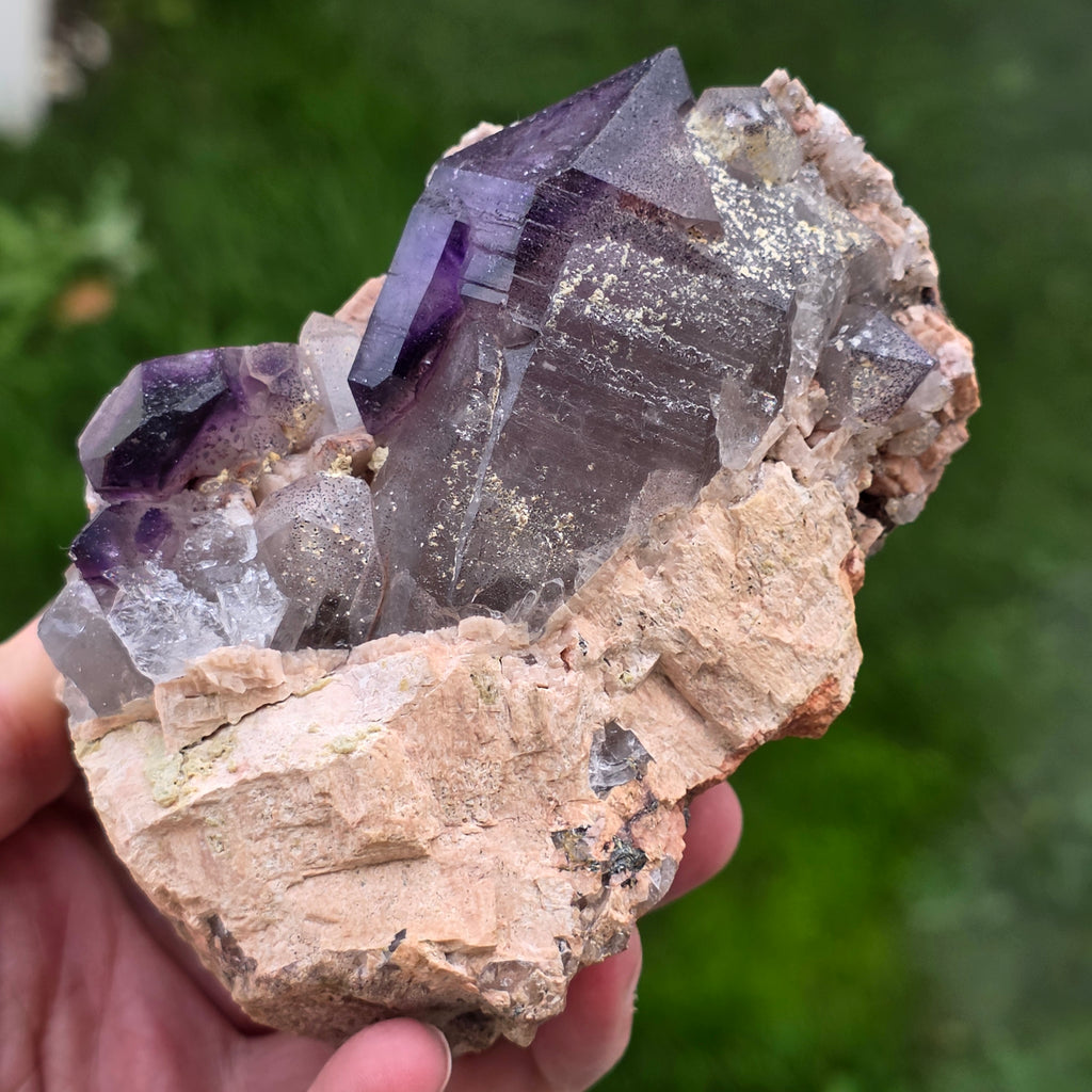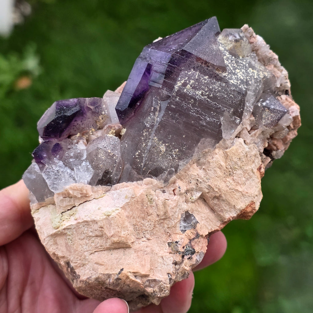 Născut în inima masivului Brandberg din vestul Namibiei, acest ametist unic provine dintr-una dintre cele mai remarcabile zone geologice ale Africii. Munții Brandberg, un corp plutonic format în urmă cu peste 130 de milioane de ani, ascund geode rare unde cristalele de cuarț au crescut în condiții hidrotermale excepționale. Rezultatul este un ametist de o frumusețe rară, ce îmbină nuanțe intense de violet cu zone de cuarț clar sau fumuriu, totul într-un singur cristal.