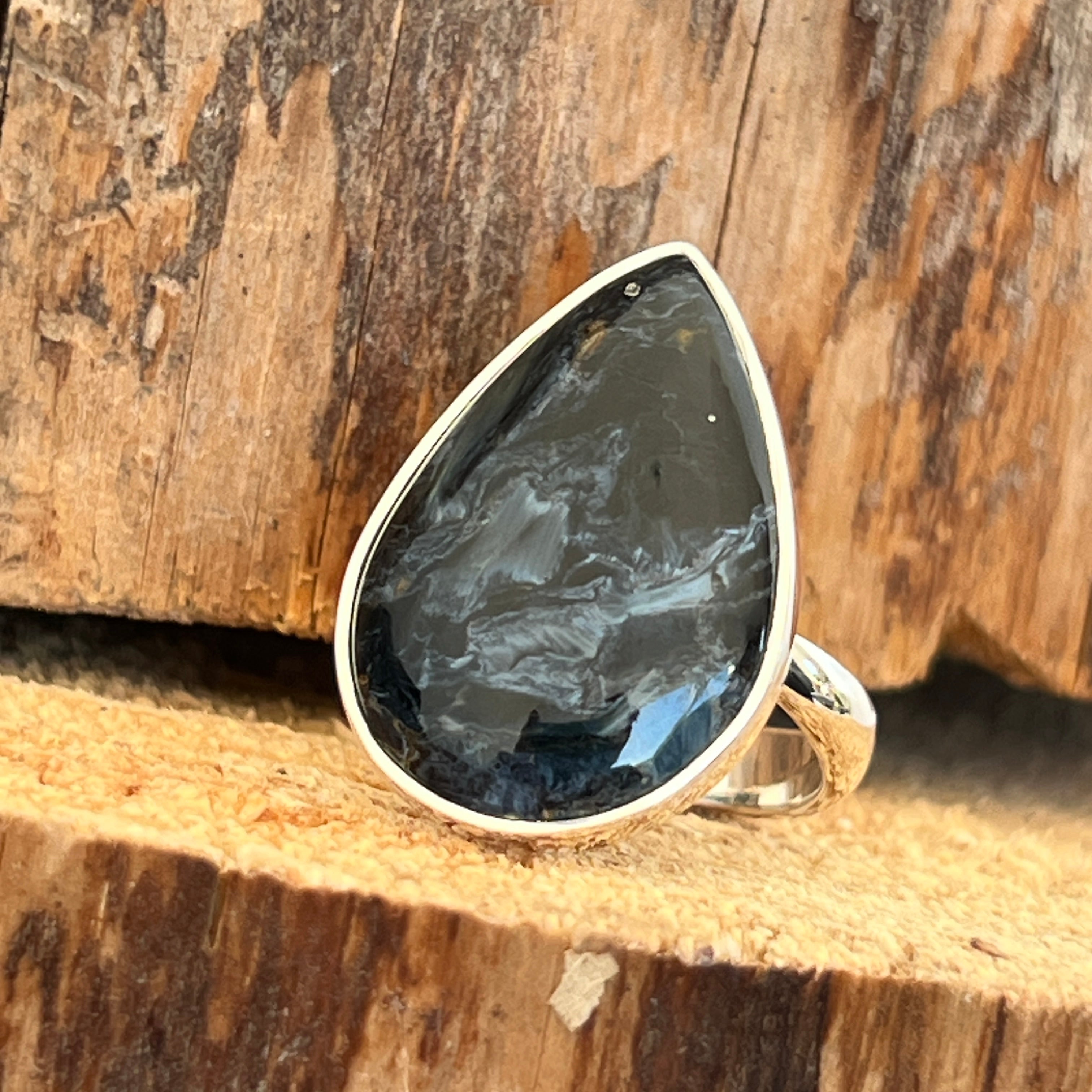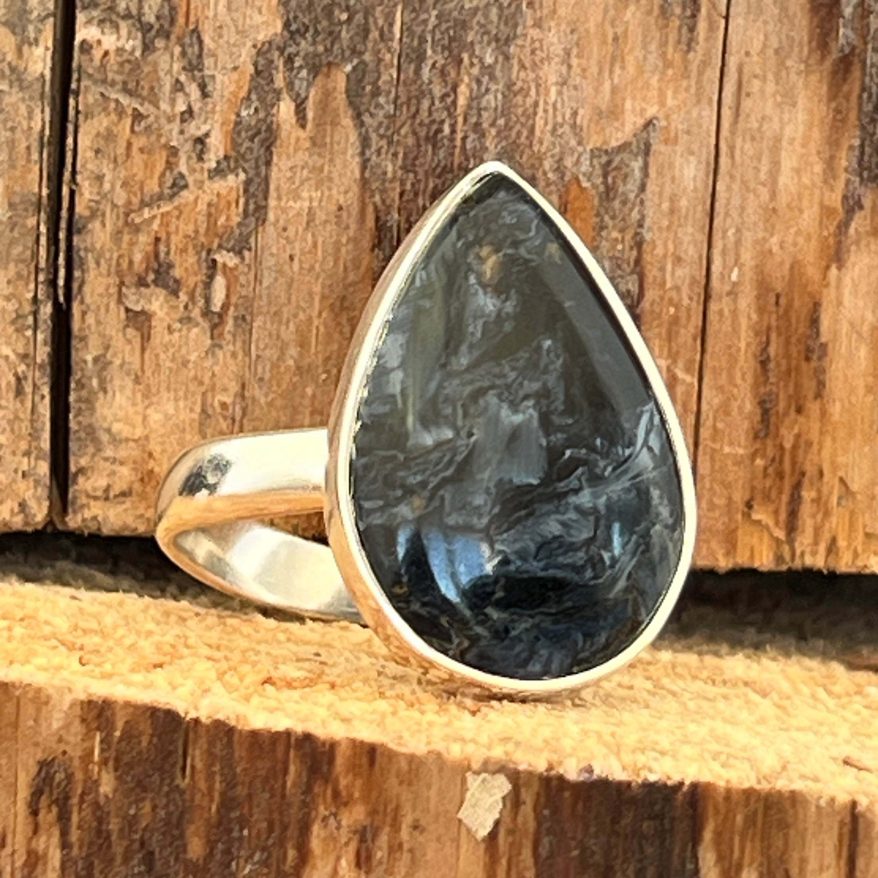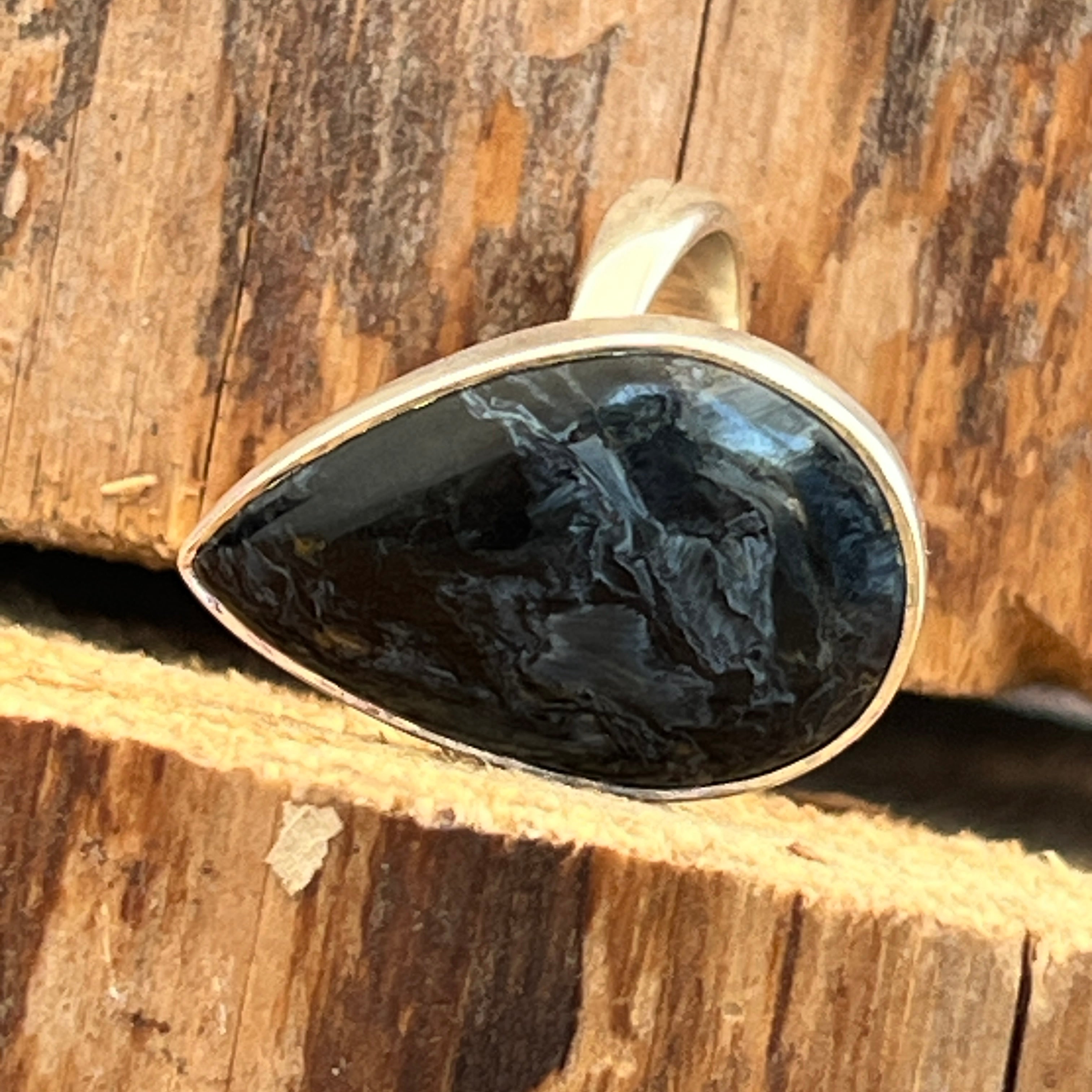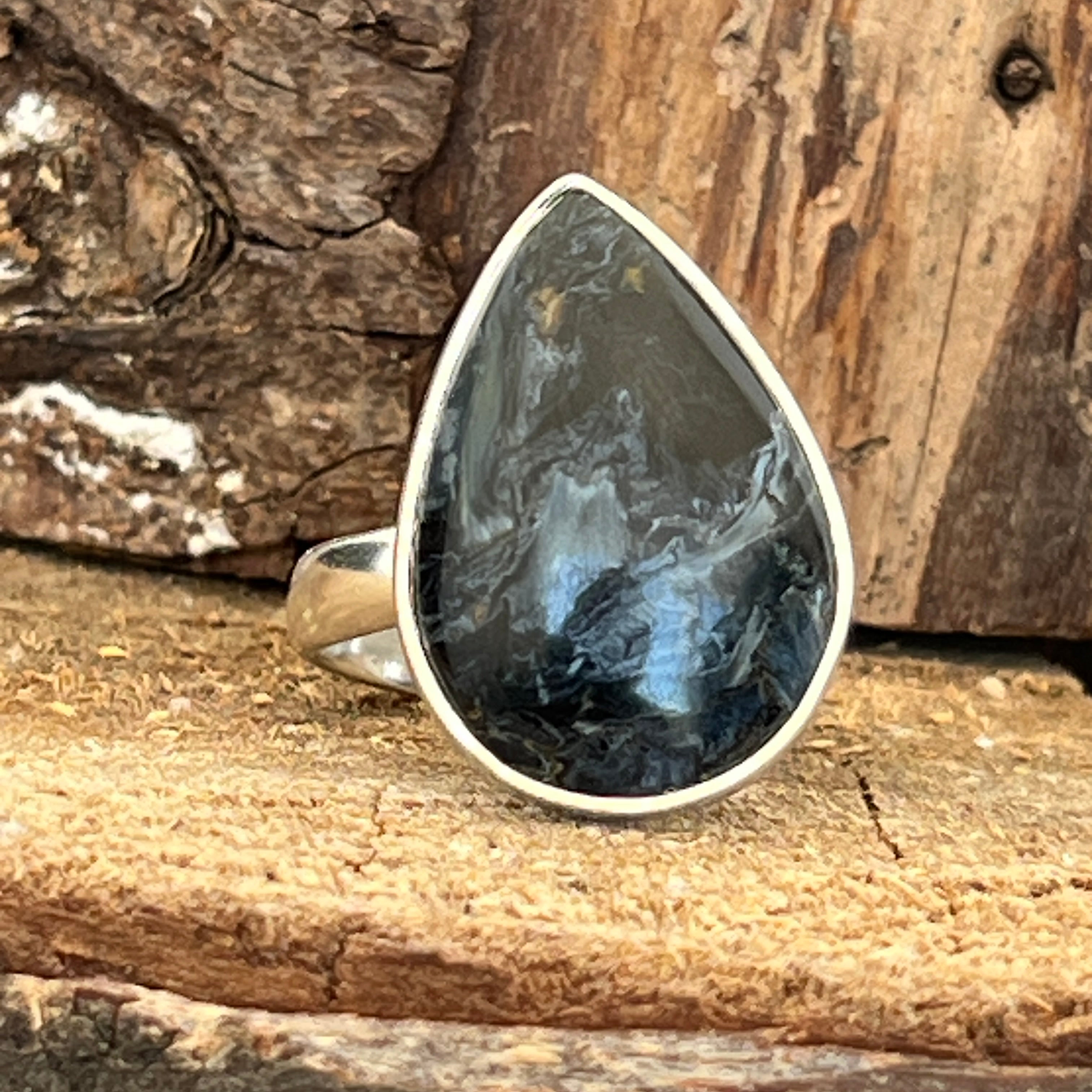 Dieser beeindruckende Ring aus 925 Silber, ist mit einem Cabochon von geschmückt natürlicher Markt in Form von Tropfen. Die Textur des Steins zeigt tiefe Blau-, Schwarz- und Goldreflextöne, die an den Wirbelwind erinnern, der am Nachthimmel beobachtet wird.