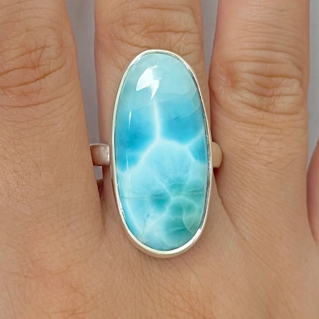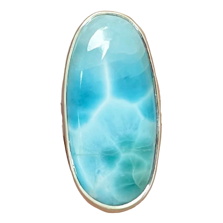 Ein einzigartiger Ring mit Larimar, der sich selbst trägt Die Tiefe und Ruhe des Ozeans. Sein durchscheinendes Blau, bestreut mit offenen Reflexen, erinnert an die tropischen Wellen, die reibungslos am Ufer brechen.