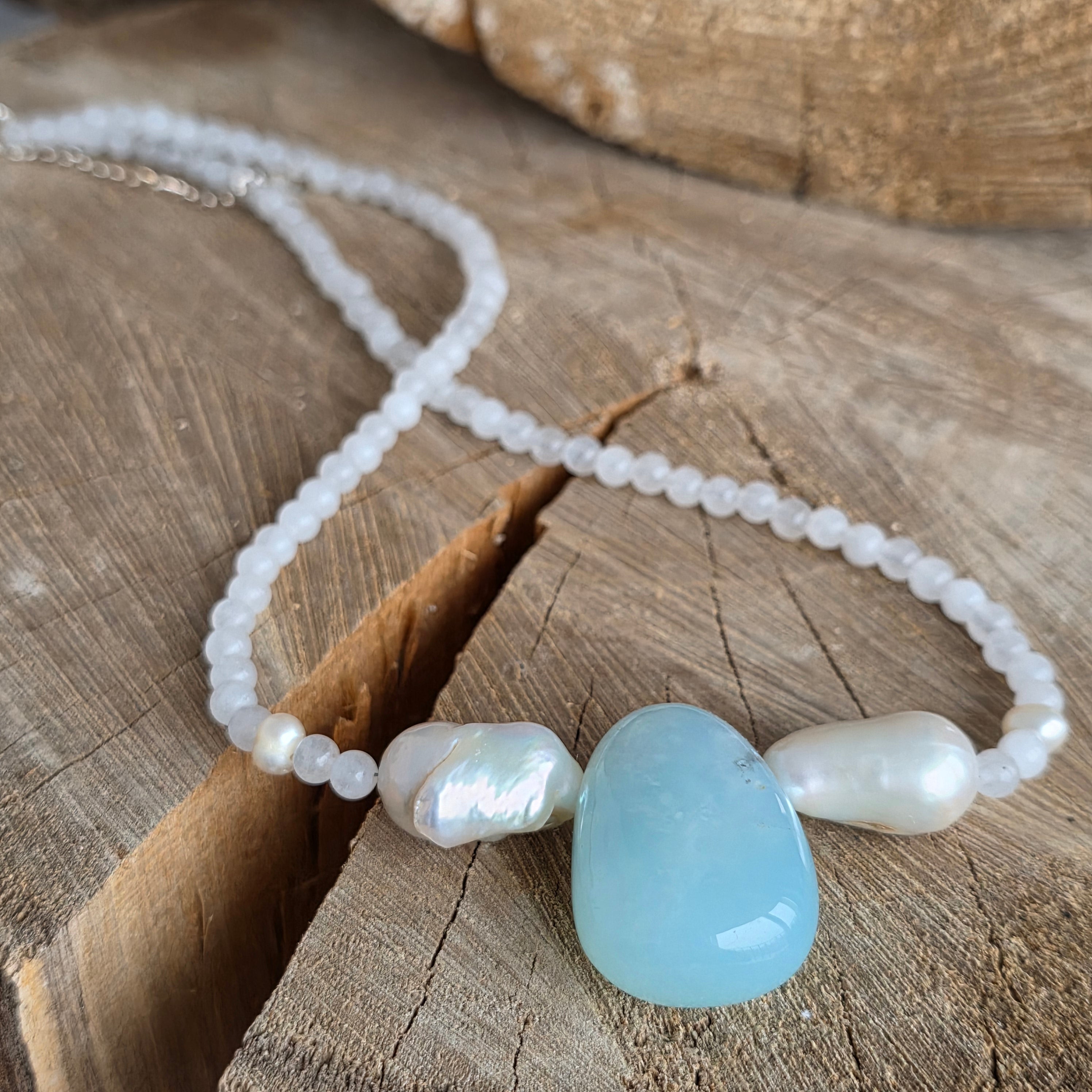 Weiße Jade unterstützt mentale Frieden, emotionale Reinigung und Seelenklarheit. Die Krisoprase ist der Stein des offenen Herzens, das Selbstvertrauen und die tiefe Heilung. Die Perlen mit ihrer zeitlosen Eleganz fügen eine Gnade, Weiblichkeit und Adel hinzu.