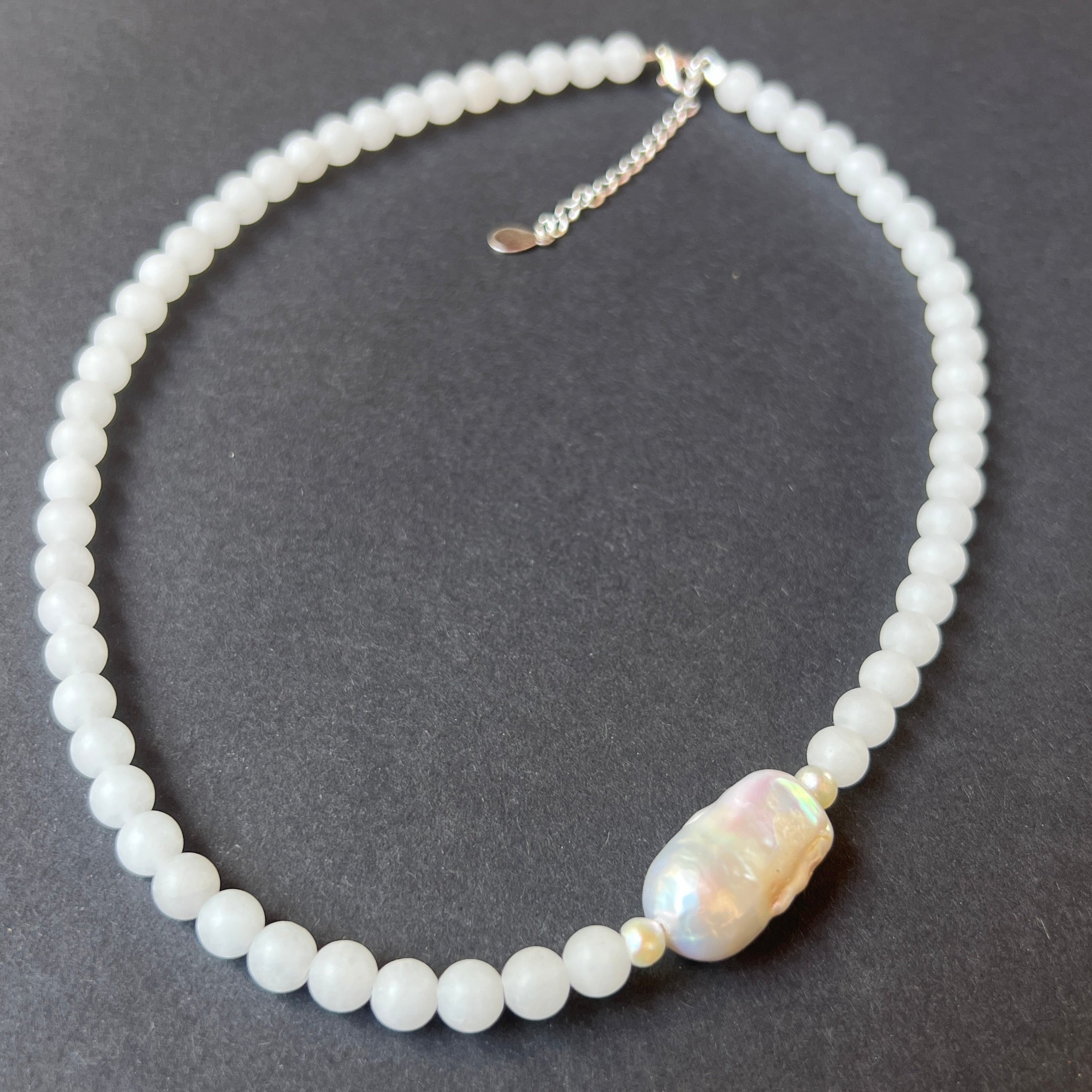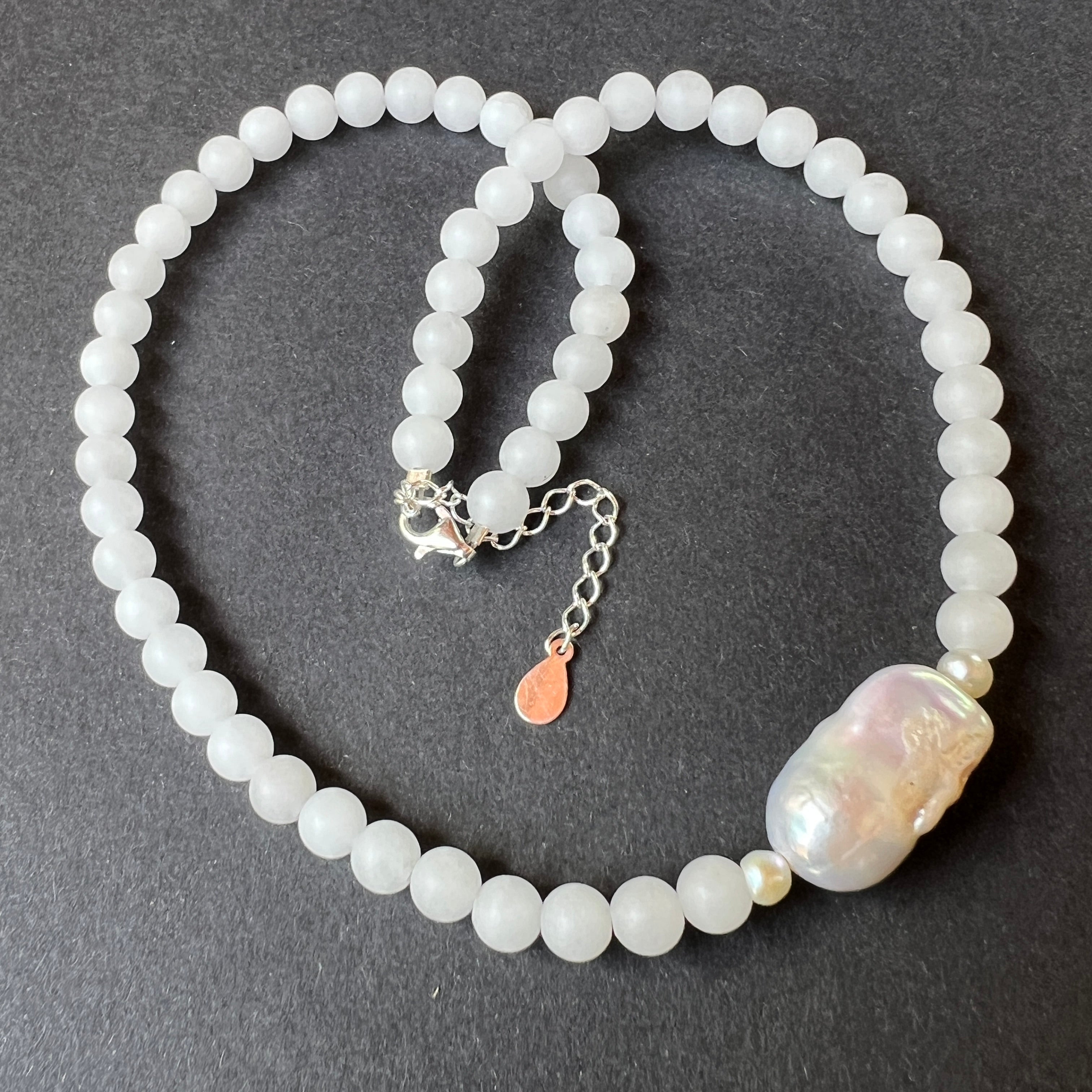 Materialien: Jad White 6 mm, Barockperle 2 cm, Silber 925