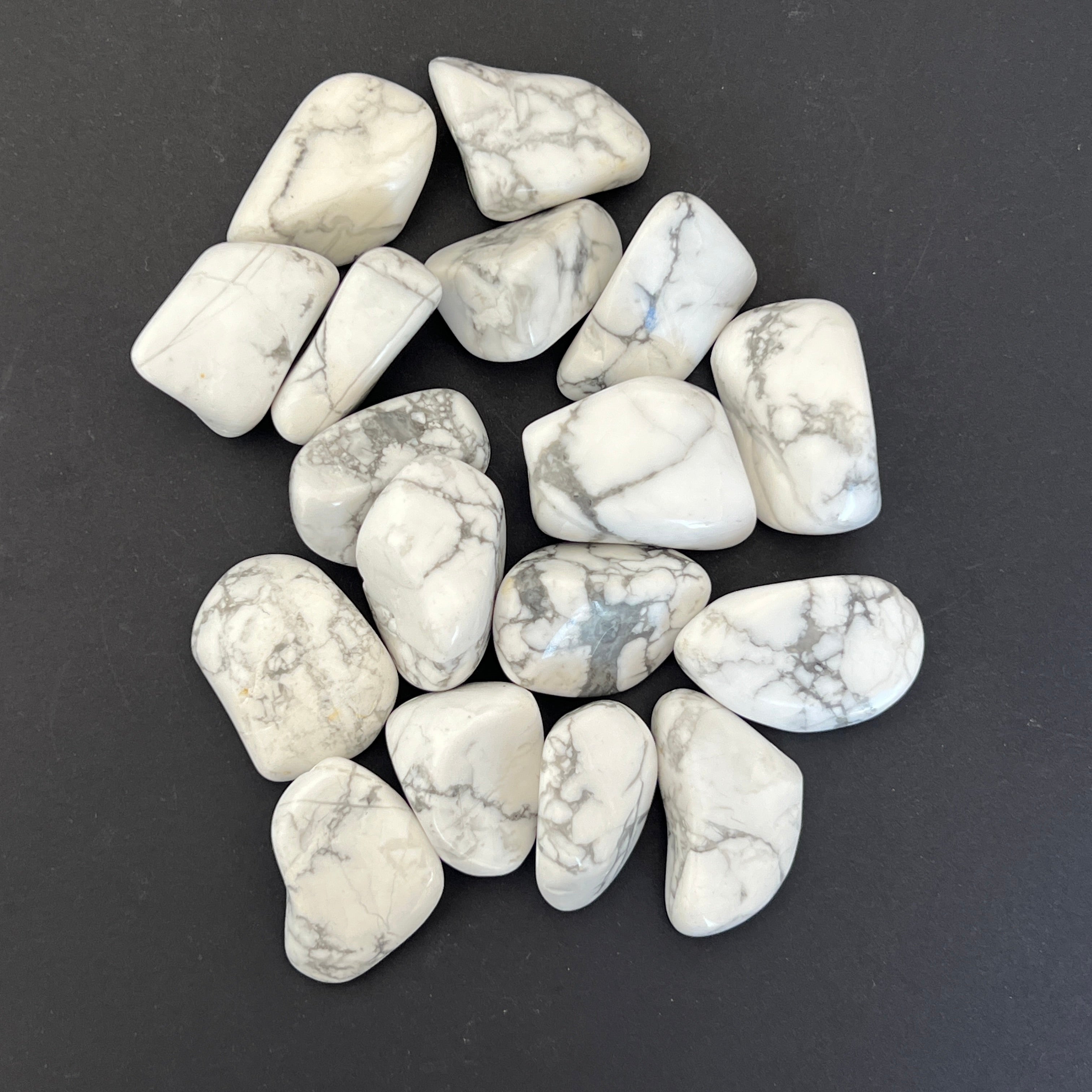 Weißer Howlith Mini Rollstein, Größen zwischen 2 - 3,5 cm. Der Preis unterscheidet sich je nach Größe des Steins, bitte wählen Sie die gewünschte Größe aus.