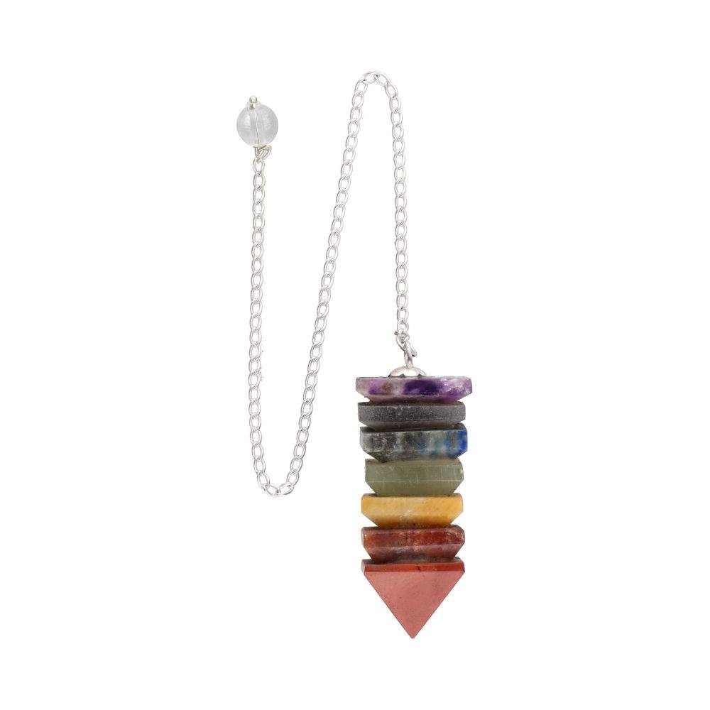 Dieses Modell ist aus mehreren Natursteinen in Schichten hergestellt,dabei ist jede Farbe symbolisch einem der sieben Energiezentren des Körpers (Chakren) zugeordnet.. Üblicherweise enthalten diese Pendel Steine wie Amethyst, Sodalith oder Lapislazuli, grünen Aventurin, gelben Aventurin, roten Jaspis oder andere Minerale mit den entsprechenden Farben der Chakren.
